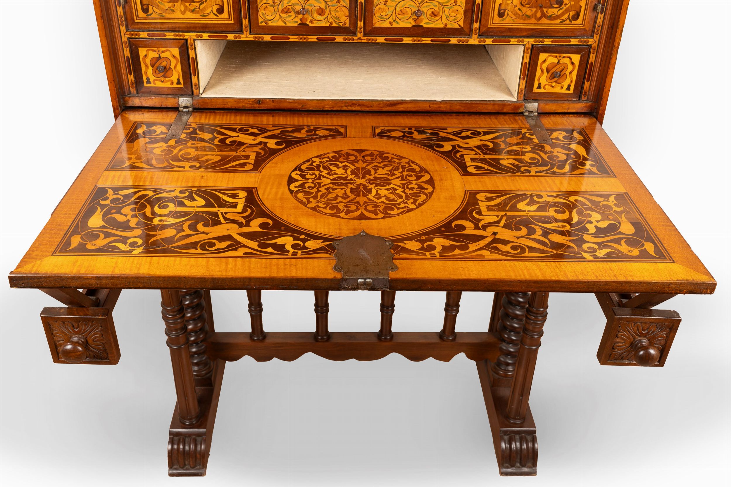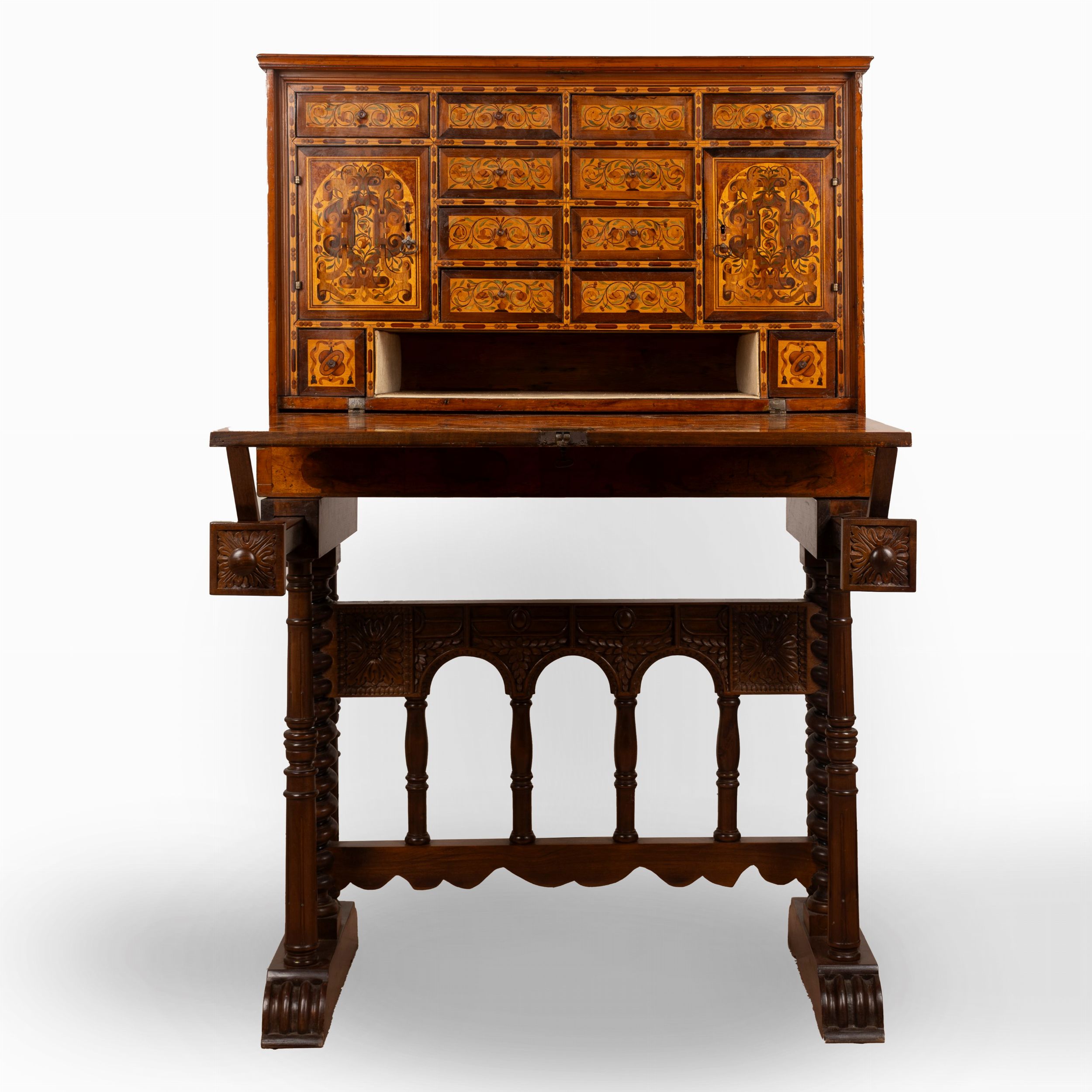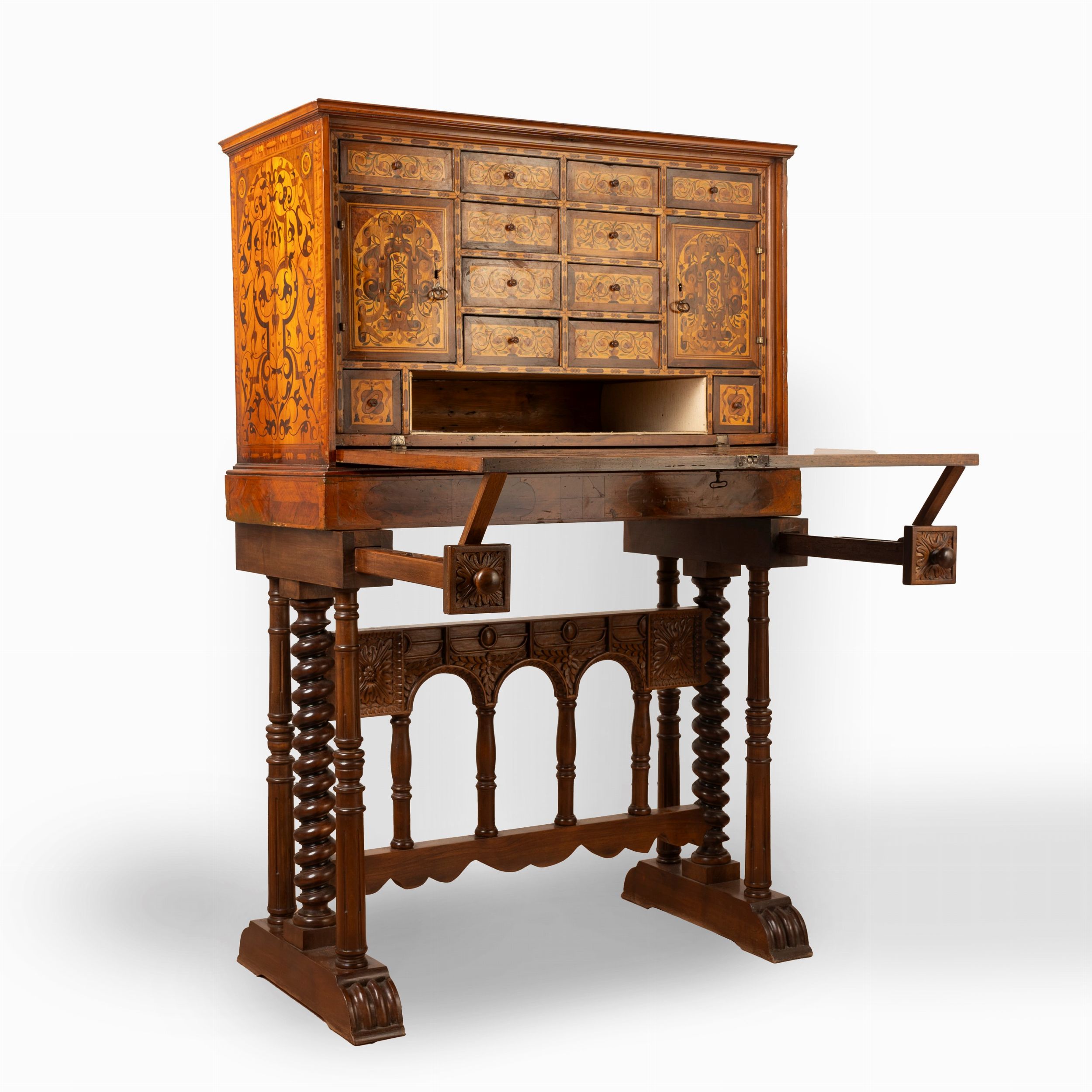 cm 66 x 92 x 43,5 (monetiere); cm 145,5 x 92 x 52,5 (con tavolino) fronte a calatoia con all'interno due sportelli, quattordici cassetti e un vano aperto decori a motivi vegetali, cartigli e volute reca data 1521 su uno degli sportelli interni; reca iscrizione in tedesco sotto uno dei cassetti 'Ristrutturato da [...] a Norimberga' parti restaurate e sostituite, tavolino non coevo