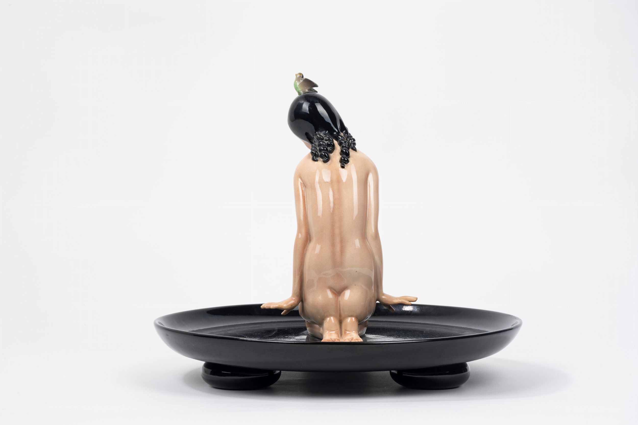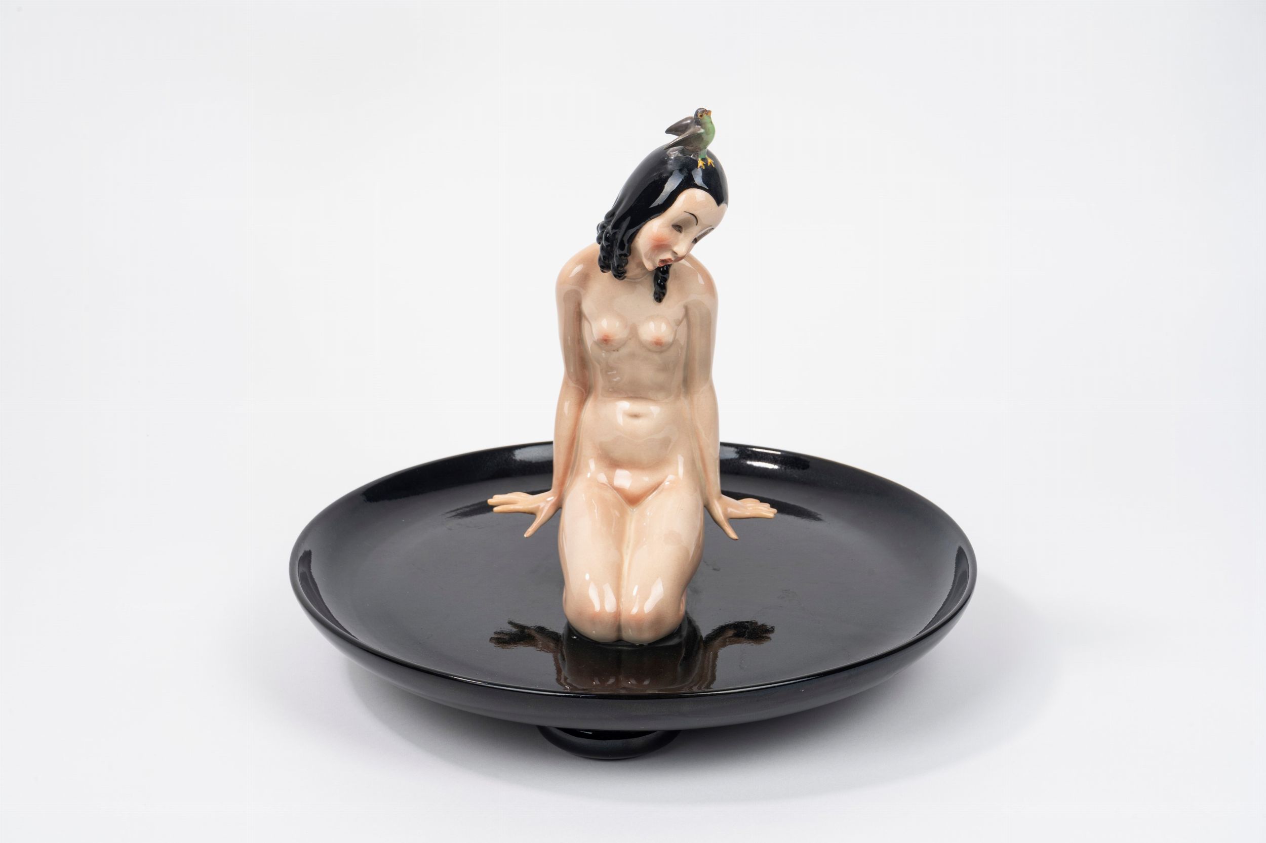 Nudo di donna su piatto con uccellino in testa
