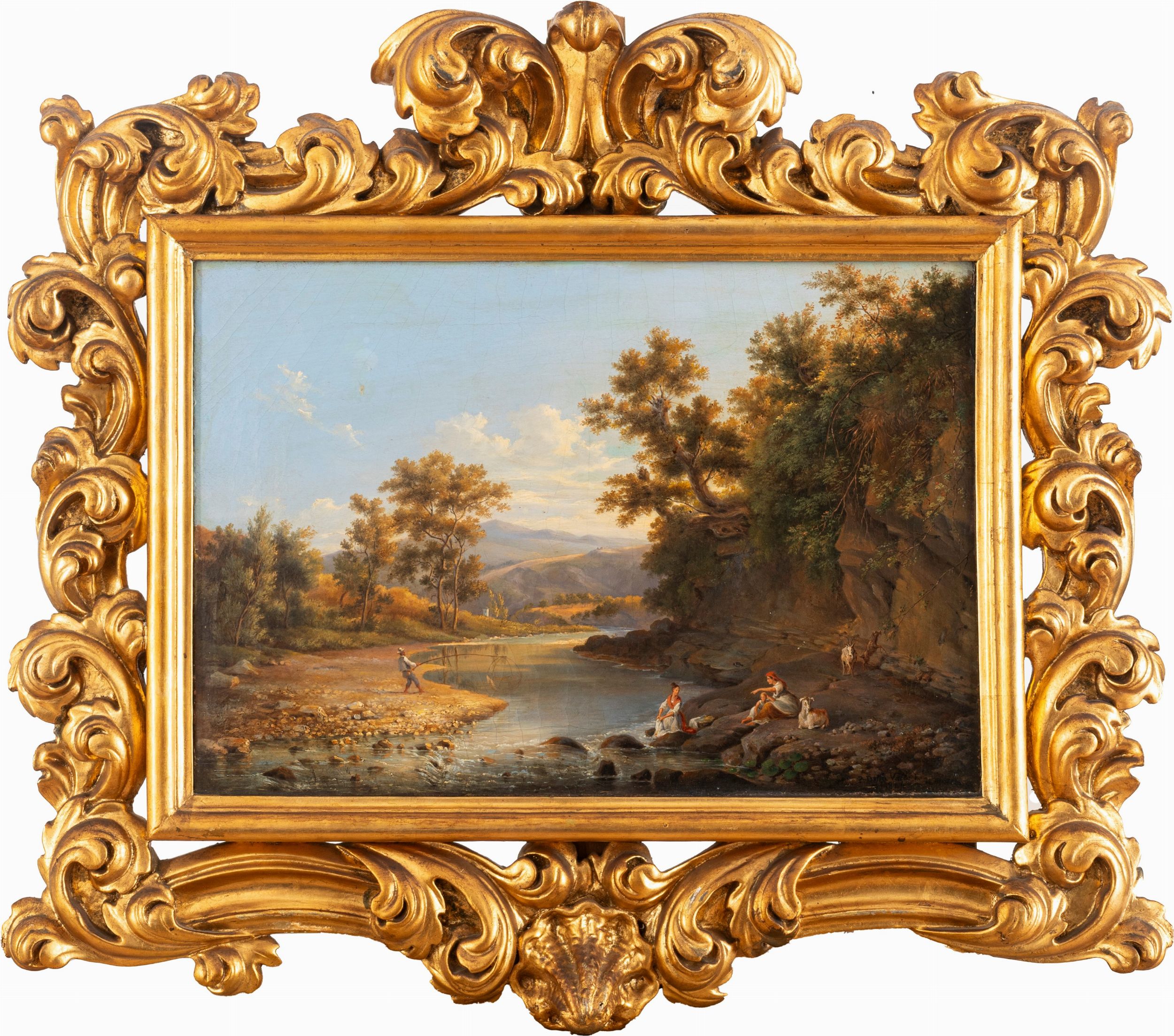 Paesaggio fluviale entro cornice riccamente intagliata e dorata