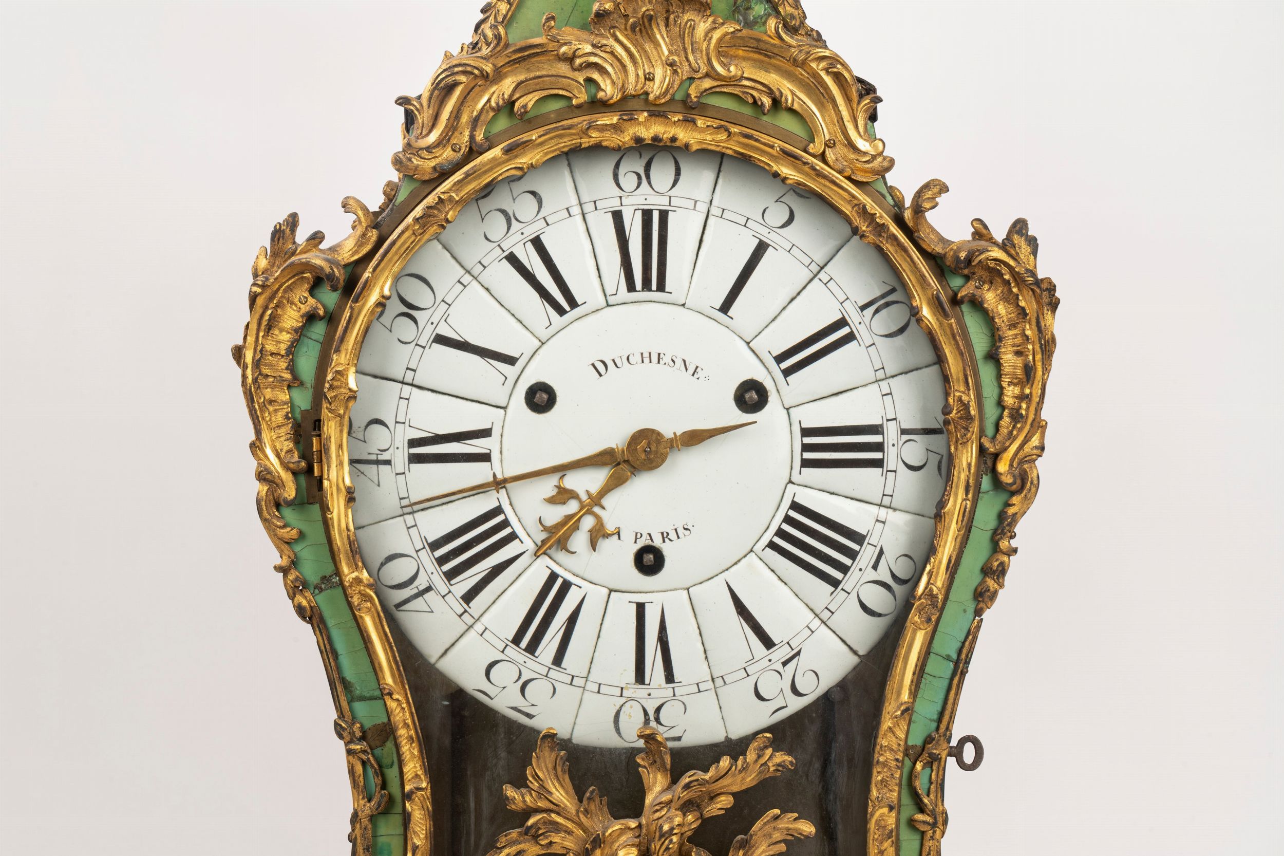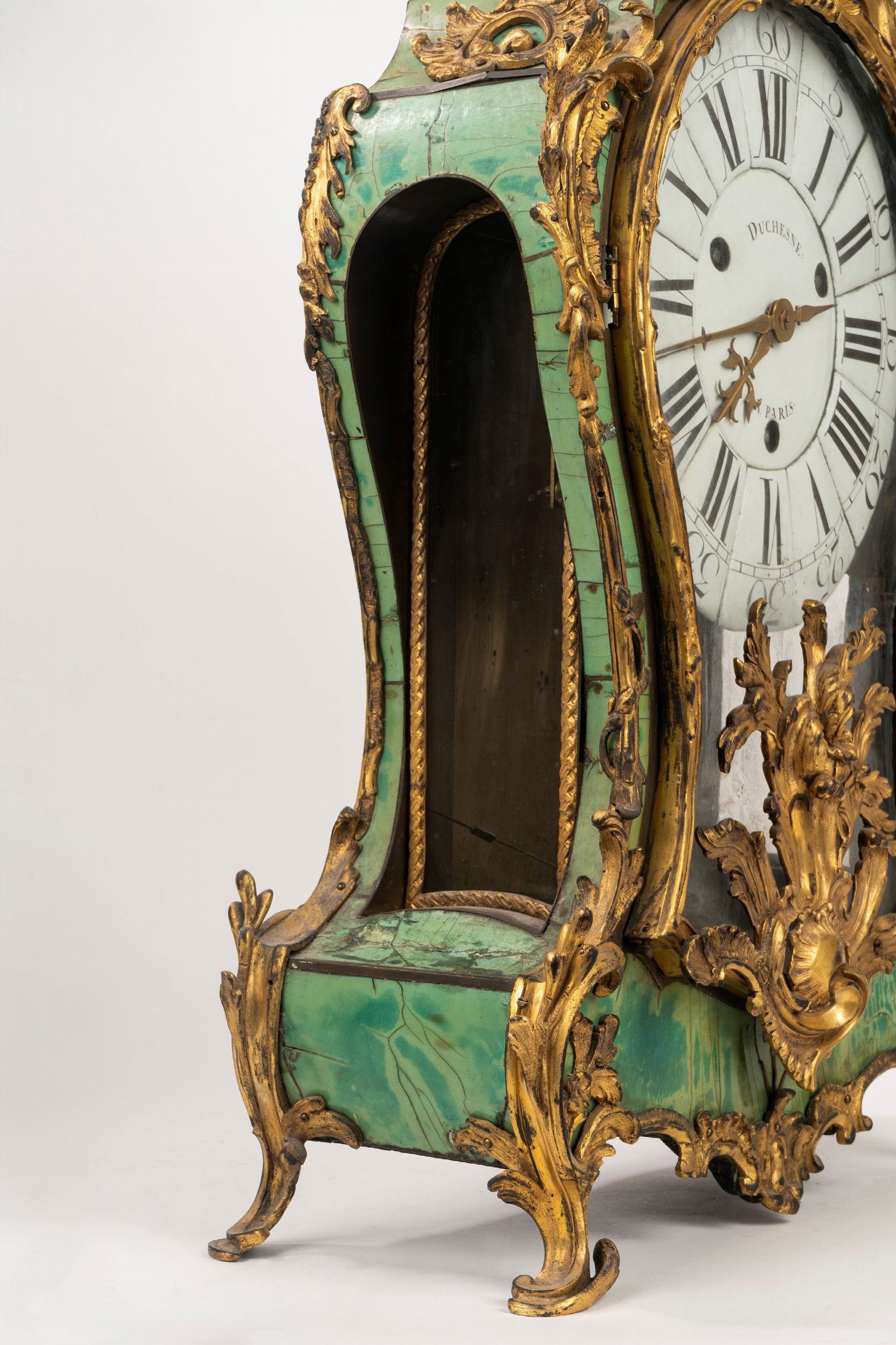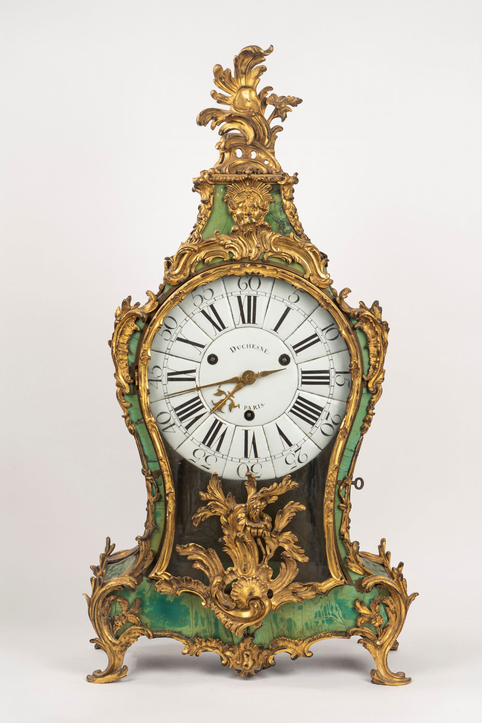 fondo verde con finiture in bronzo dorato, fastigio con elemento a rocaille e mascherone quadrante in porcellana firmato Duchesne a Paris