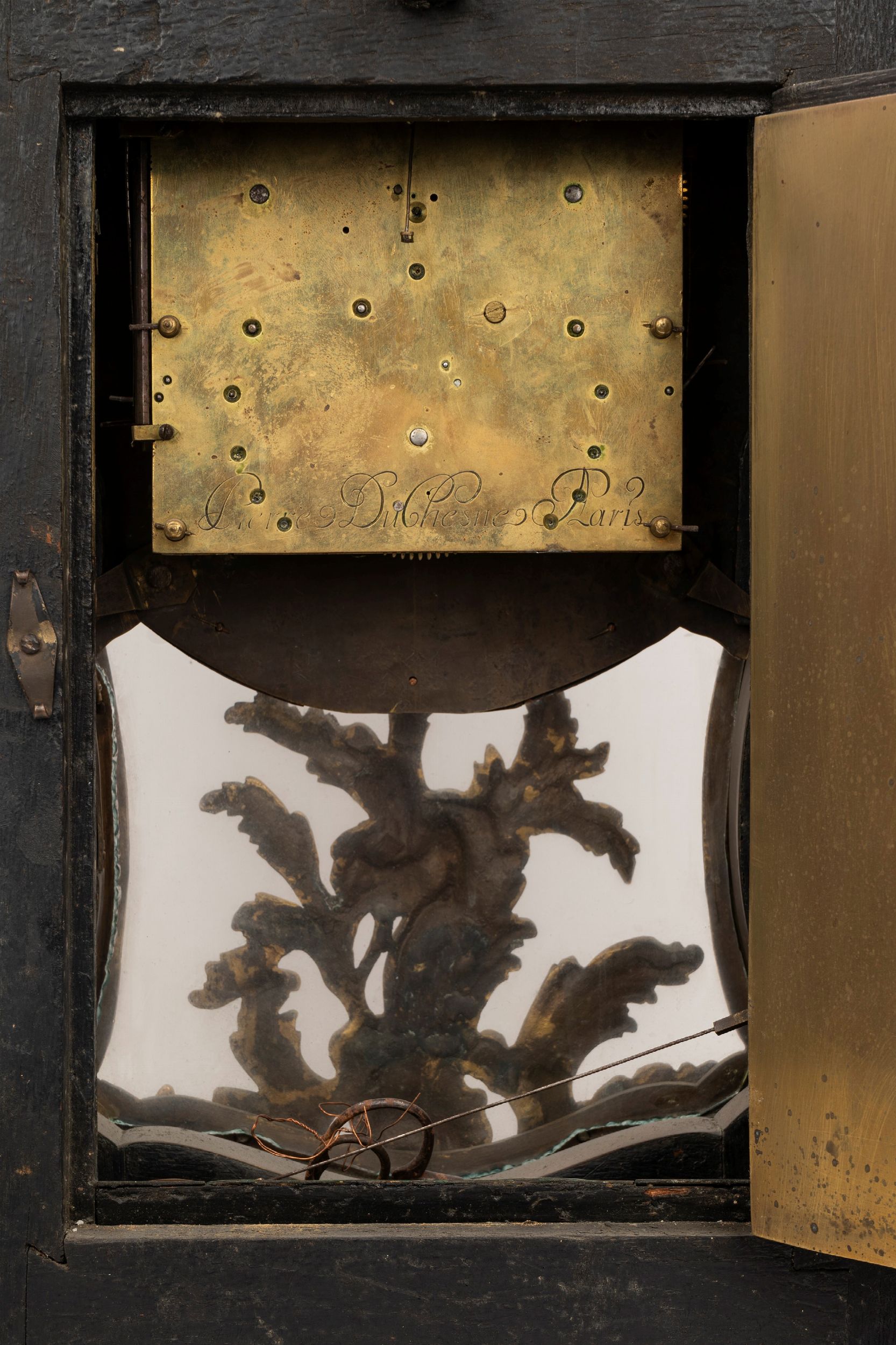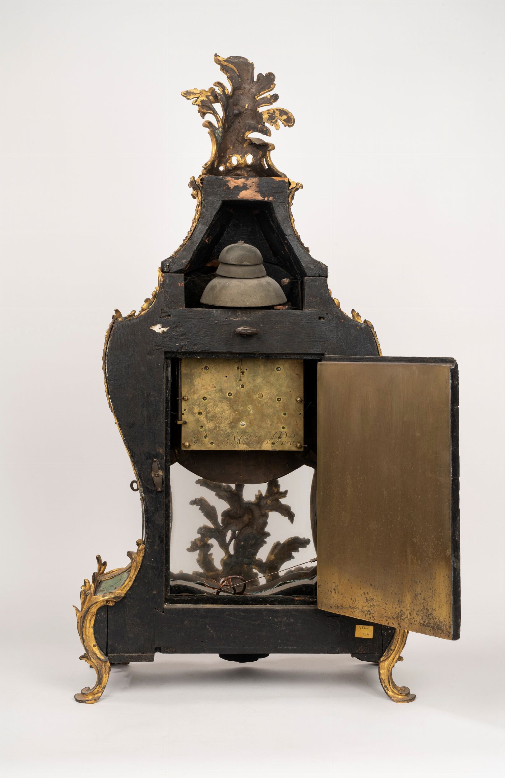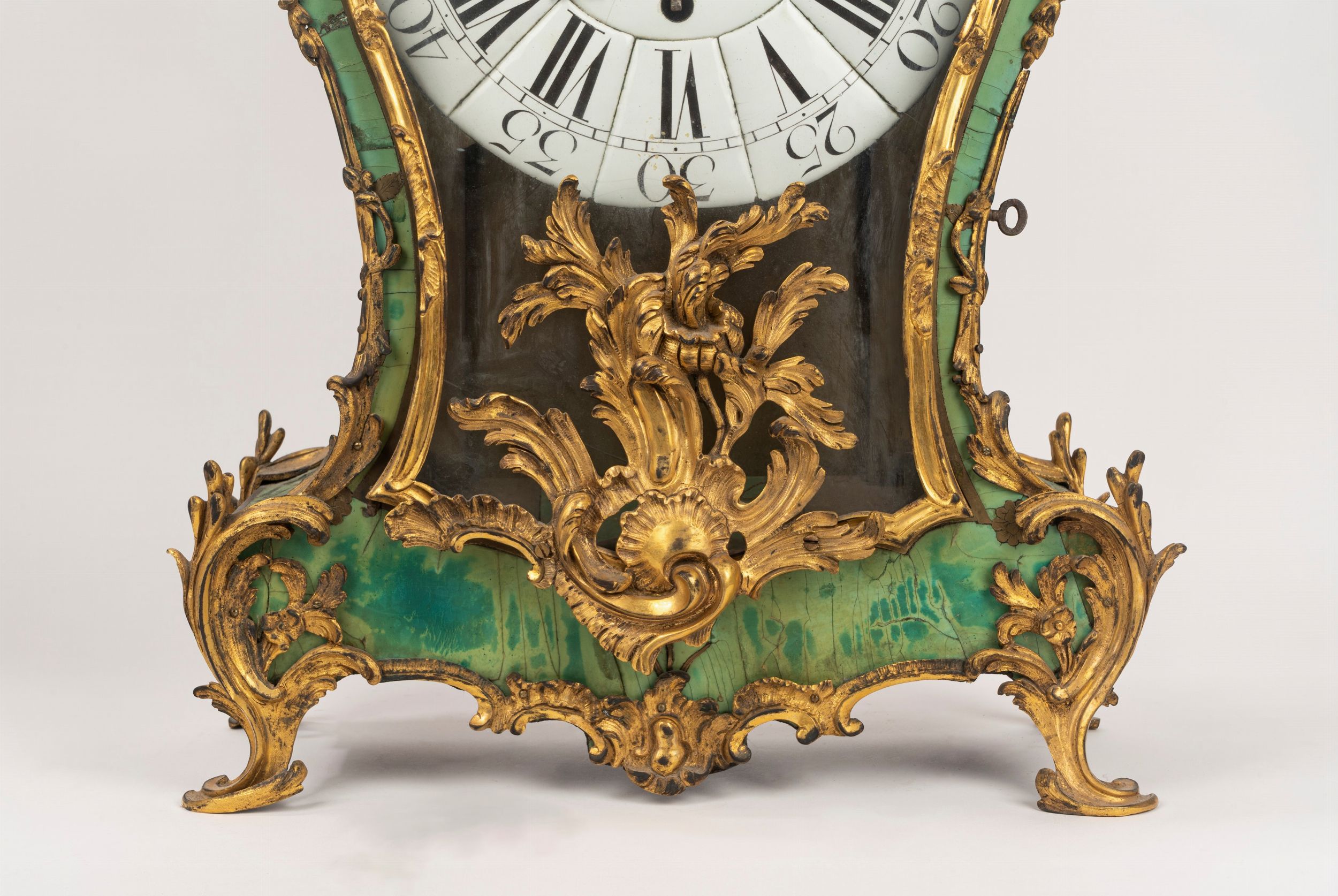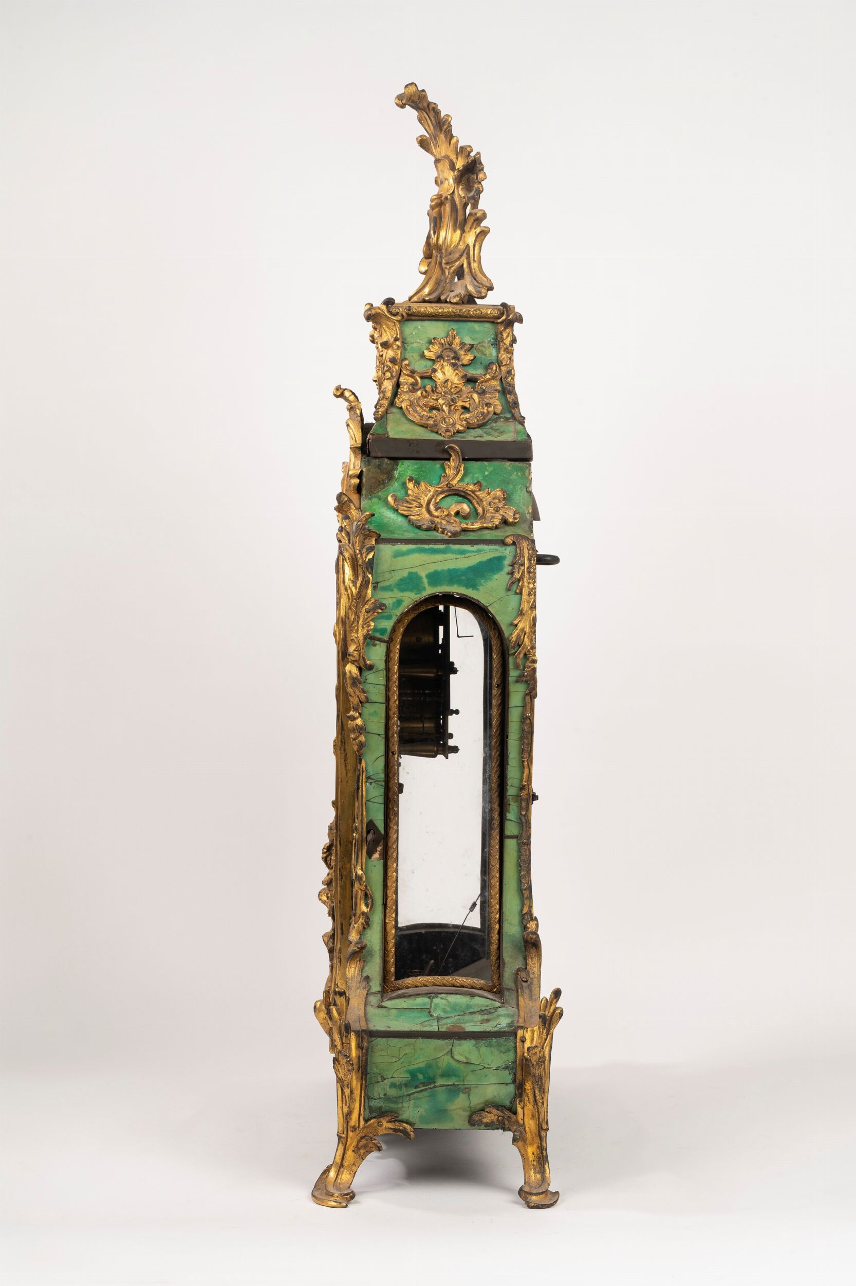fondo verde con finiture in bronzo dorato, fastigio con elemento a rocaille e mascherone quadrante in porcellana firmato Duchesne a Paris