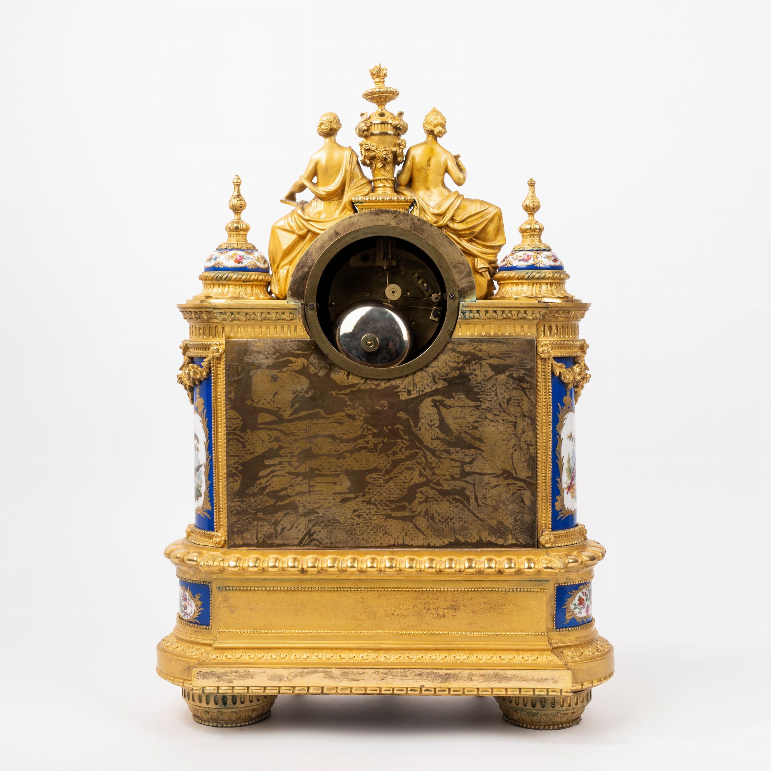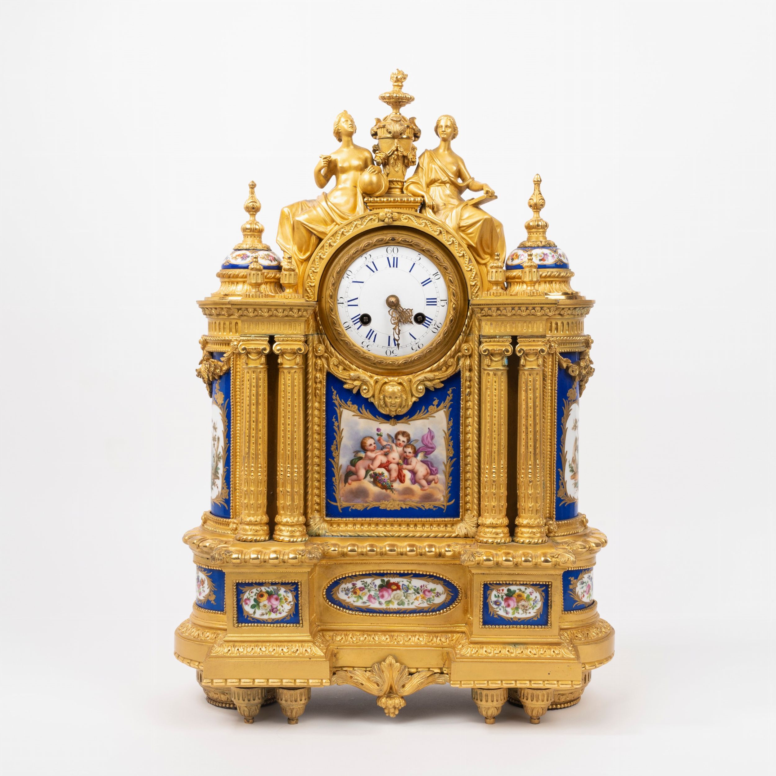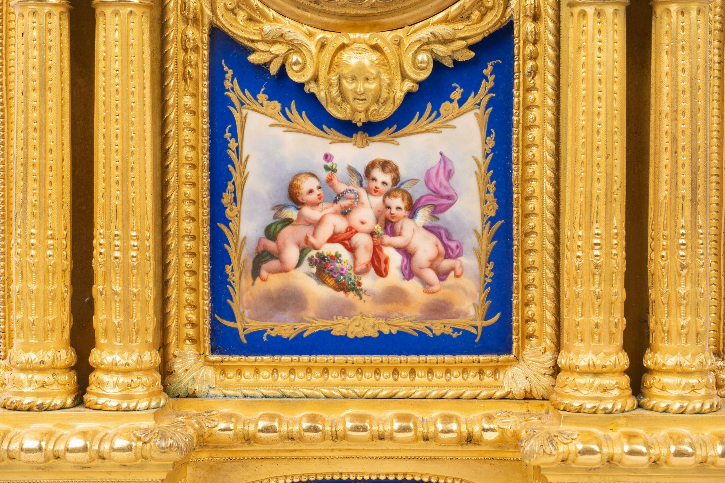 cm 54 x 37 x 17 a doppia coppia di colonne in bronzo dorato e placche in porcellana di Sèvres decorate a motivi floreali, uccelli e scene e putti; sulla sommità due figure femminili allegorie dell'Astronomia e della Storia firmata sul retro sulla meccanica CHes FRODSHAM PARIS funzionante