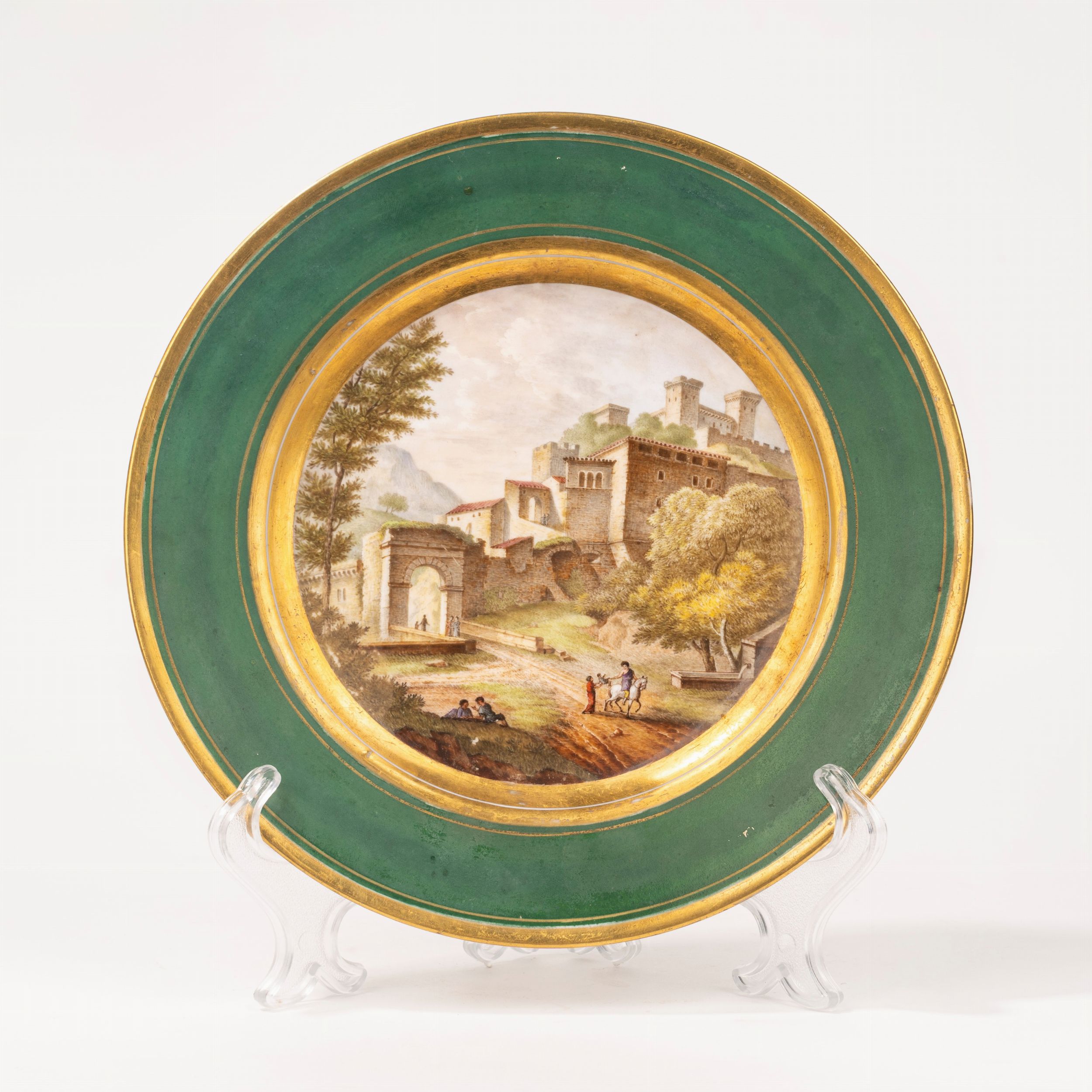 Con veduta del lago di Bolsena dipinta nel cavetto, tesa in verde e oro iscrizione sul retro Vue de Bolzen, sur la route de Florence a Rome
