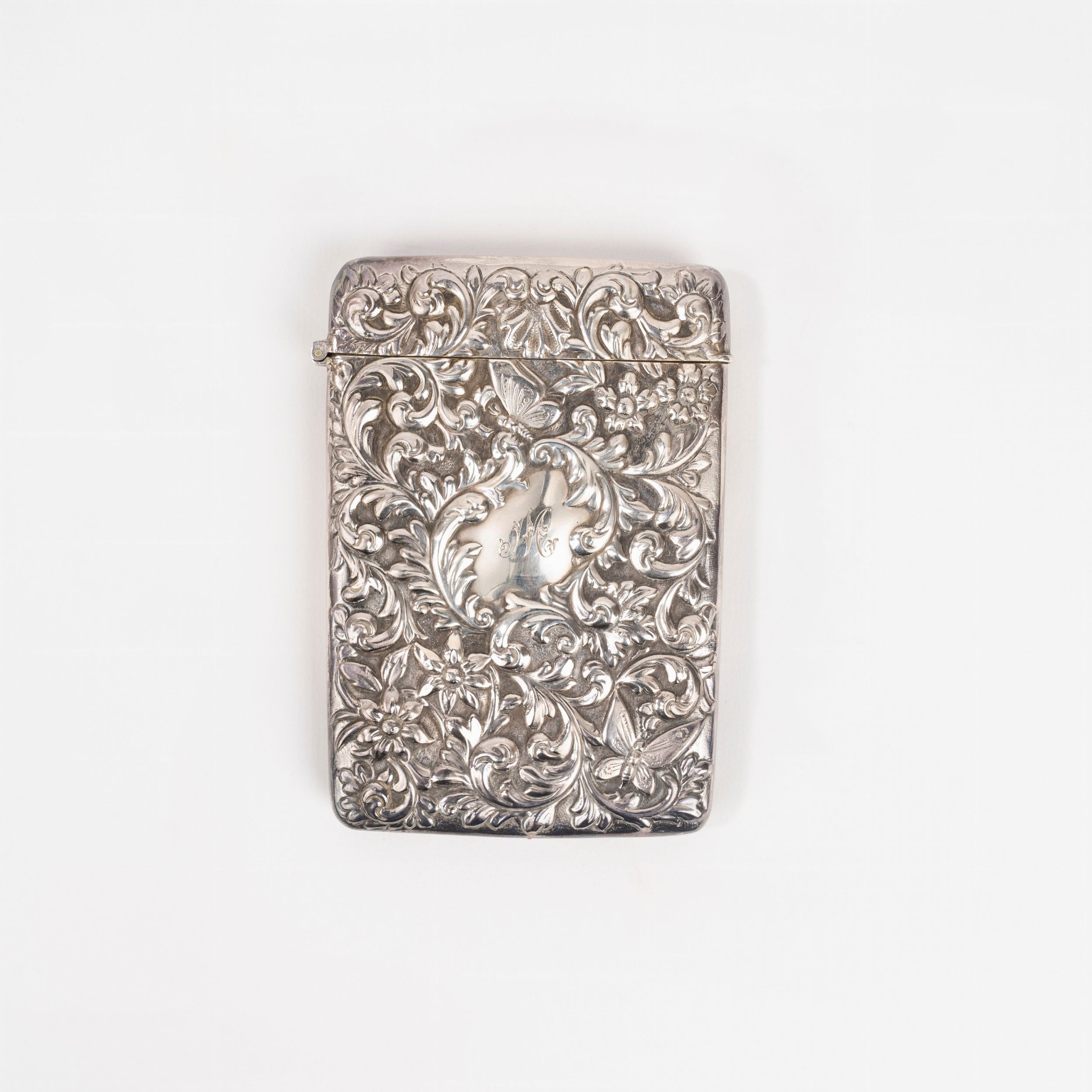 Porta biglietti da visita in argento sbalzato, con decori floreali