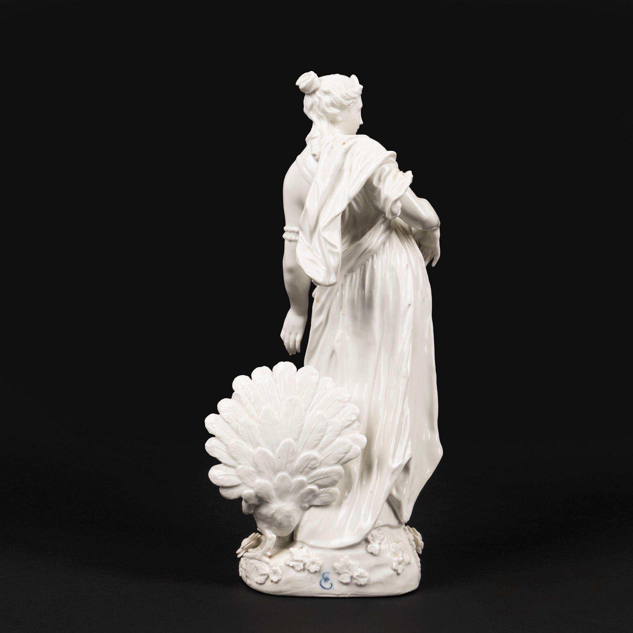 Scultura in porcellana bianca raffigurante Giunone con il pavone, secolo XIX