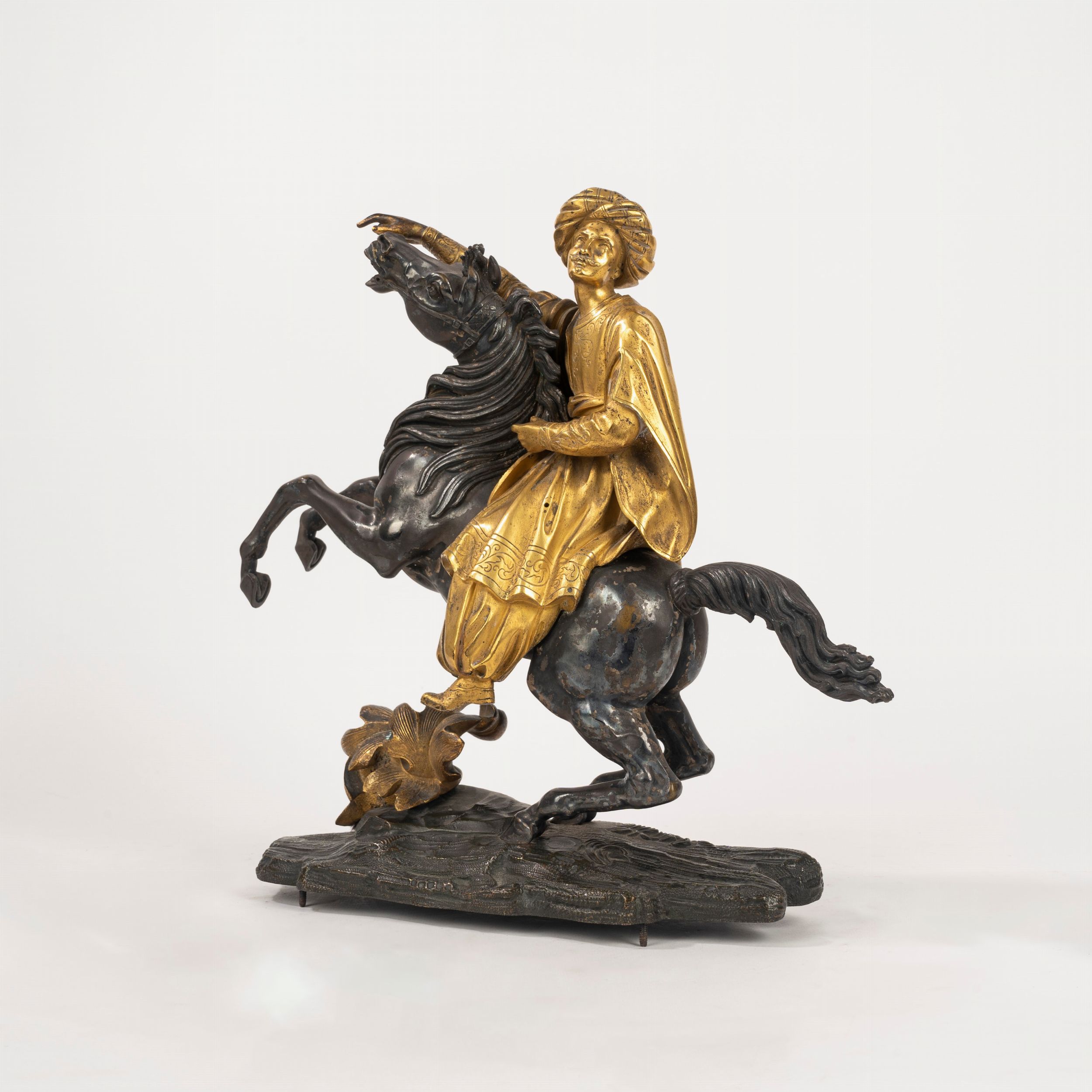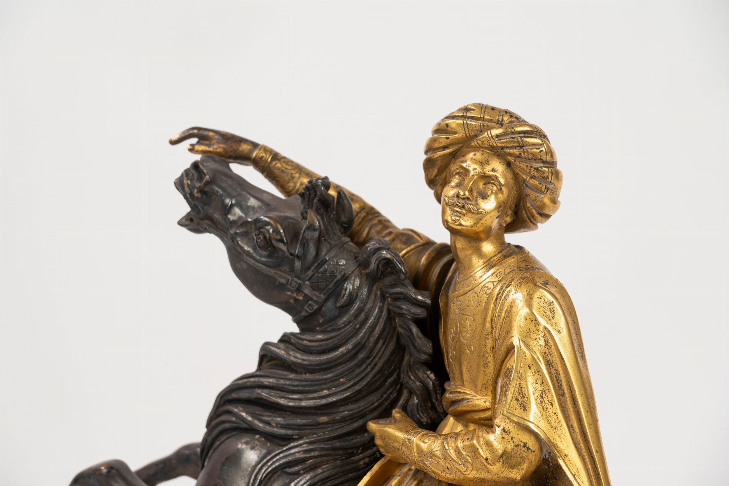 Scultura orientalista raffigurante cavallo e cavaliere in bronzo dorato e a patina [..]