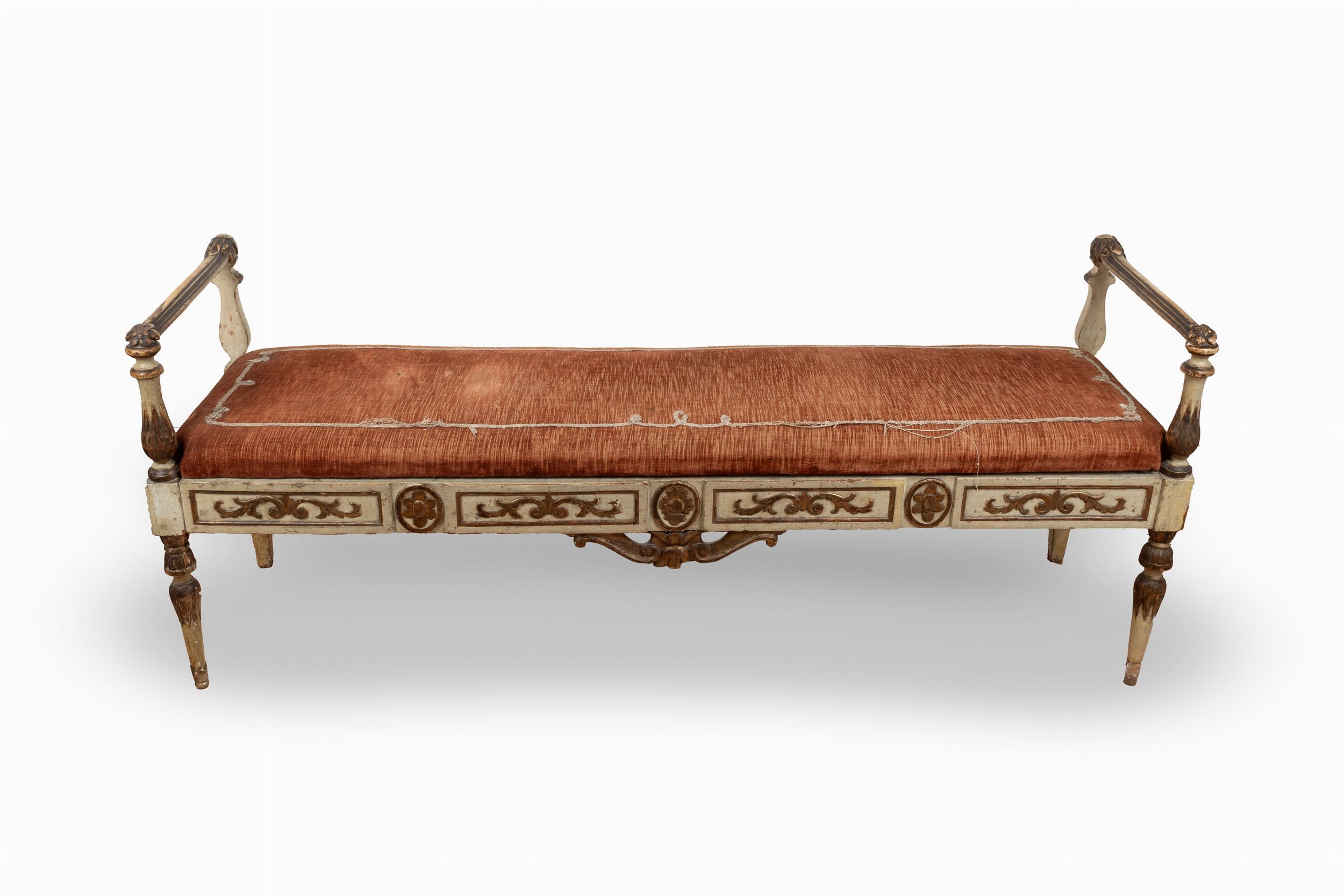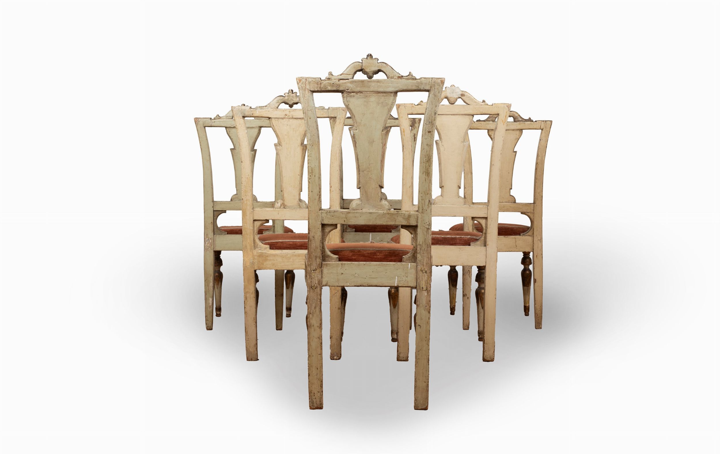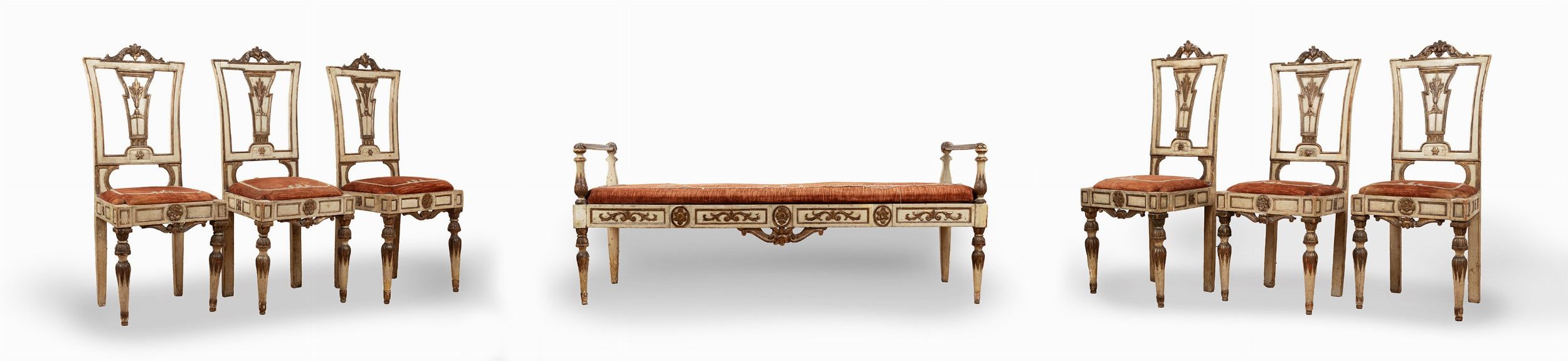 Sei sedie e una panca in legno intagliato e laccato, secolo XVIII
