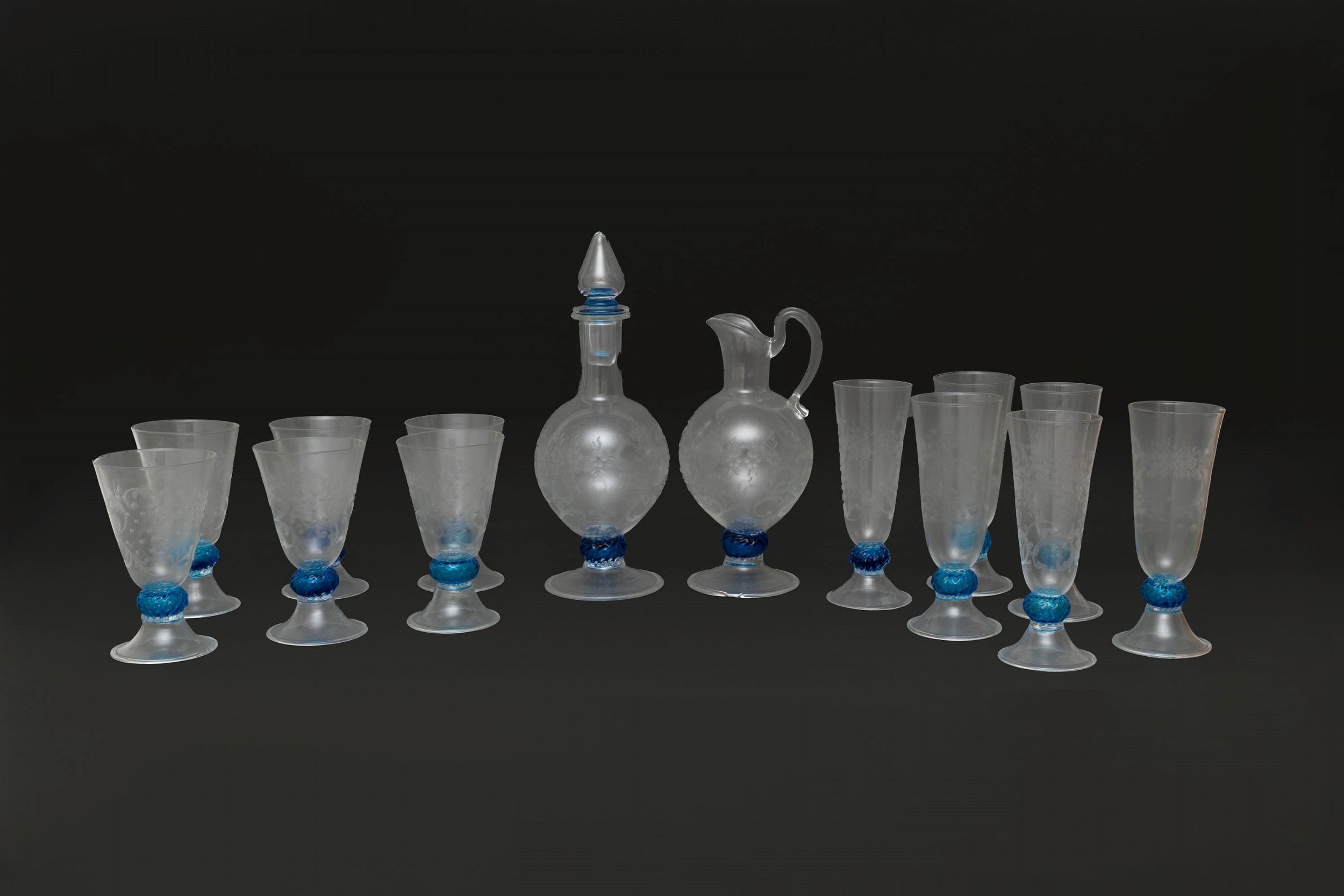 altezza cm 37 (la bottiglia più grande) cm 17,6 (il bicchiere più piccolo) composto da sei bicchieri da vino, sei bicchieri da acqua, una bottiglia e una caraffa, in vetro inciso con arabeschi e elementi in pasta vitrea blu un bicchiere con rottura alla base