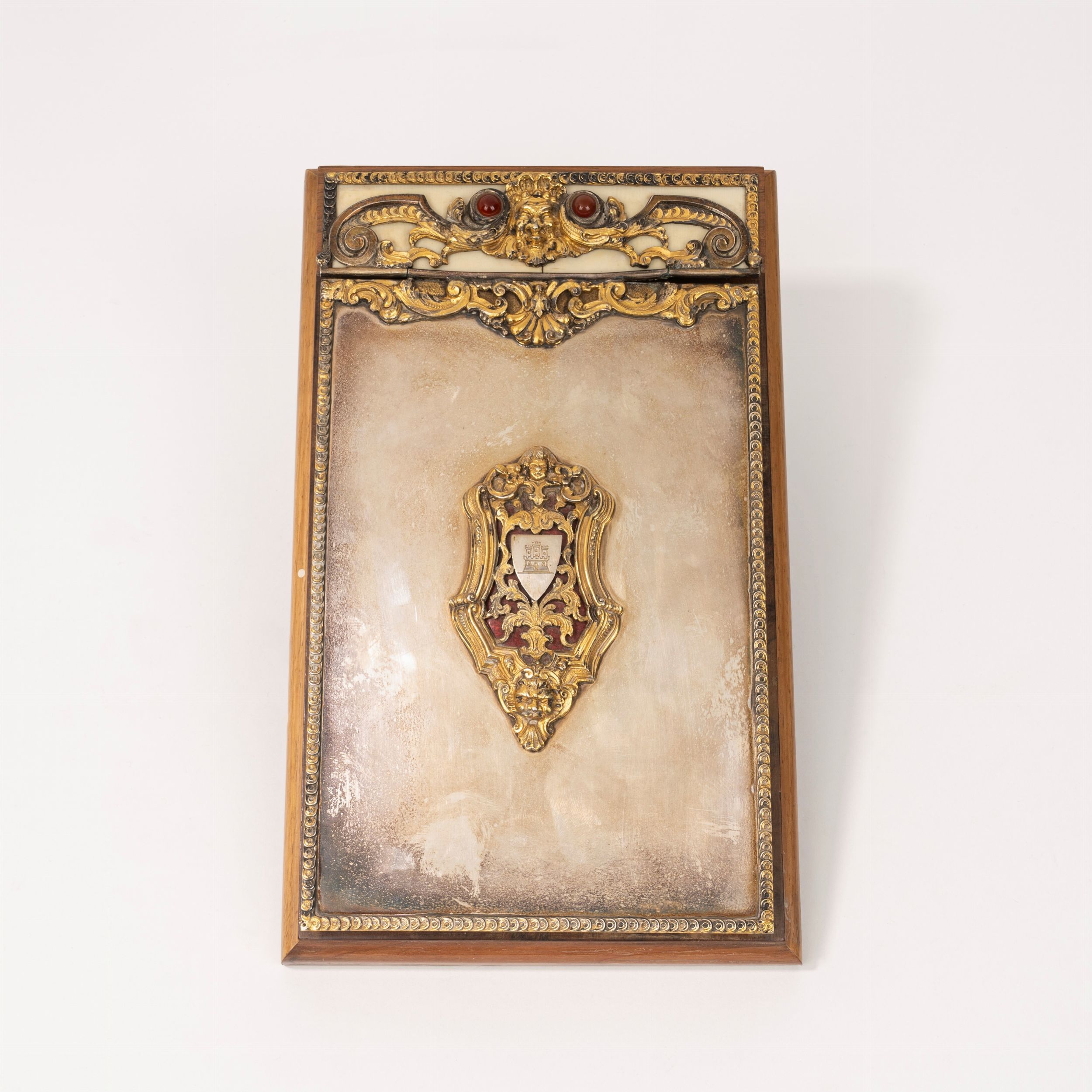 copertina con mascherone centrale, corniole incastonate e stemma araldico entro astuccio in pelle