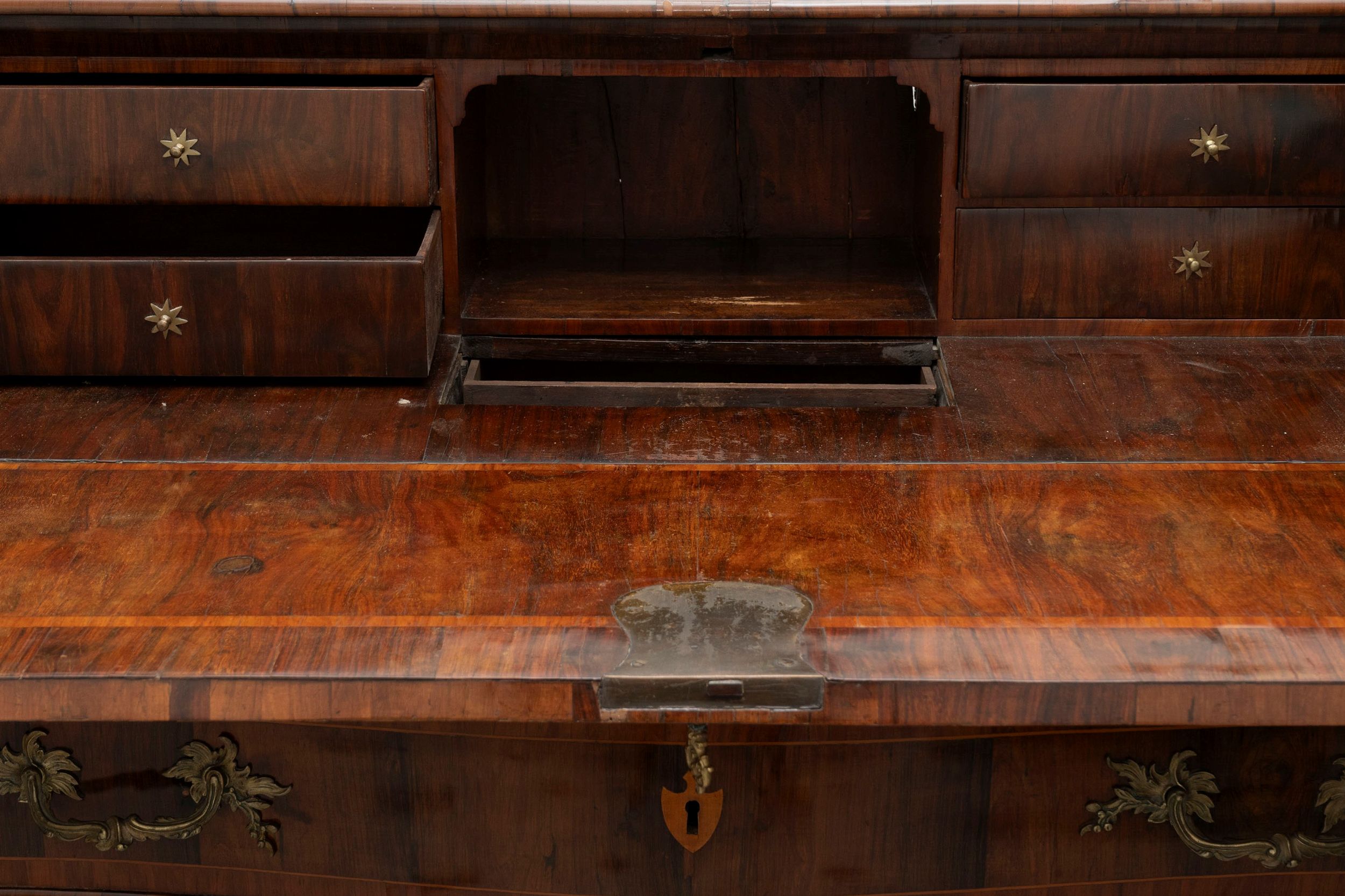 cm 232,5 x 122,5 x 65 con tre cassetti frontali, piano a ribalta con all'interno scarabattolo con 4 cassetti e un segreto, fianchi mossi, parte superiore a vetrina con due sportelli e fregio mistilineo sulla sommità lievi difetti e mancanze, restauro su una gamba