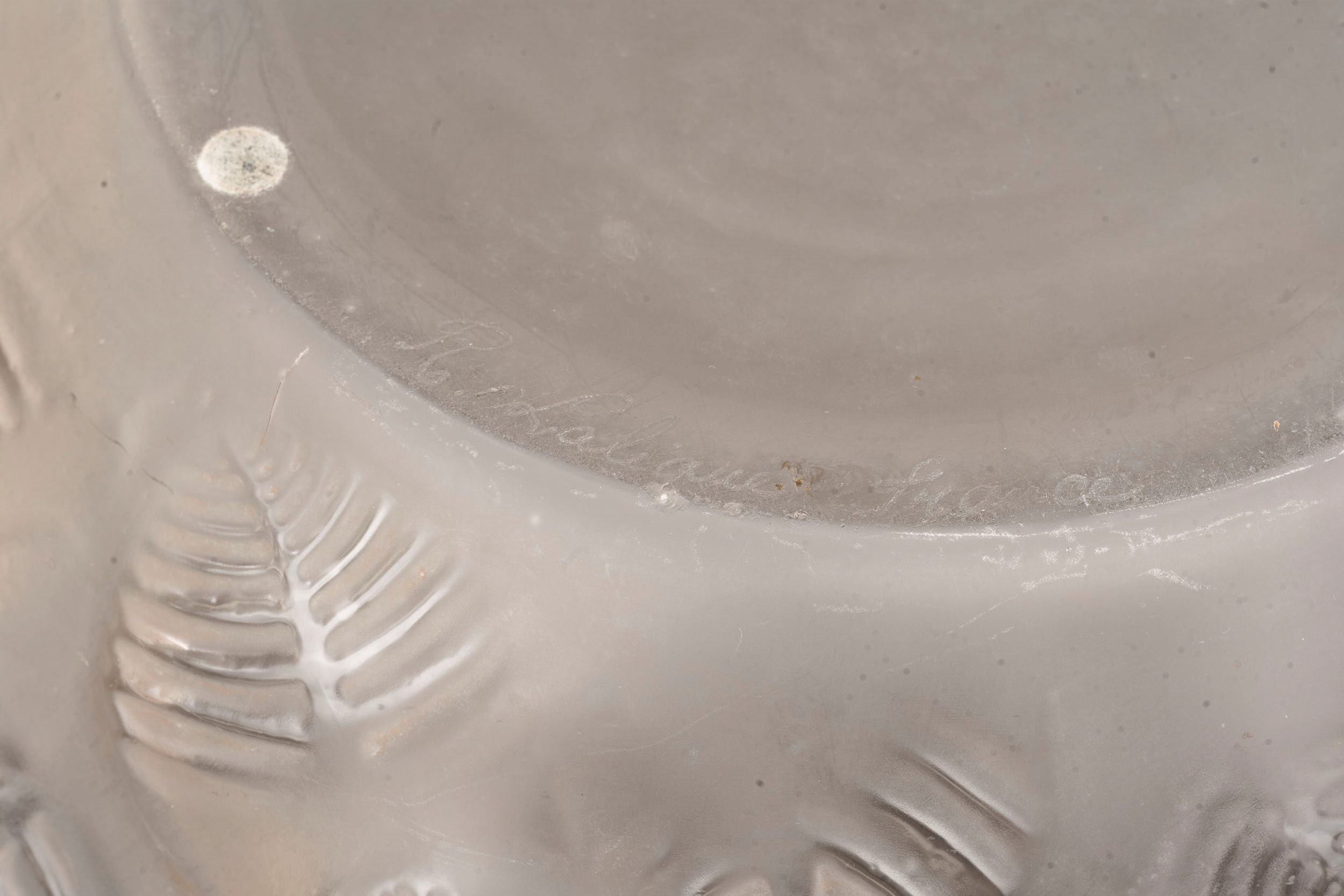 decorazione all-over di punte di foglie evidenziate dalla patina Sienna reca firma a punta di diamante sotto la base R. Lalique France