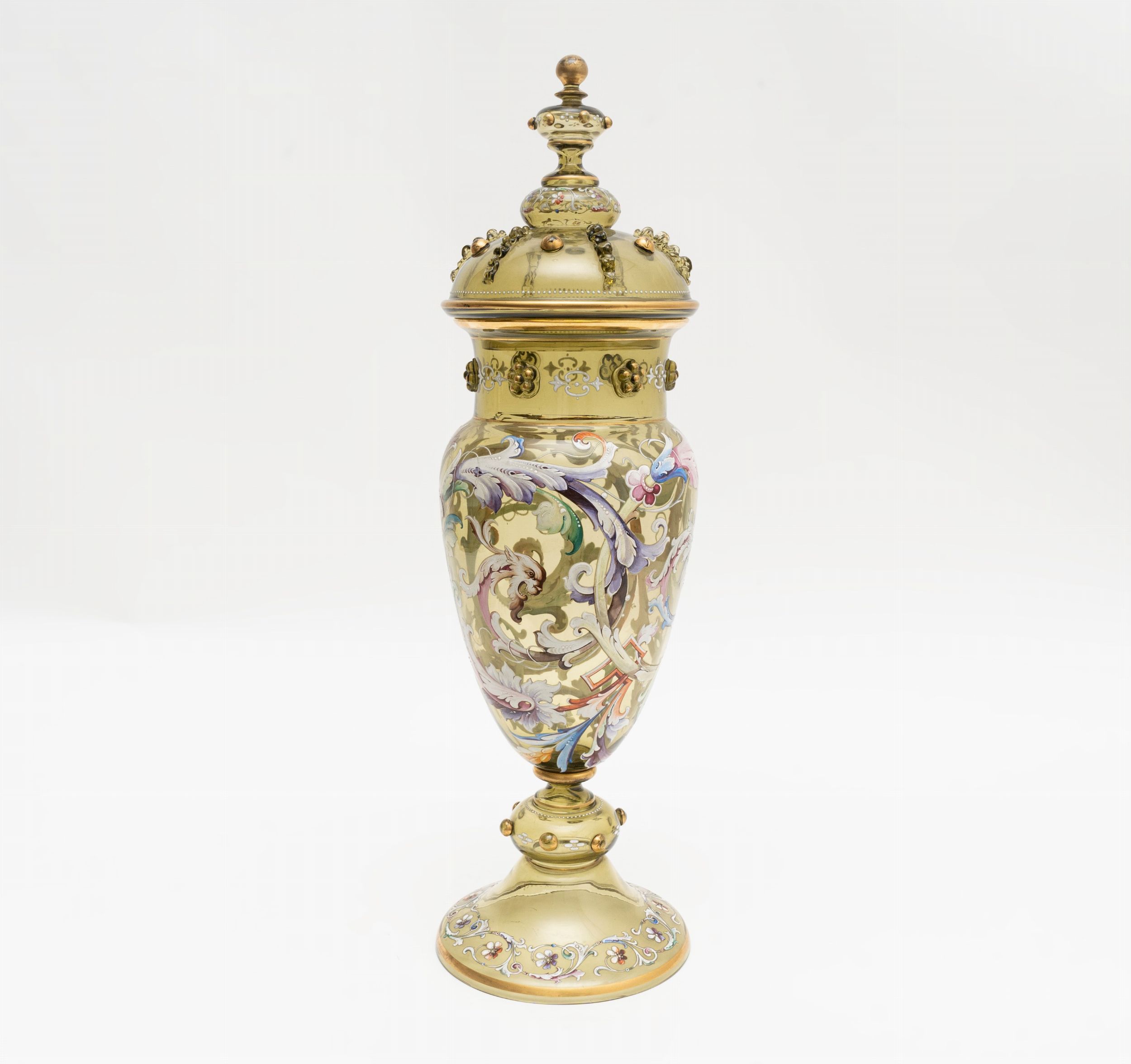 Vaso in vetro e smalti con coperchio, Murano secolo XX