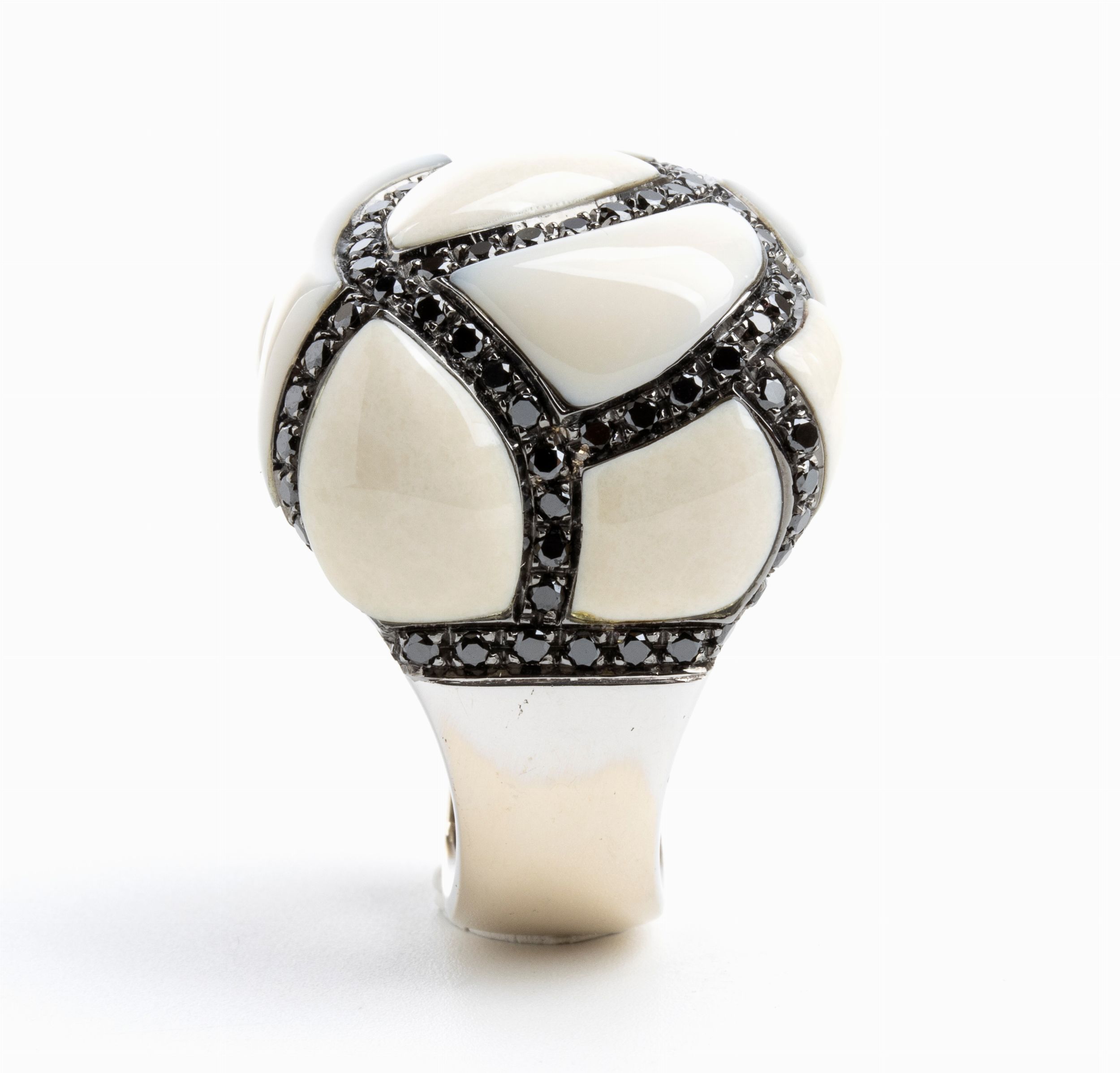 in oro bianco 18k, con motivo di nastri in diamanti neri. Punzonato '750 - 3140 AL'. Misura ITA 26 - Misura USA 11 1/2. Dimensioni fronte: 2,5 x 2,5 cm. Peso: 35 gr. Stato di conservazione: **** buono.