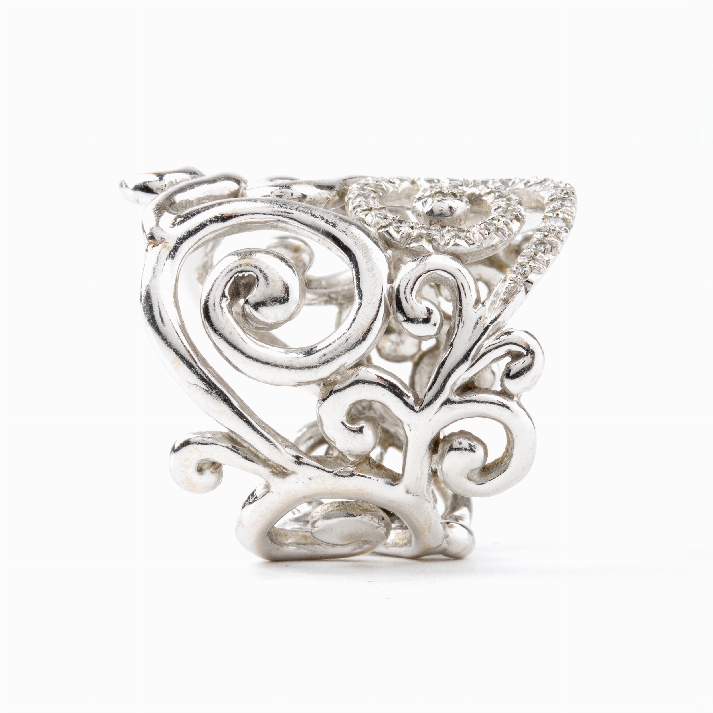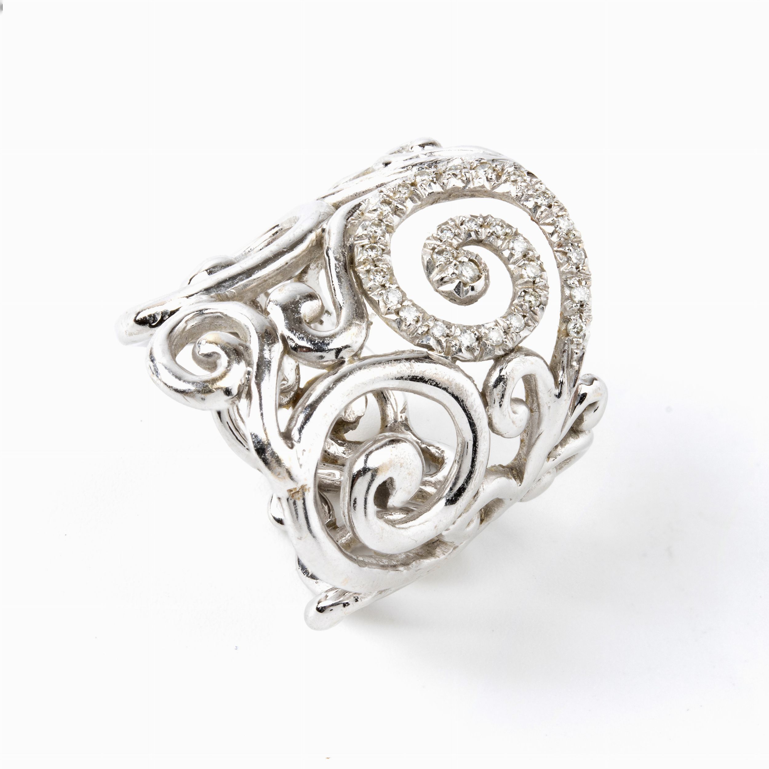 a motivo di volute di nastri in diamanti pert totali 0.28 ct. Misura IT 15 - Misura US 7 1/2. Peso 17,2 gr. Stato di conservazione: **** buono.