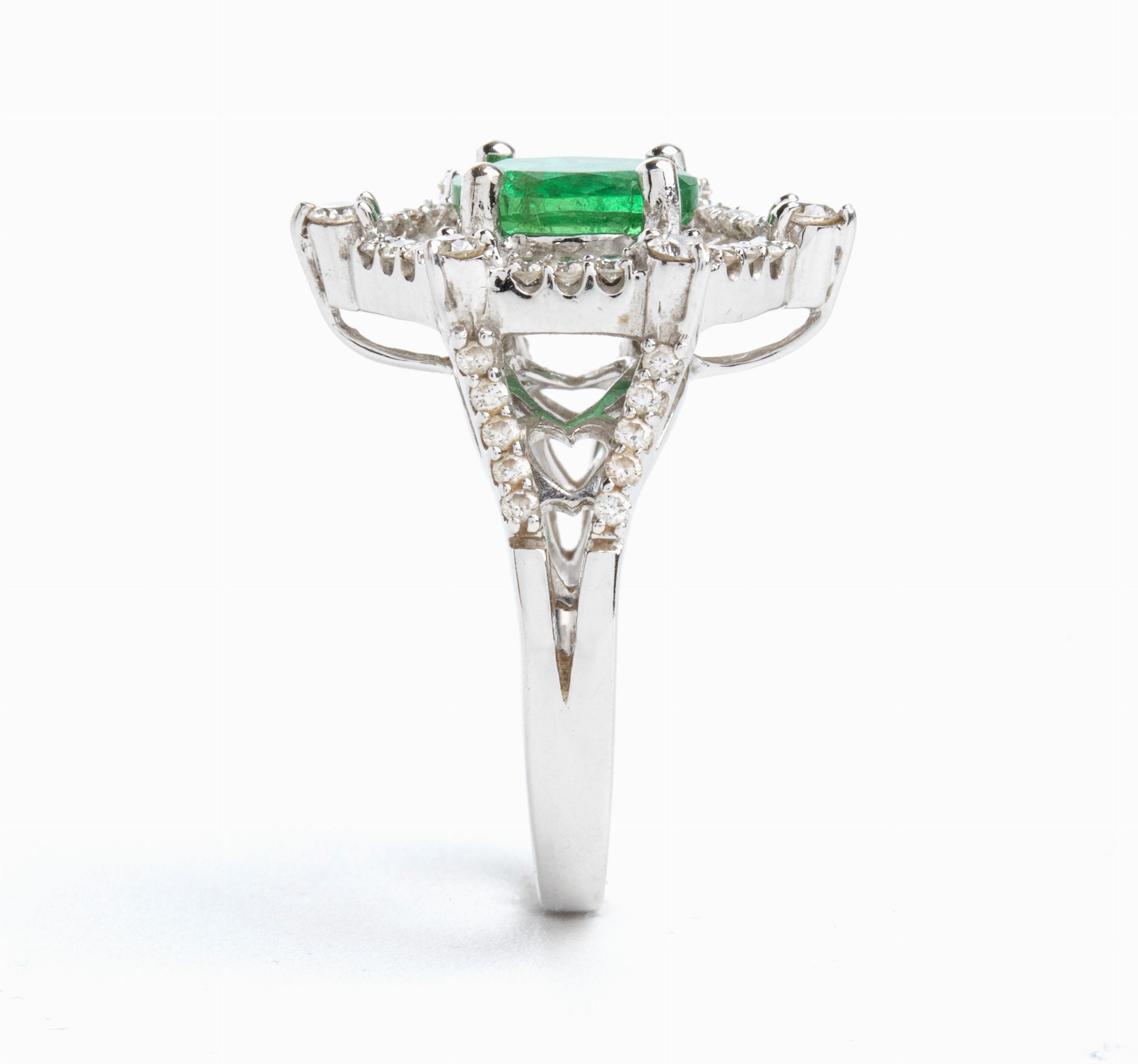 in oro bianco 18k, incastonato con smeraldo contornato da diamanti. N. 01 smeraldo di forma ovale, taglio composito, circa 1.60 ct. N. 41 diamanti di forma rotonda, taglio brillante e n. 27 diamanti di forma trapezoidale, taglio a gradini, circa 2.40 ct, G-I, VS-SI. Punzonato '750'. Misura IT 13.5 - Misura US 6 3/4. Peso 6,5 gr. Stato di conservazione: **** buono.
