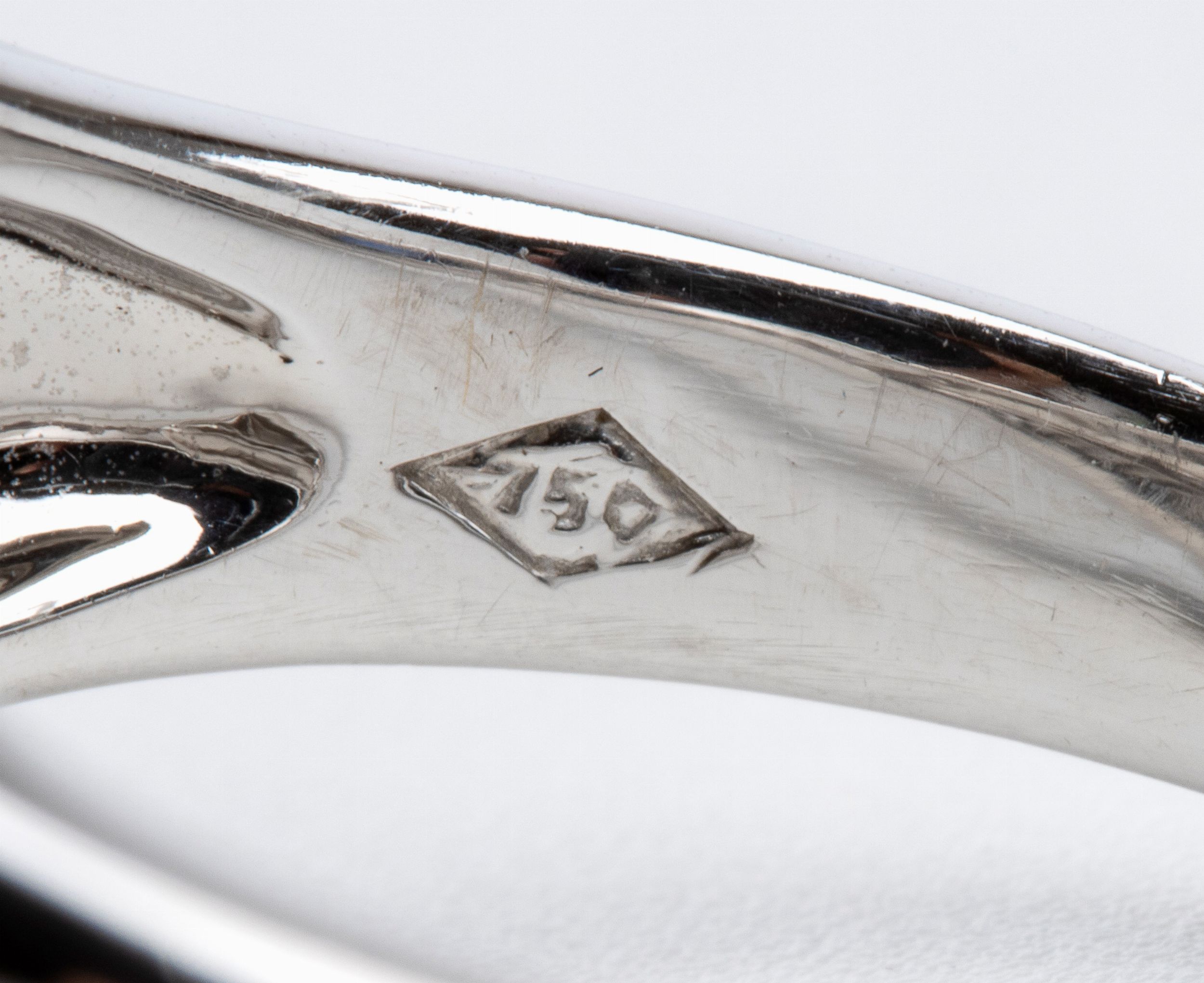 oro bianco 18k, Incastonato con zaffiro ovale contornato da nastri in diamanti baguette ad affiancato da brillanti. N. 01 zaffiro di orma ovale, taglio composito, circa 2.00 ct. (Evidenza di trattamento termico). N. 06 diamanti di forma rotonda, taglio brillante e n. 38 diamanti di forma rettangolare e trapezoidale, taglio a gradini, circa 1.80 ct, F-G, VVS-VS. Punzonato '750'. Misura IT 15 - misura US 17 1/2. Peso: 7.5 gr. Stato di conservazione: **** buono.
