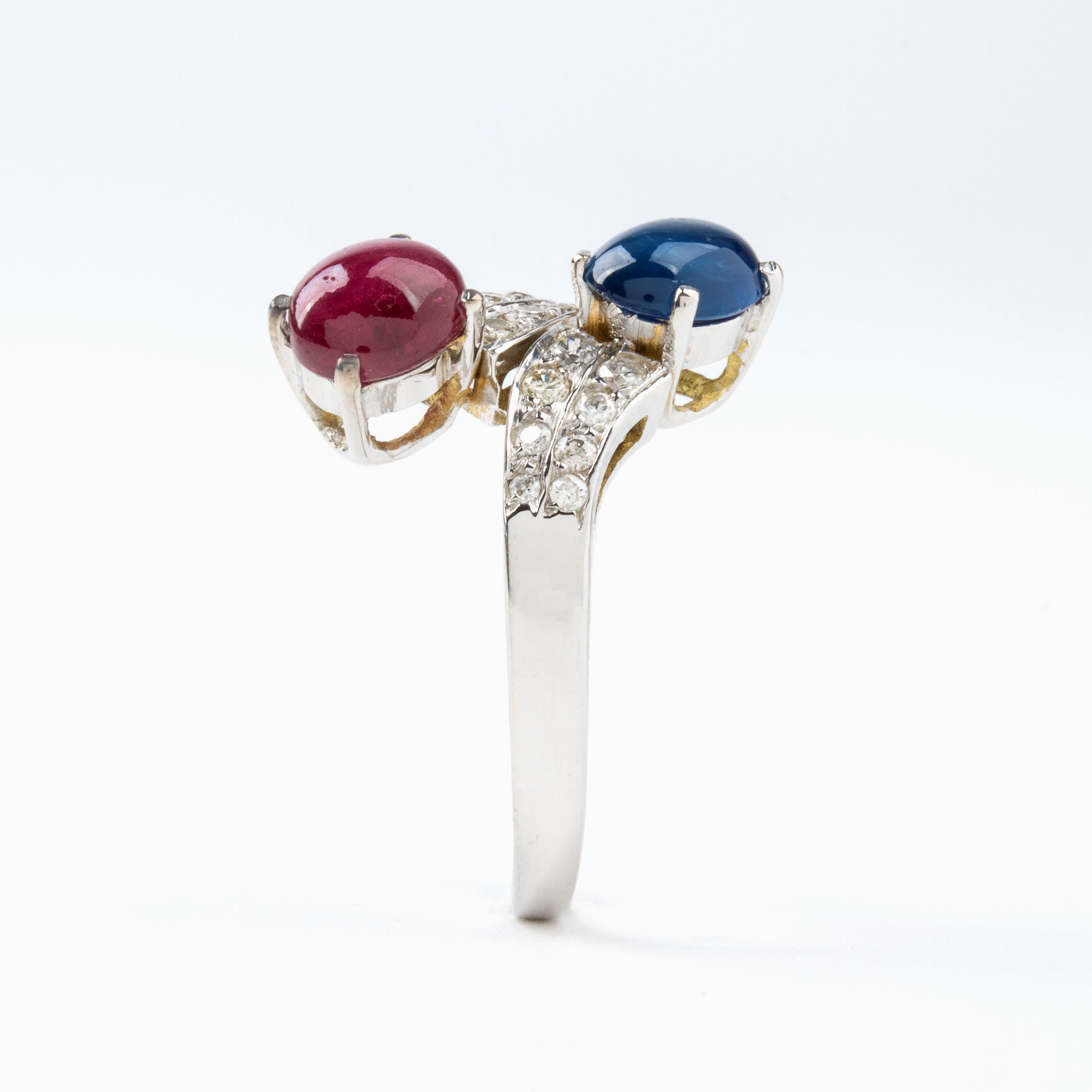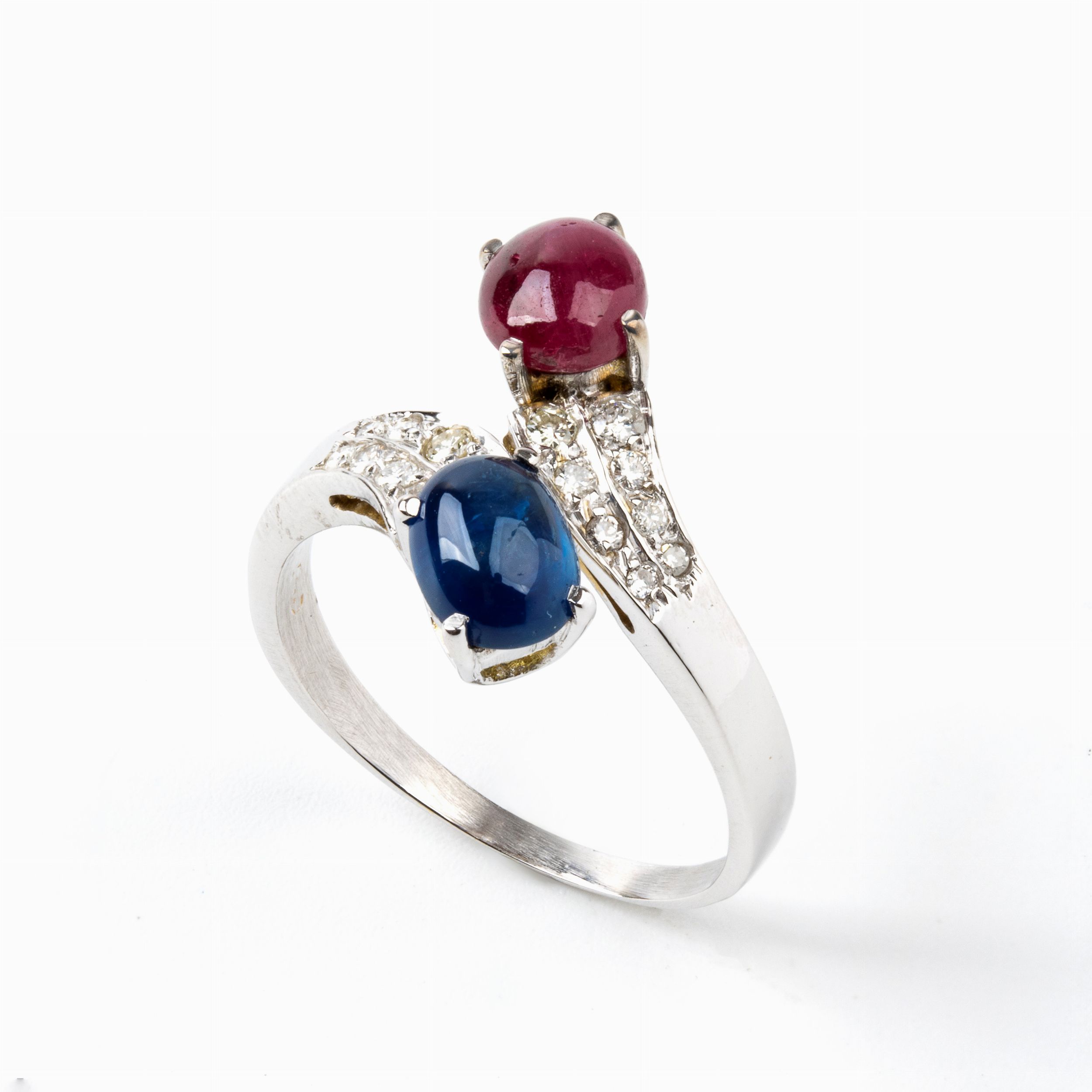 in oro bianco 18k. N. 01 rubino di forma ovale, taglio cabochon, circa 1.10 ct. N. 01 zaffiro di forma ovale, taglio cabochon, circa 1.10 ct. N. 16 diamanti di forma rotonda, taglio brillante, circa 0.18 ct, G-H, VS-SI. Punzonato '750'. Misura IT 17 - Misura US 8. Peso 4,6 gr. Stato di conservazione: **** buono.