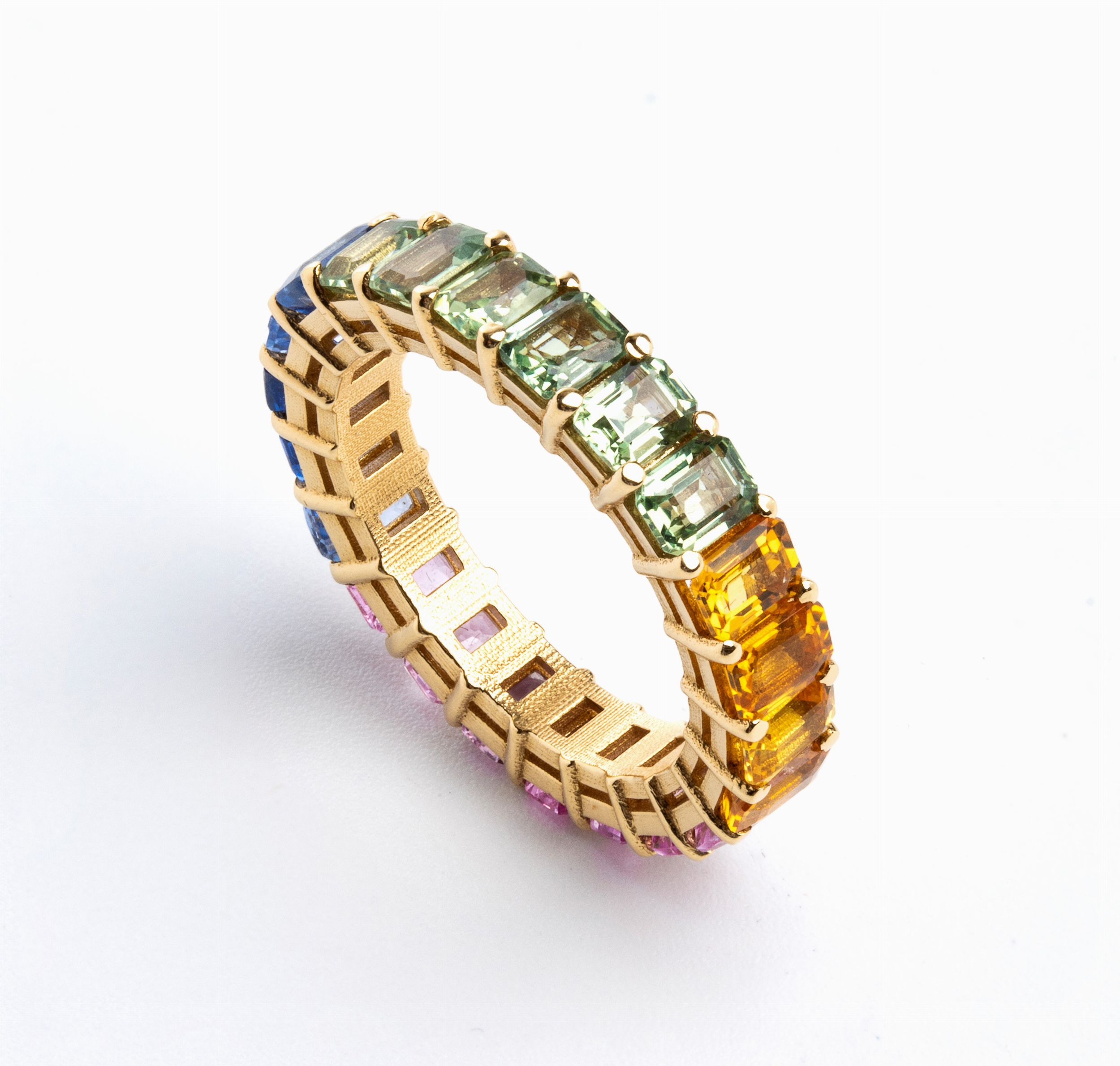 effetto arcobaleno grazie all'utilizzo di corindoni di diversi colori.  Misura ITA 14 - Misura USA 7. Peso: 5,5 gr. Stato di conservazione: ***** eccellente.