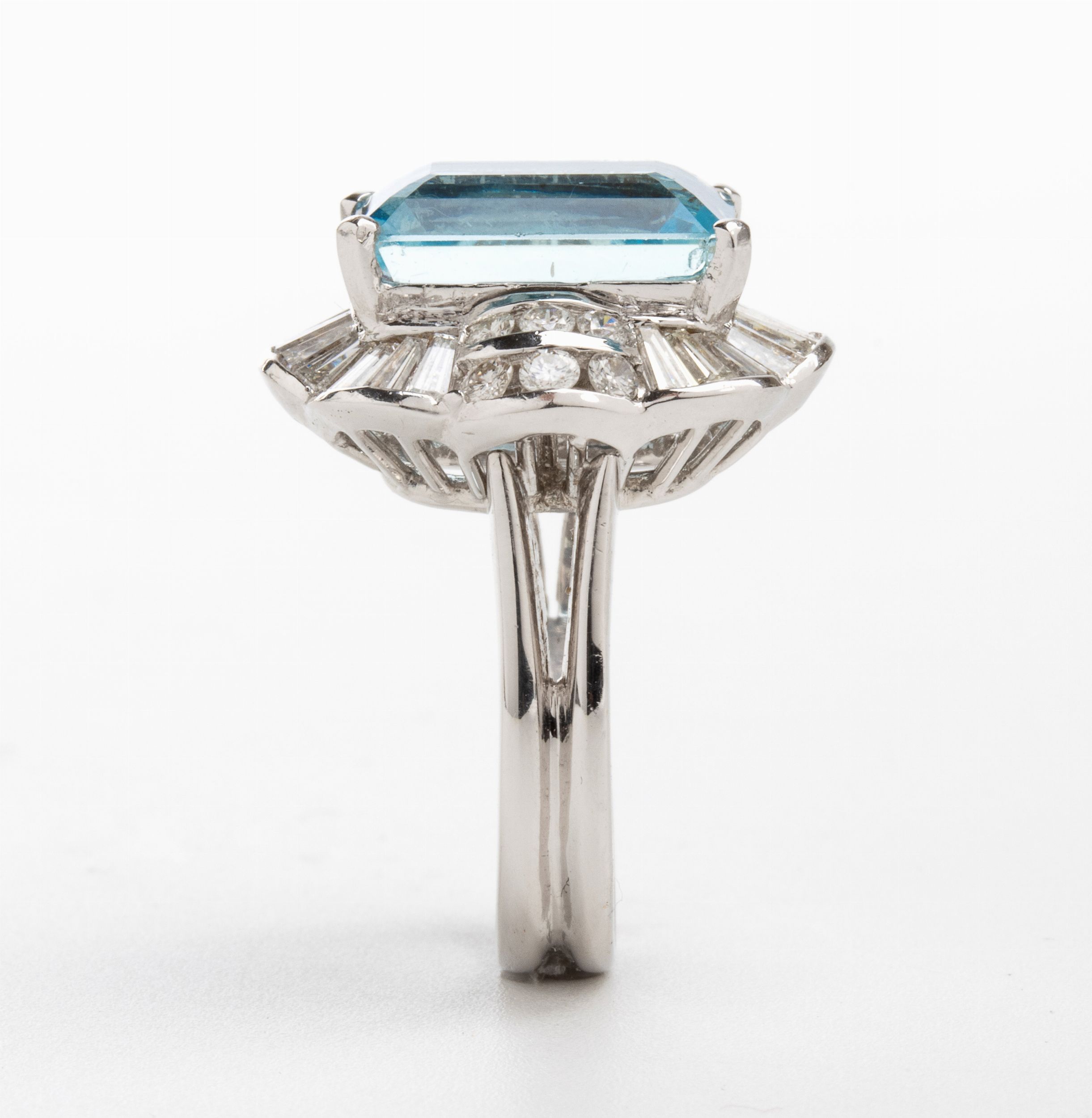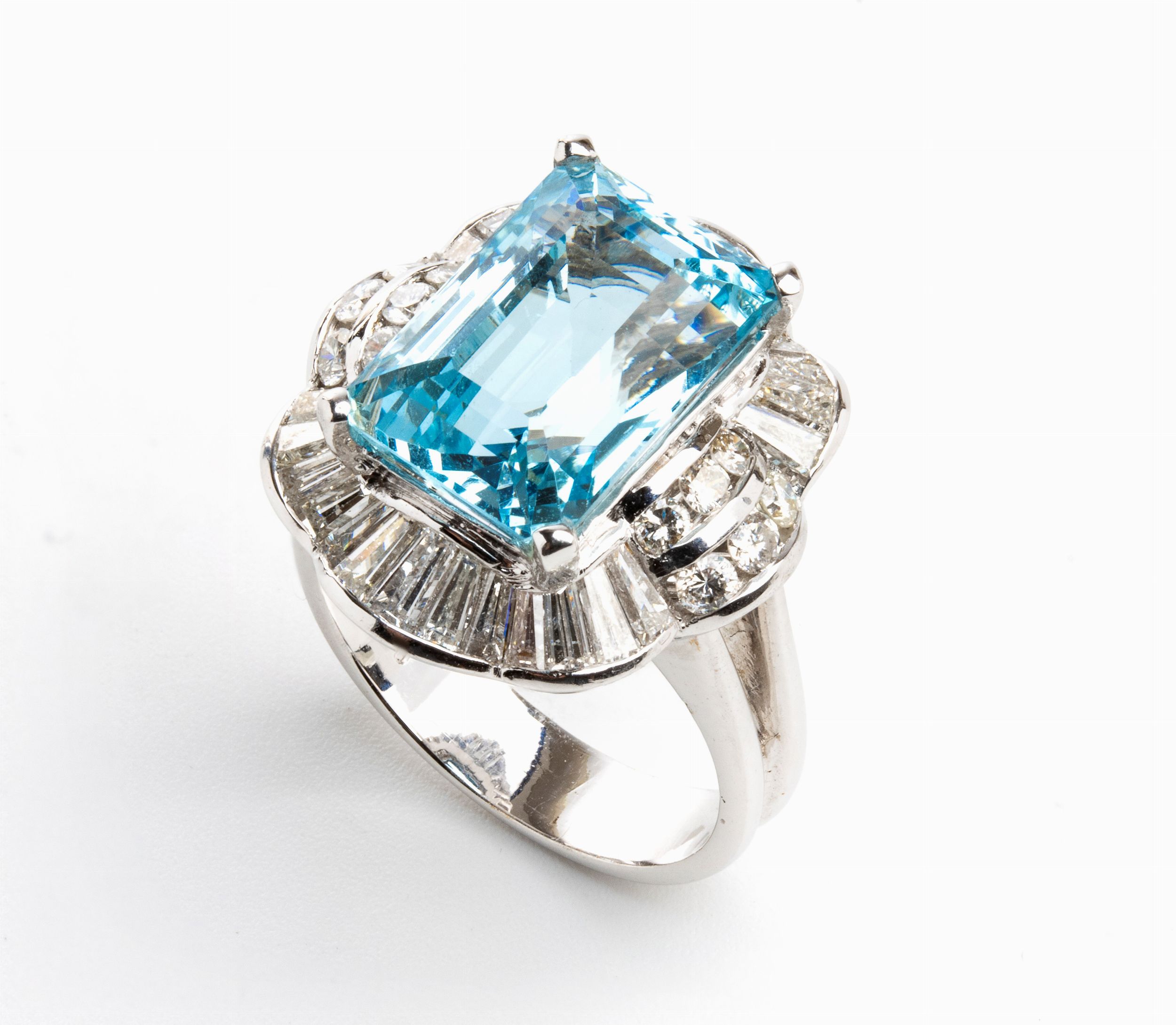 montatura a ballerina in oro bianco 18k con acquamarina centrale e contorno di diamanti. N. 01 acquamarina di forma rettangolare, taglio a gradini, circa 7.50 ct. N. 42 diamanti di forma rotonda e rettangolare, taglio brillante e taglio a gradini, circa 2.00 ct, F-G, VVS-VS. Misura ITA 13 - Misura USA 6. Peso: 9,5 gr. Stato di conservazione: ***** eccellente.