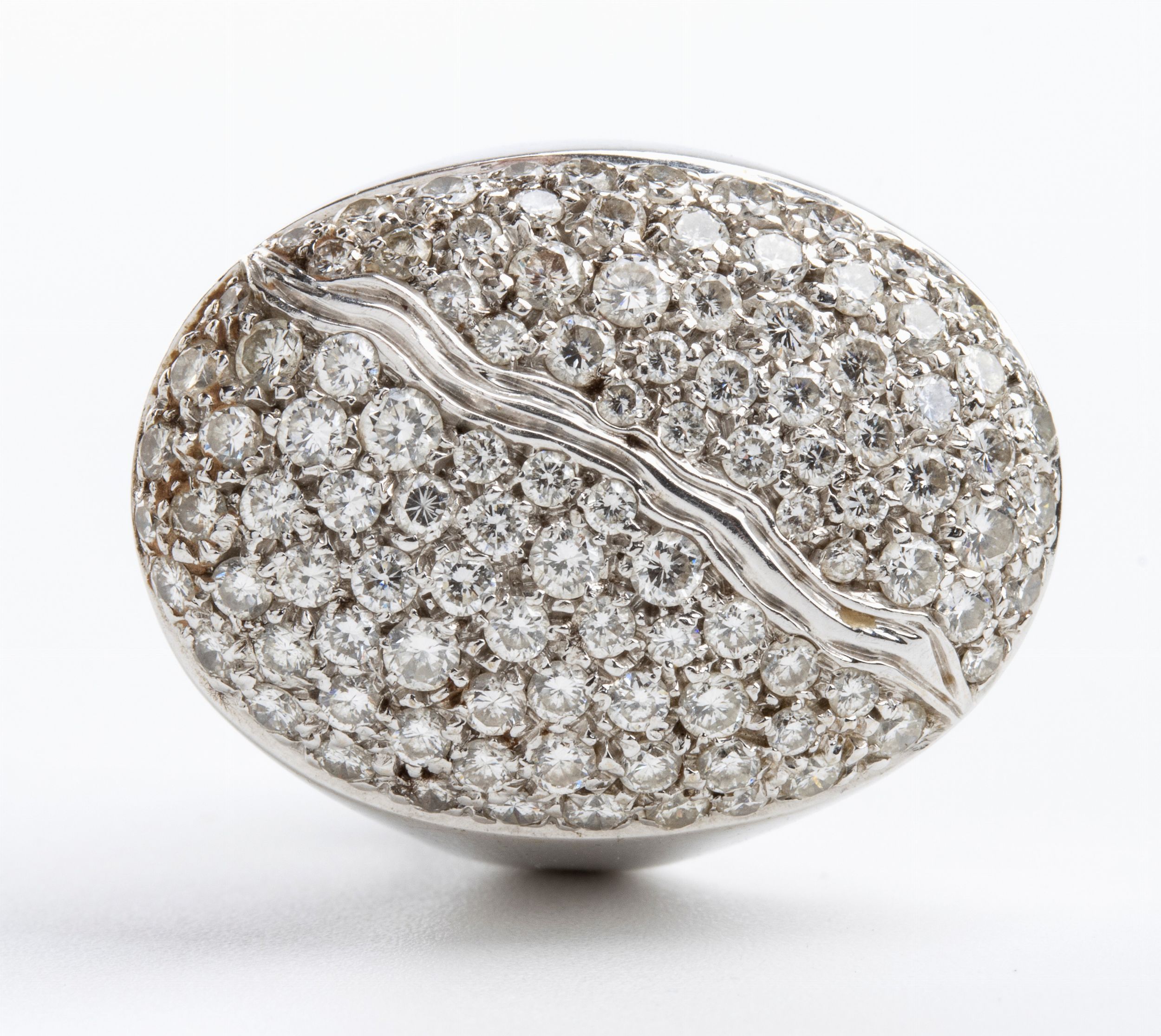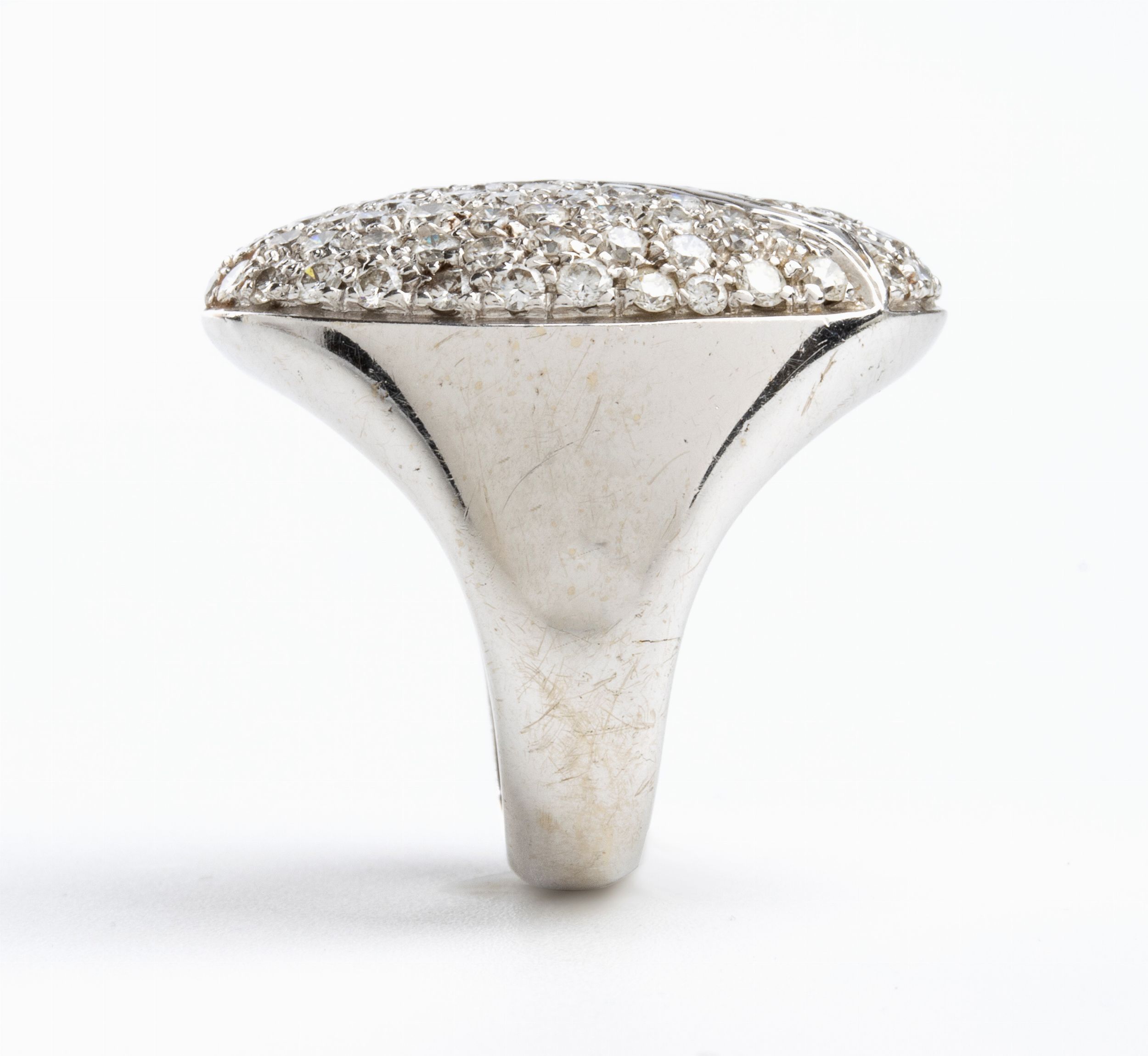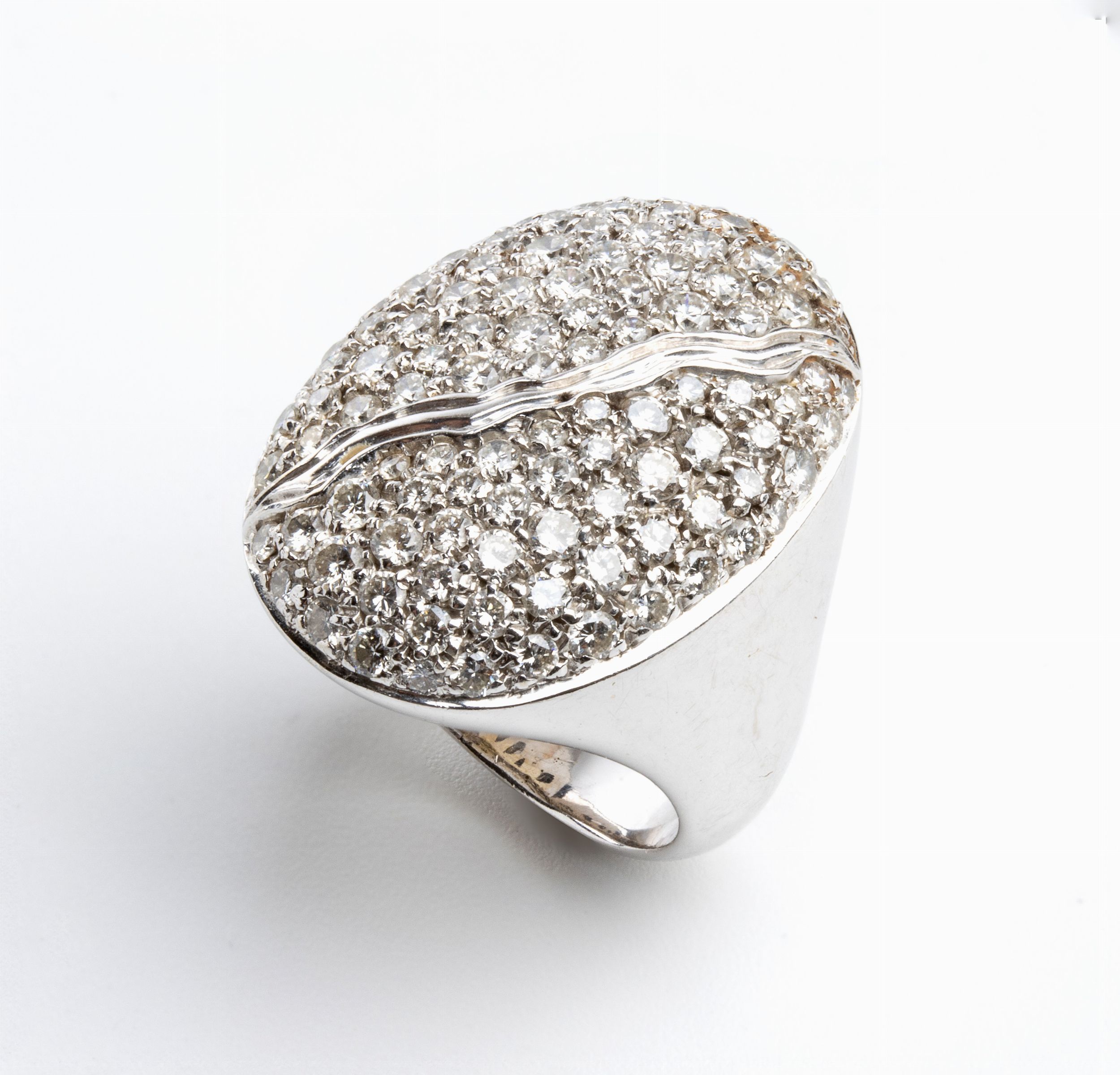 modellato come una fascia in oro bianco 18k, con motivo geometrico in pavé di diamanti. n. 102 diamanti di forma rotonda, taglio brillante, circa 2.00 ct, F-G, VVS-VS. Punzonato '750'. Misura ITA 8 - Misura USA 4 1/2. Dimensioni fronte: 2,5 x 1,5 cm. Peso: 12 gr. Stato di conservazione: **** buono.