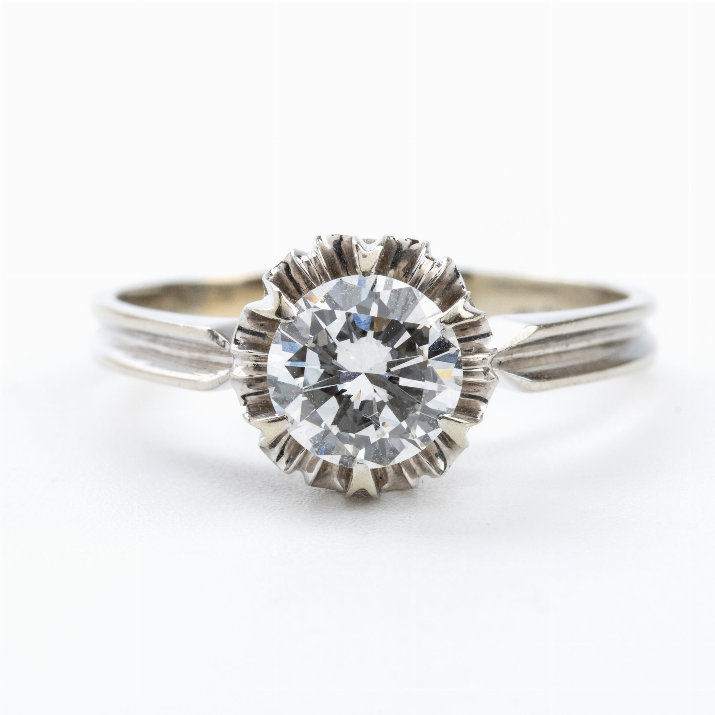 in oro bianco 18k, incastonato con diamante rotondo, taglio brillante, circa 0.76 ct, H-I, VS. Punzonato '750'. Misura IT 16 - Misura US 7 1/2. Peso 2,9 gr. Stato di conservazione: **** buono.