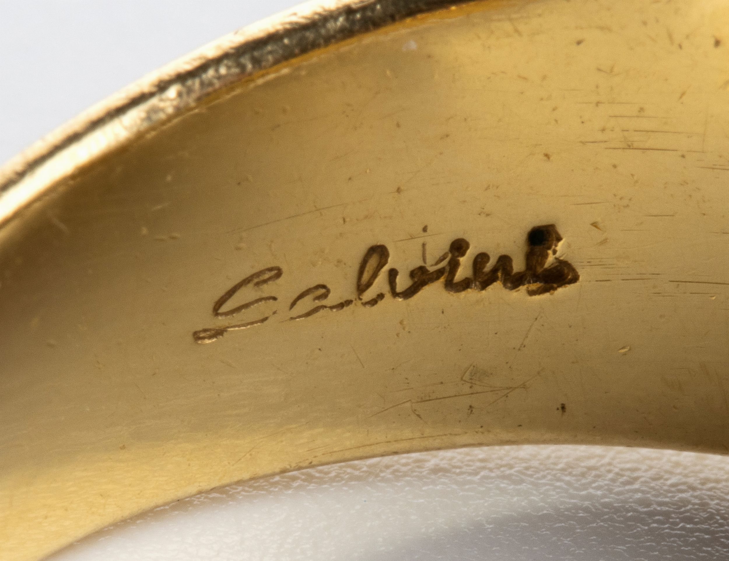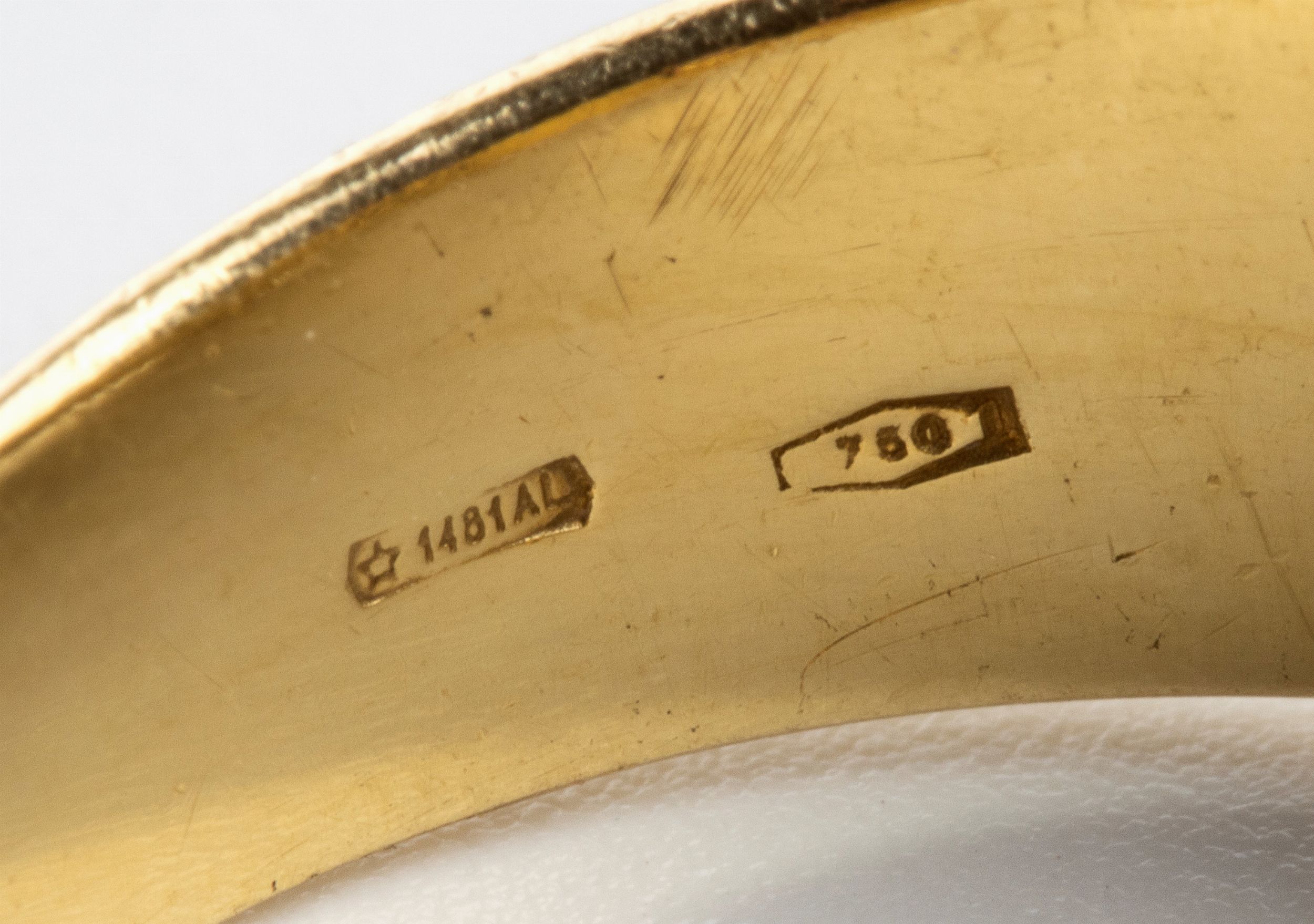 modellato come una fascia in oro giallo 18k, con motivo di nastri in diamanti. Firmato SALVINI. N. 30 diamanti di forma rotonda, taglio brillante e n. 9 diamanti di forma rettangolare, taglio a gradini circa 1.60 ct totali, F-G, IF-VVS. Punzonato '750 - 1481 AL'. Misura IT 16- misura US 7 1/2. Peso: 9.1 gr. Stato di conservazione: **** buono.