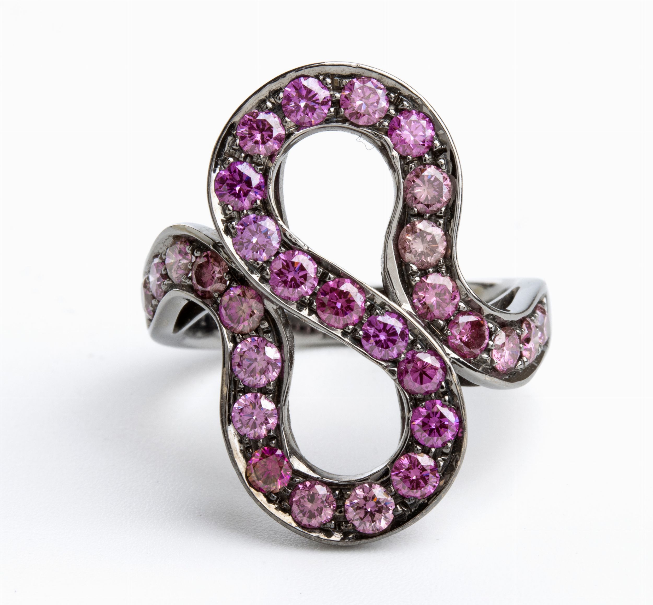 a forma di serpente, impreziosito da n. 29 diamanti di forma rotonda, taglio brillante, circa 1.60 ct.  Misura ITA 13 - Misura USA 6. Peso: 6,4 gr. Stato di conservazione: **** buono.