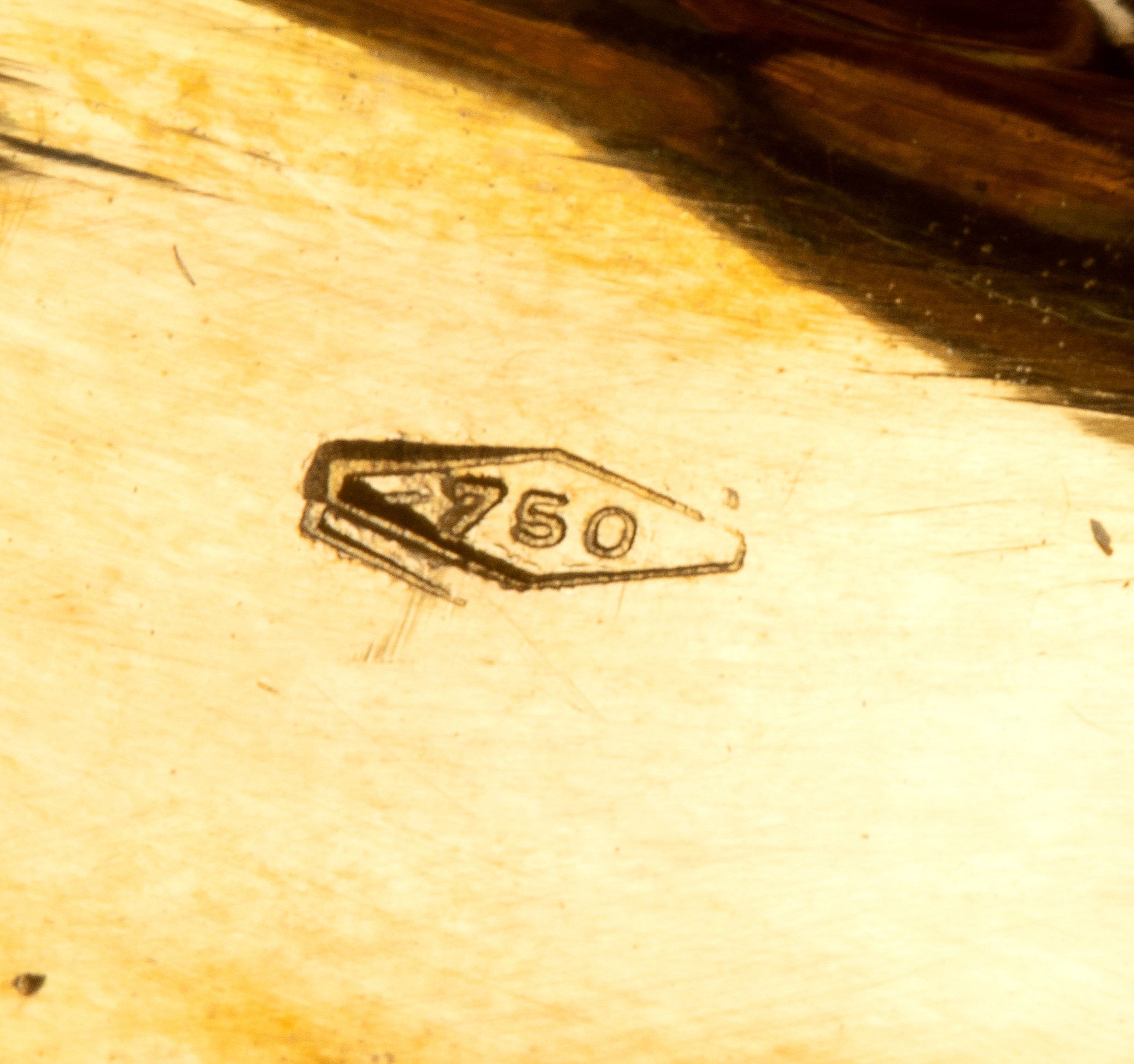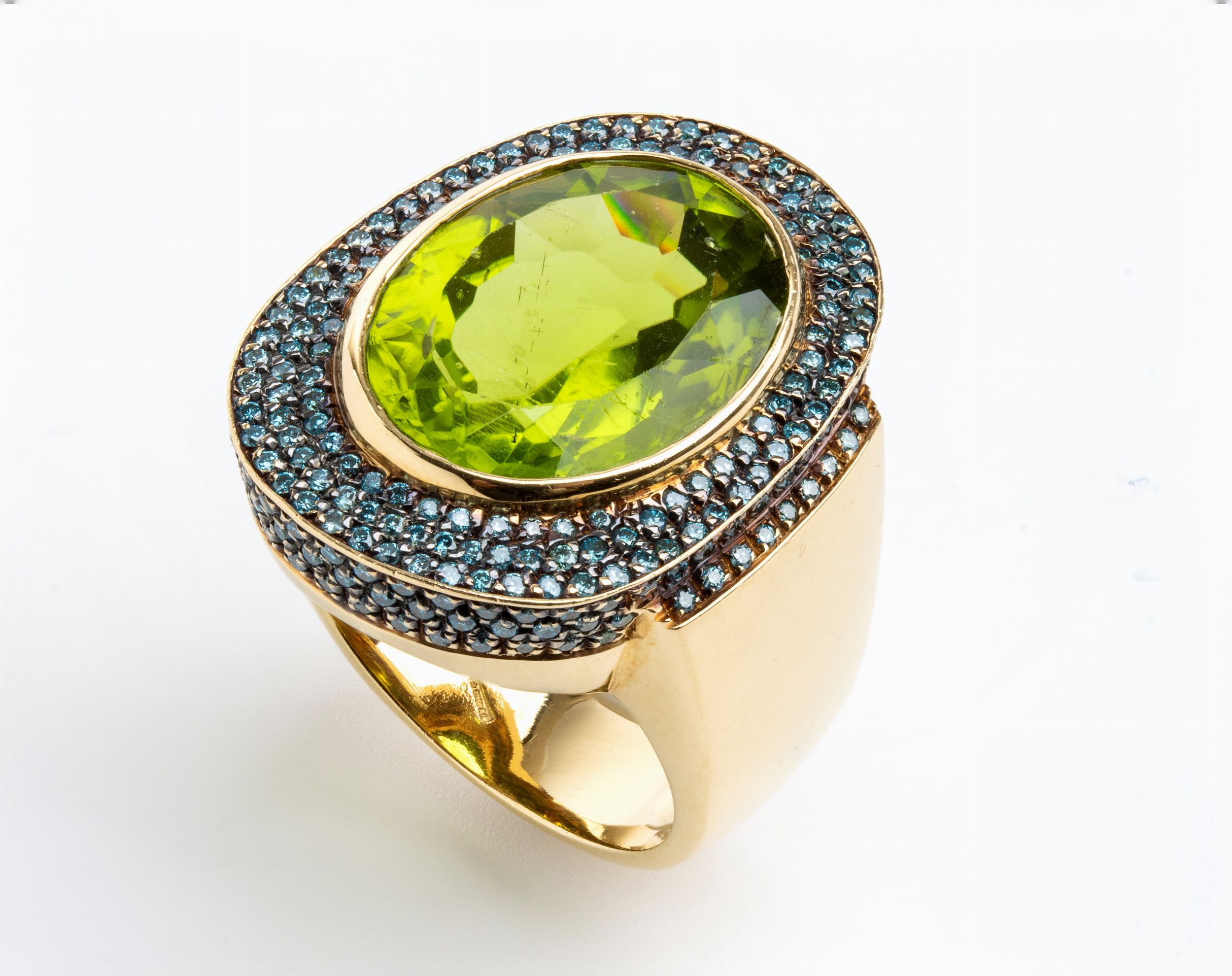 modellato come una fascia in oro giallo 18k, incastonato con grande peridoto ovale contornato da pavè di diamanti blu. Punzonato '750'. Misura ITA 28 - Misura USA 12 1/2. Dimensione fronte: 2,7 x 2,2 cm. Peso: 27,7 gr. Stato di conservazione: **** buono.