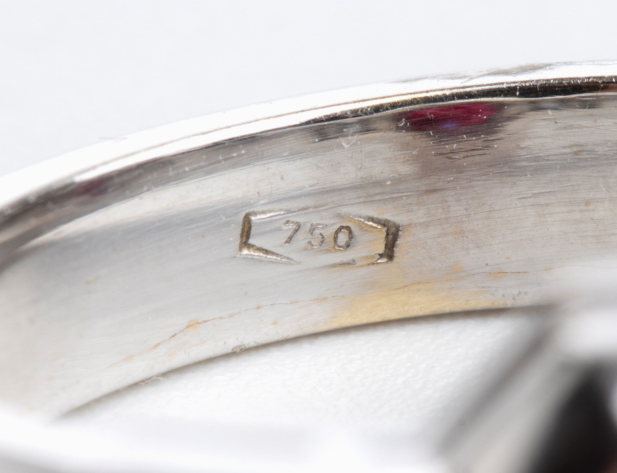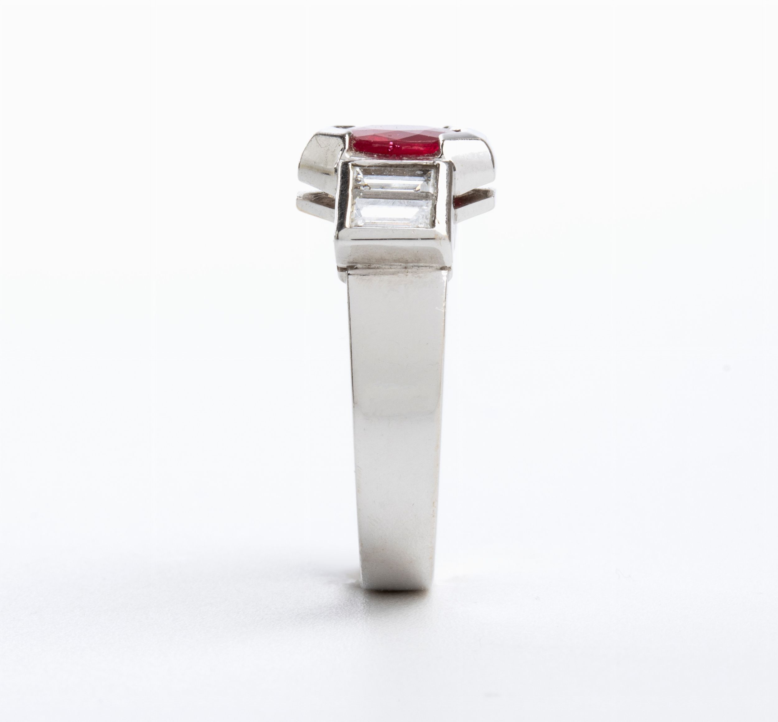 in oro bianco 18k, impreziosito da un rubino centrale affiancato da due coppie di diamanti. N. 01 rubino di forma ovale, taglio composito, circa 1.10 ct. N. 04 diamanti di forma rettangolare, taglio a gradini, circa 0.60 ct, G-H, VVS. Punzonato '750'. Misura ITA 15 - Misura USA 7. Peso: 6 gr. Stato di conservazione: **** buono.