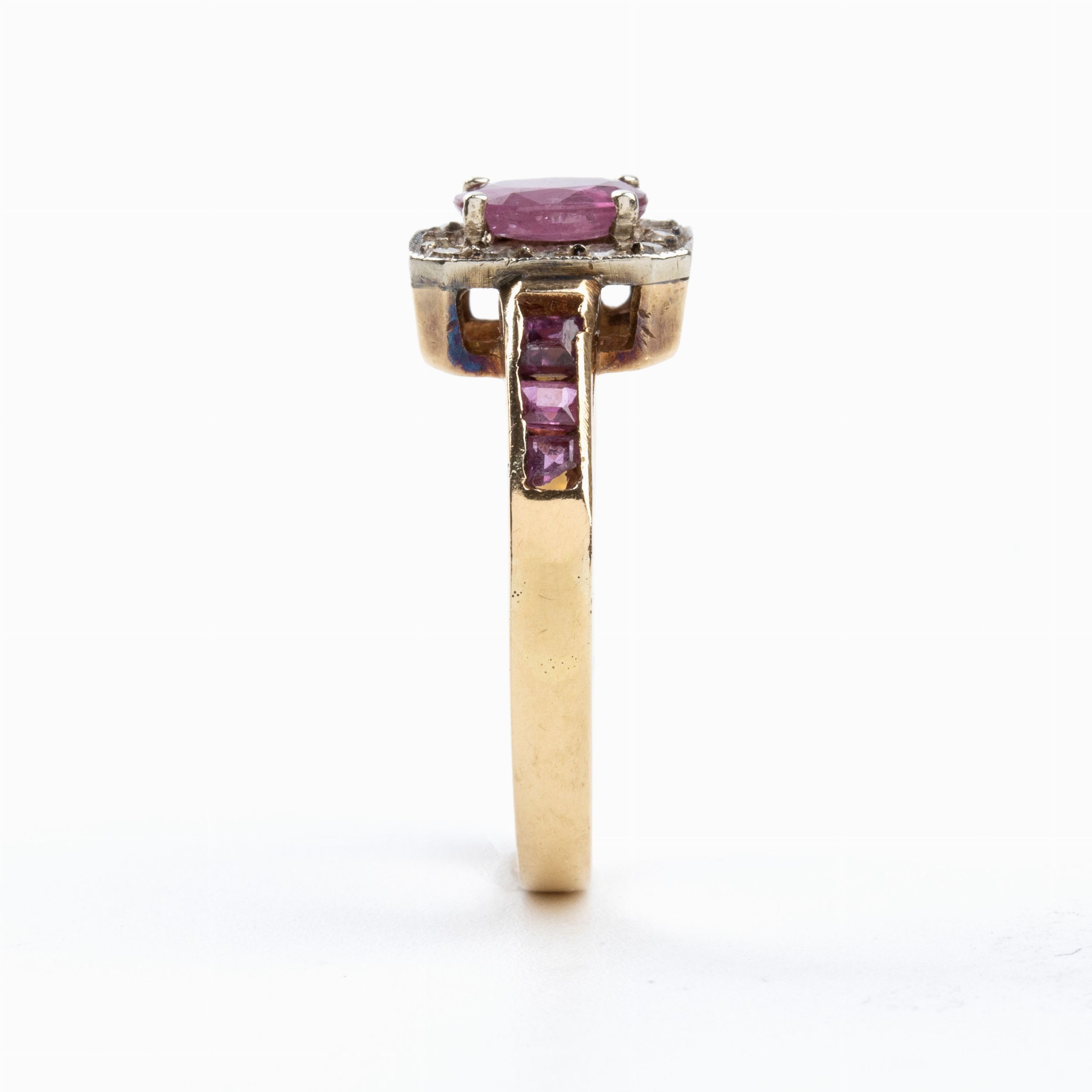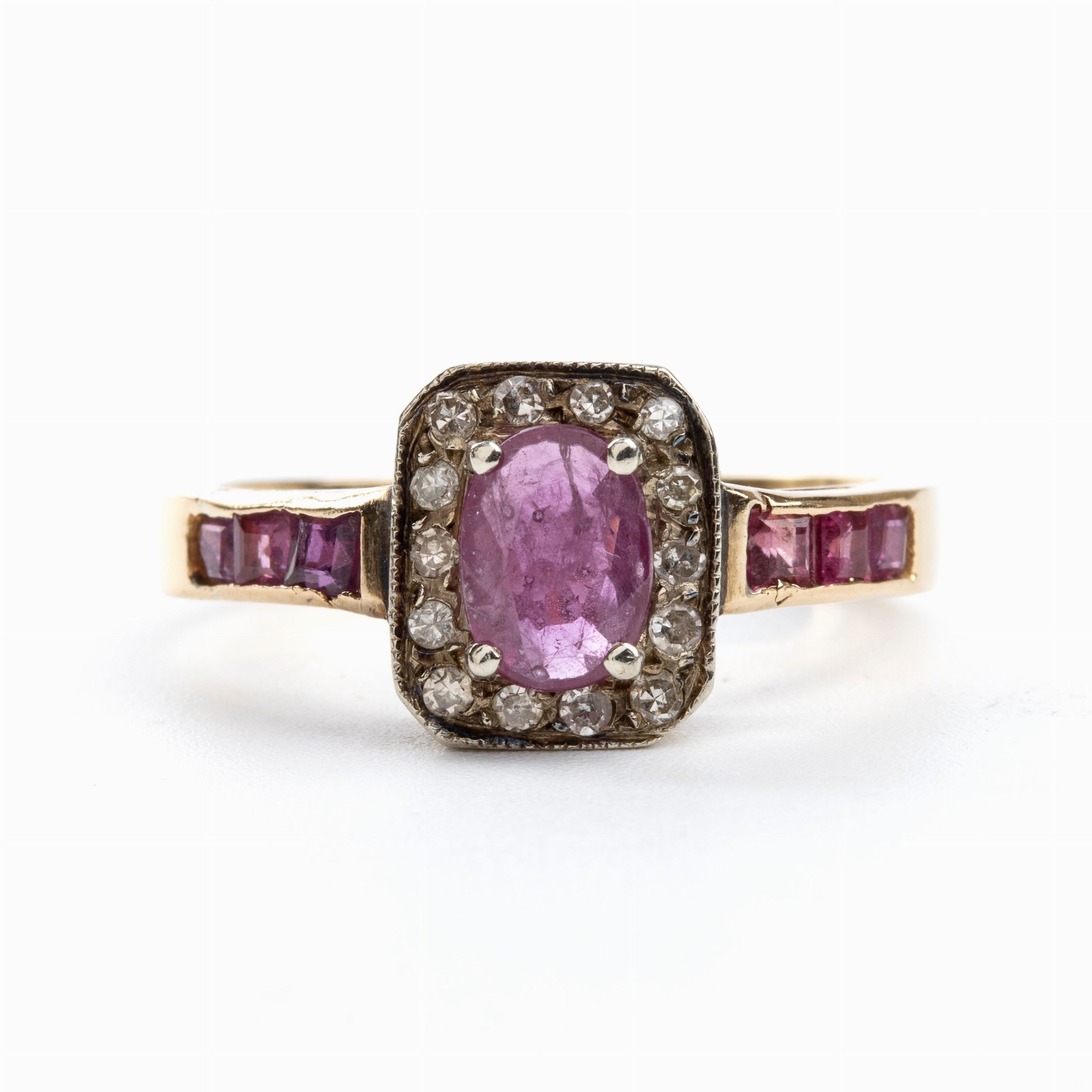 in oro giallo ed oro bianco 18k, incastonato con rubino incorniciato da diamanti. N. 01 rubino di forma ovale, taglio composito, circa 1.00 ct. N. 14 diamanti di forma rotonda, taglio huit-huit, circa 0.25 ct, J-K, SI. Punzonato '750'. Misura IT 16 - Misura US 8. Peso: 4,8 gr. Stato di conservazione: **** buono.