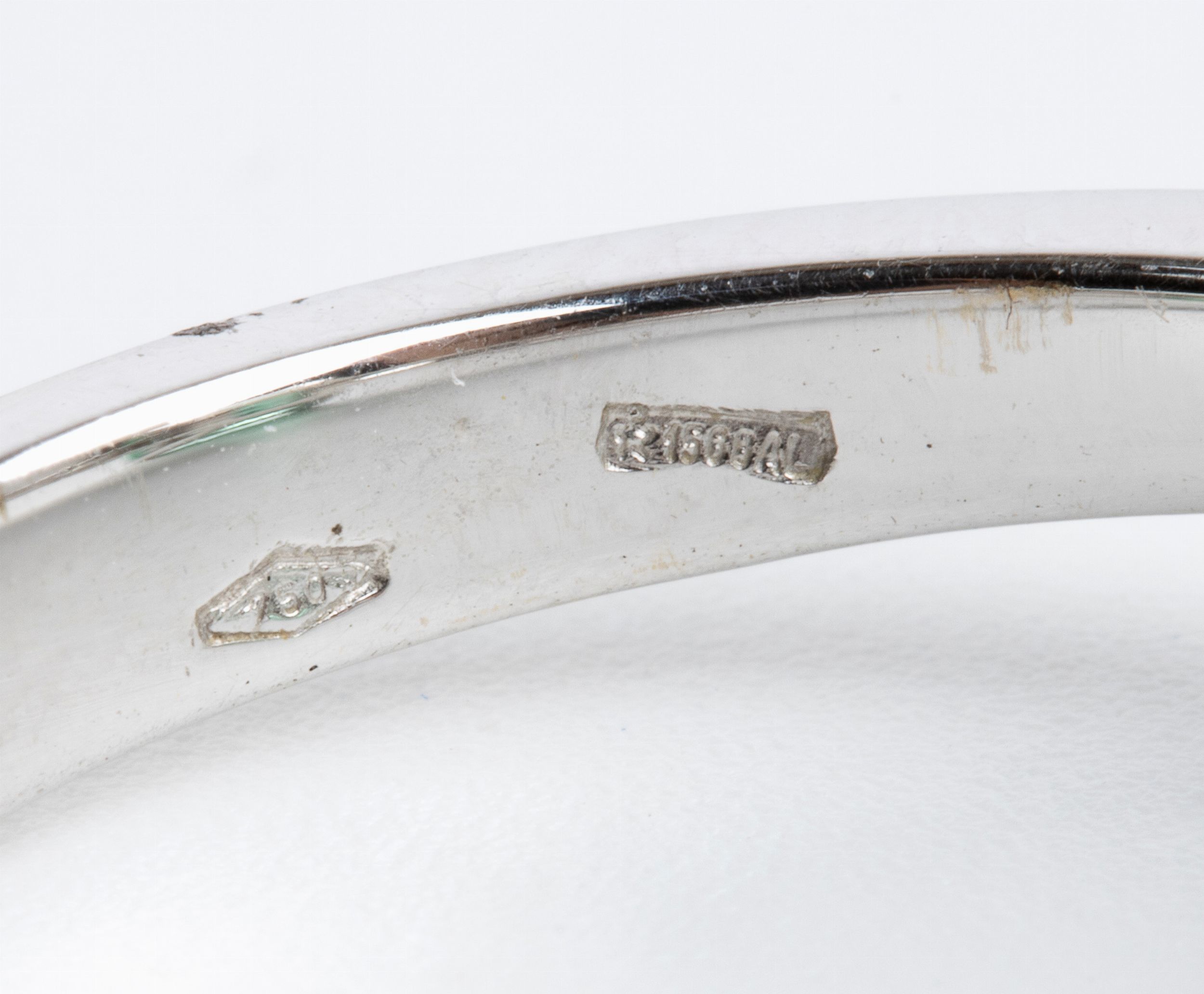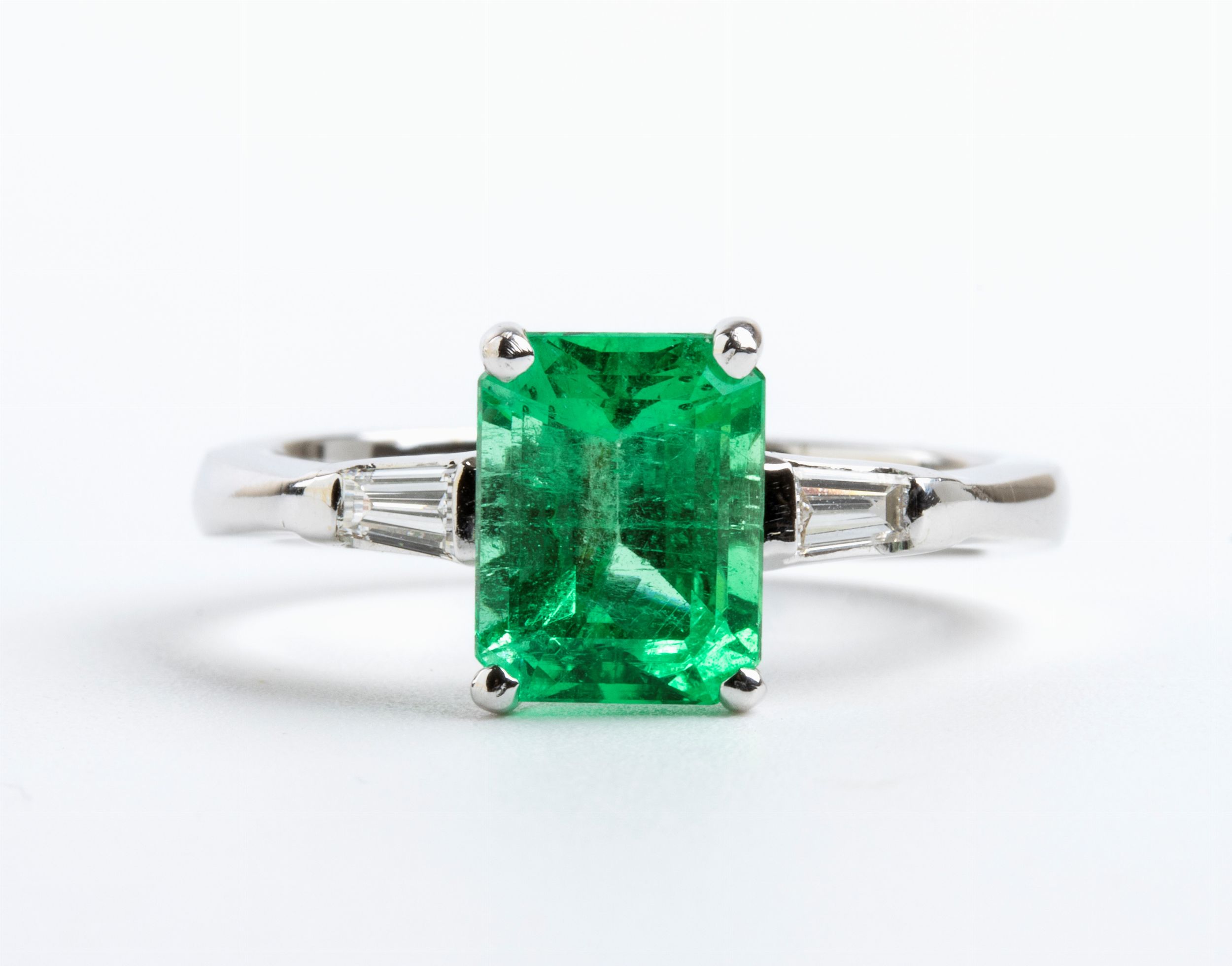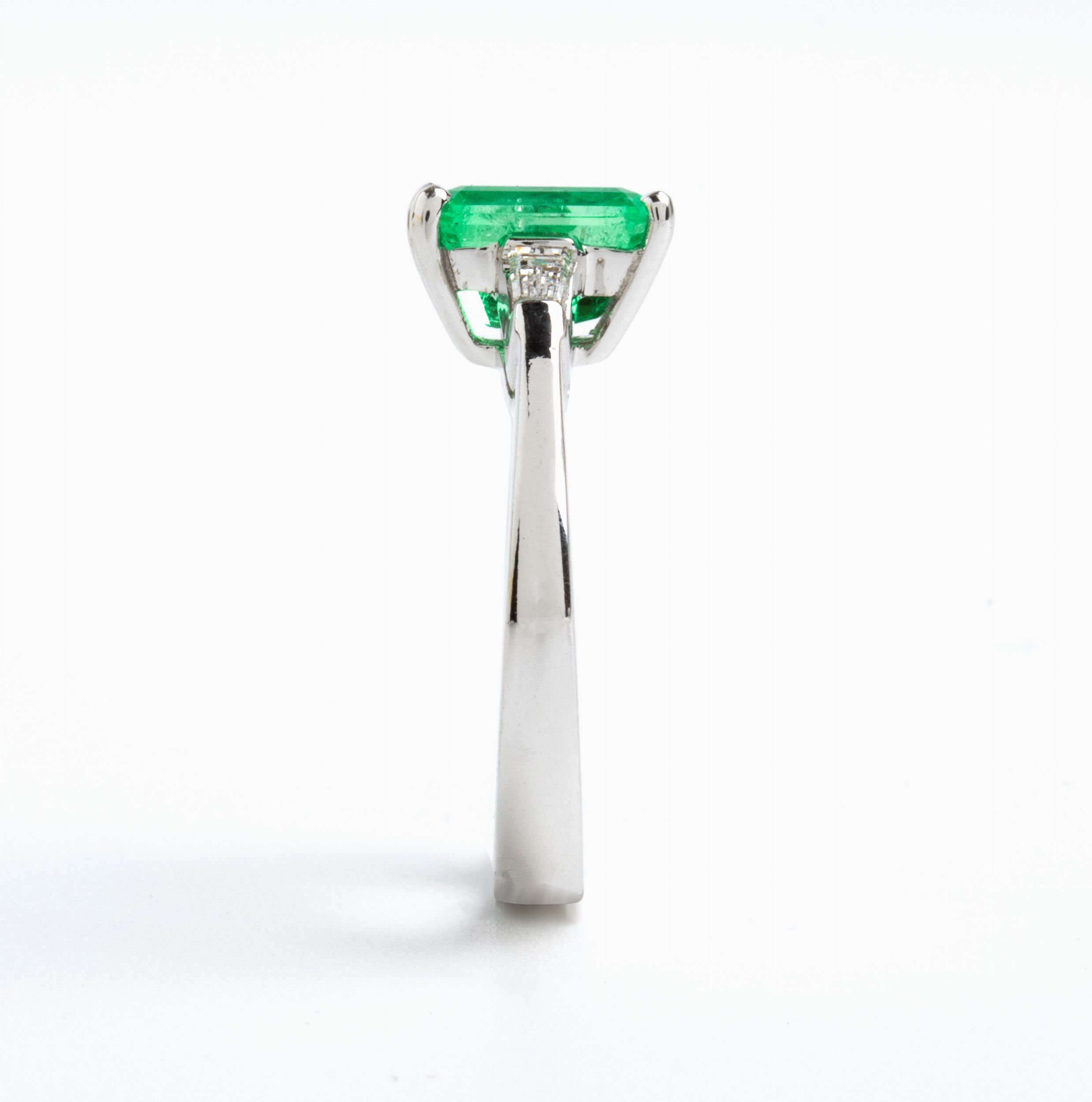 in oro bianco 18k. N. 01 smeraldo di forma ottagonale, taglio a gradini, circa 1.90 ct. N. 02 diamanti di forma trapezoidale, taglio a gradini, circa 0.20 ct, F-G, VVS-VS. Punzonato '750 - 1566 AL'. Misura ITA 16 - Misura USA 7. Peso 5,5 gr. Stato di conservazione: ***** eccellente.