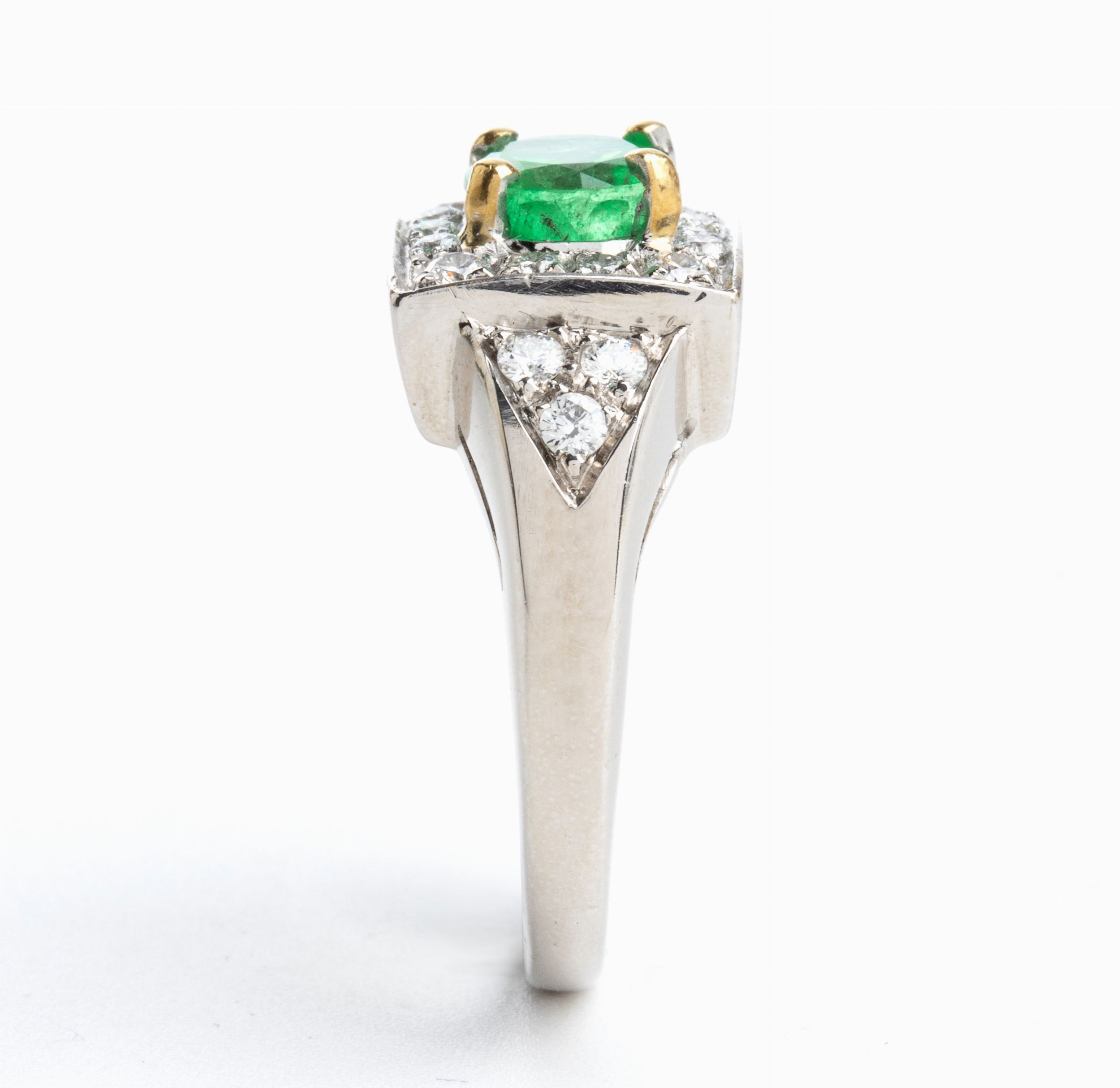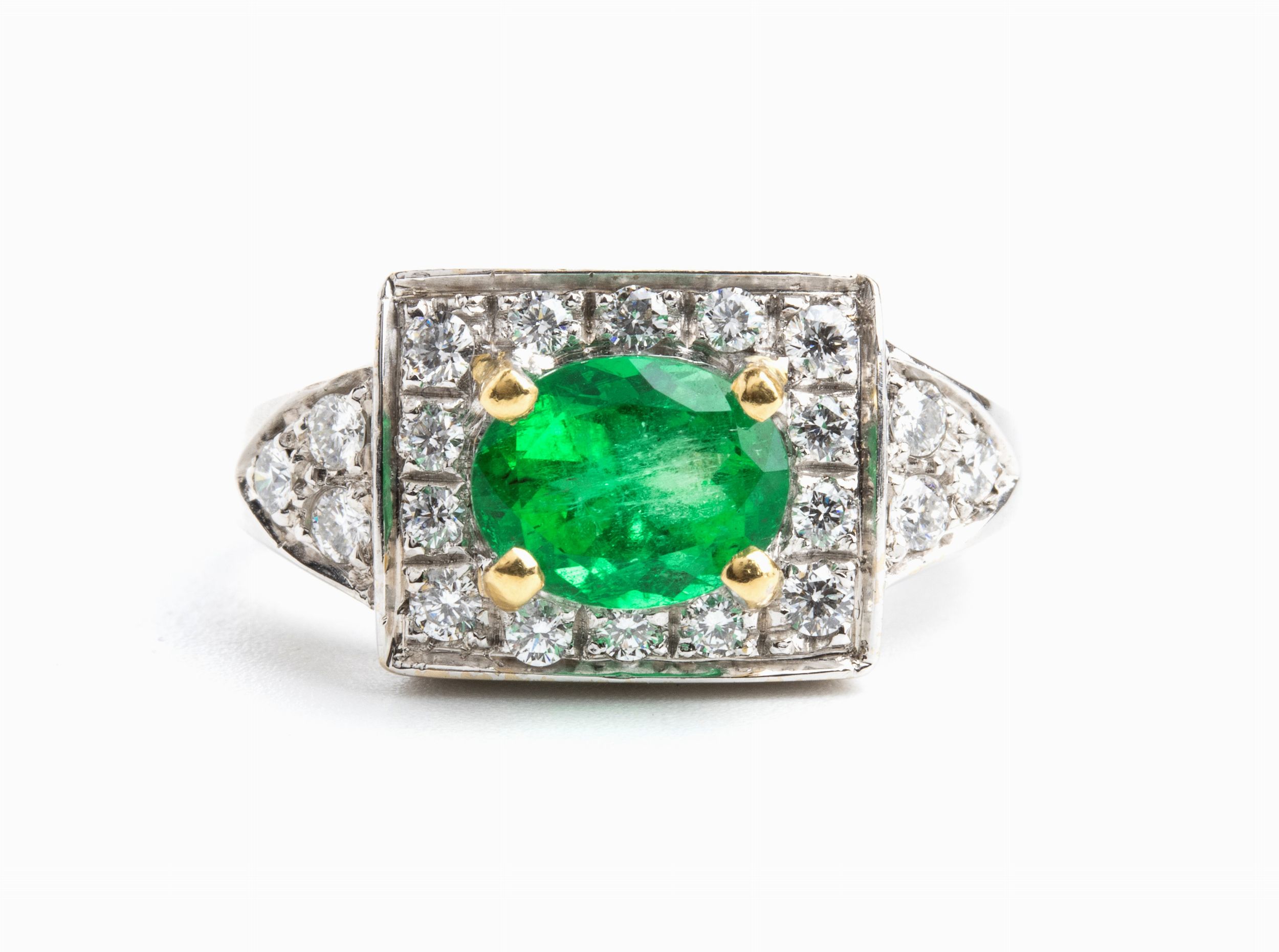 in oro bianco 18k, incastonato con smeraldo ovale contornato da pavè di diamanti. N. 01 smeraldo di forma ovale, taglio composito, circa 2.00 ct. N. 20 diamanti di forma rotonda, taglio brillante, circa 0.90 ct, F-G, VVS-VS. Punzonato '750'. Misura IT 19 - Misura US 8.5 Peso: 9.6 gr. Stato di conservazione: **** buono.