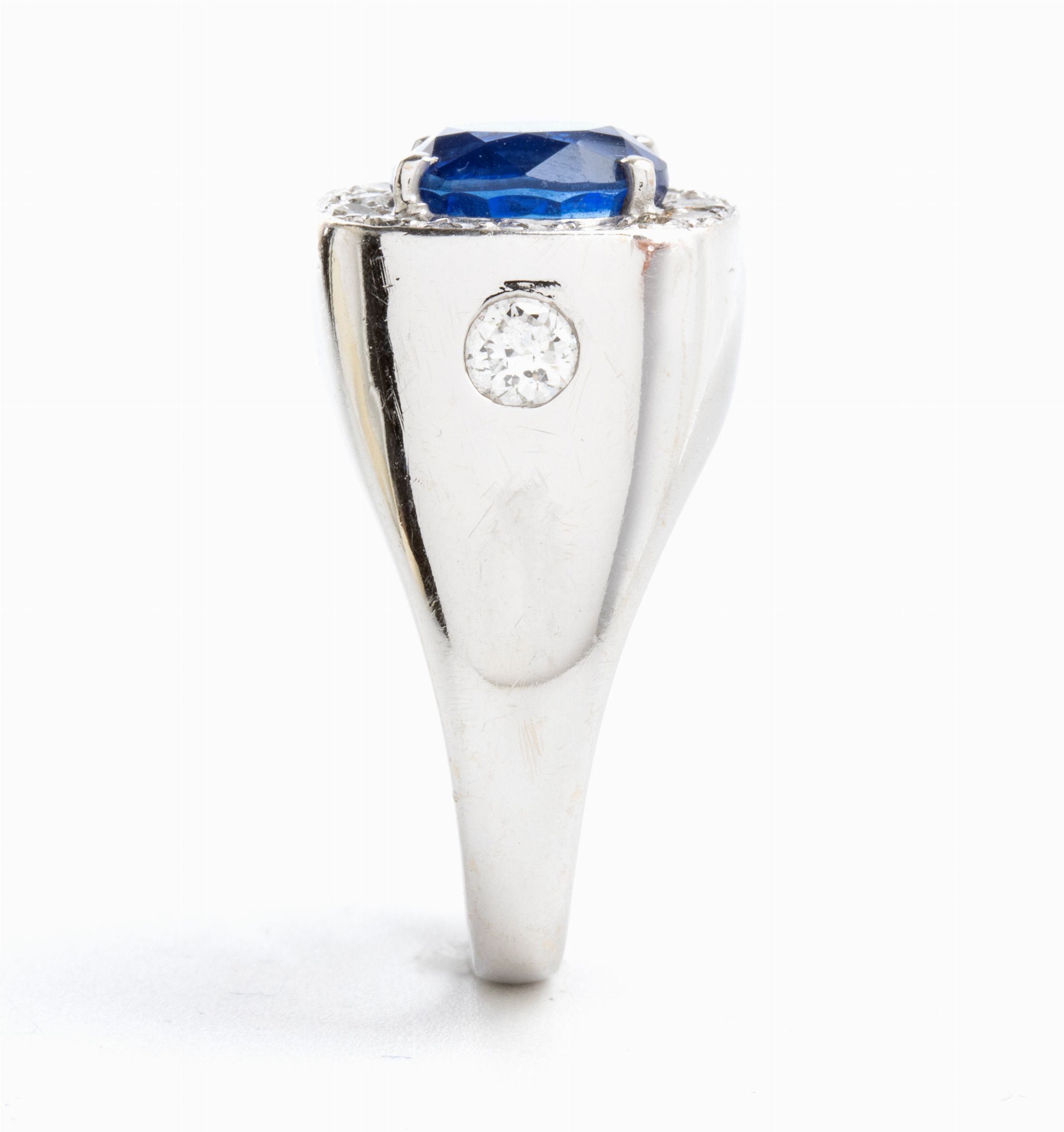 modellato come una fascia, incastonato con zaffiro ovale tra cornice di diamanti. N. 01 zaffiro di forma ovale, taglio composito, circa 4.01 ct, origine: Ceylon; evidenza di trattamento termico. N. 18 diamanti di forma rotonda, taglio brillante, circa 1.80 ct, F-G, VVS-VS. Misura ITA 22 - Misura USA 10. Peso: 10.1 gr. Stato di conservazione: **** buono.