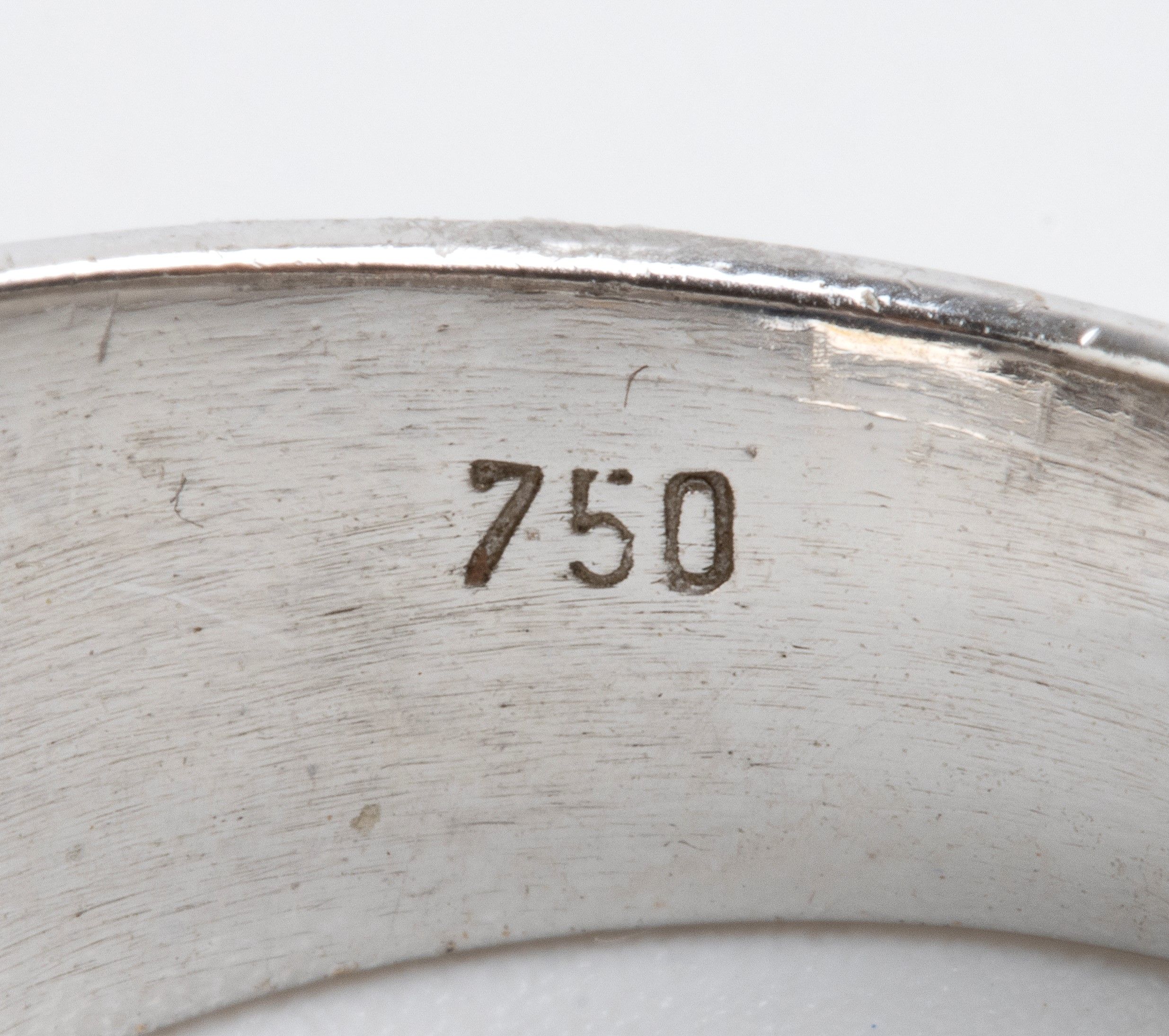 fascia in oro bianco 18k, incastonato con uno zaffiro ovale di circa 1.40 ct, affiancato da pavé di n. 44 diamanti, forma rotonda, taglio brillante per circa 0.70 ct, F-G, VVS-VS. Punzonato '750'. Misura ITA 9 - Misura USA 4 1/2. Peso: 7 gr. Stato di conservazione: **** buono.