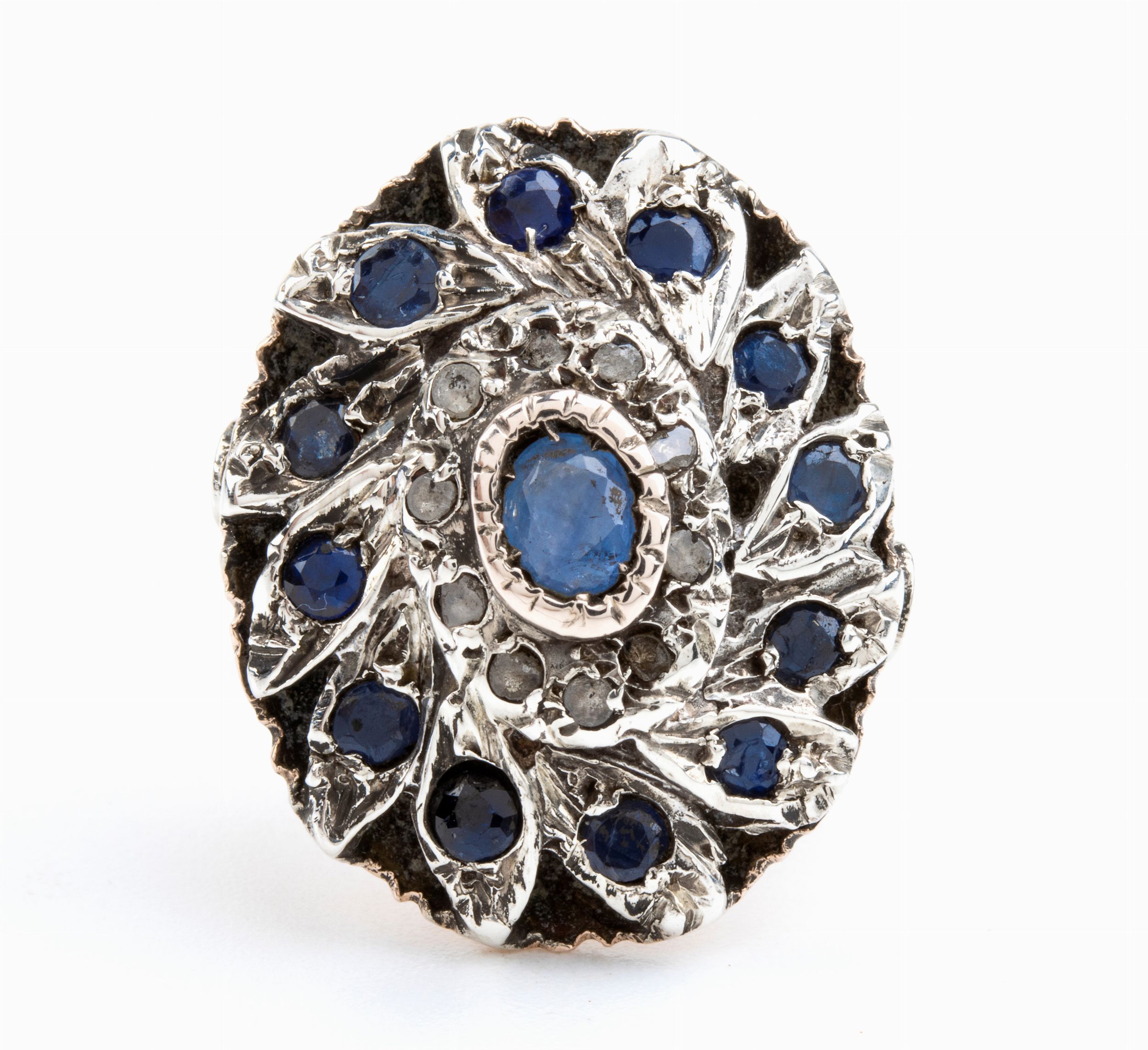 montatura ovale a motivo floreale impreziosita da diamanti taglio a rosa e zaffiri.  Misura ITA 18 - Misura USA 8. Peso 6,7 gr. Stato di conservazione: **** buono.