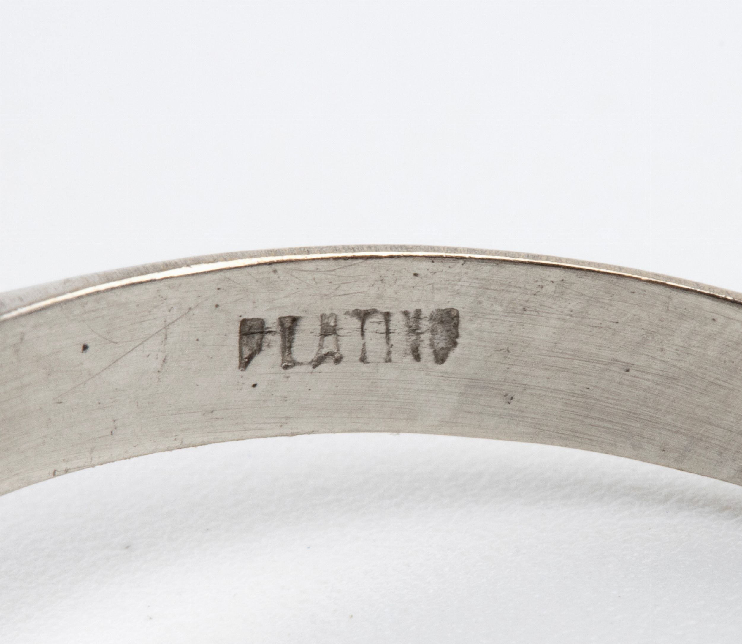 diamante centrale di forma rotonda, taglio brillante, circa 0.45 ct, H-I, VS, contorno di n. 06 diamanti di forma rotonda, taglio brillante e taglio huit-huit, circa 0.15 ct, H, VVS-VS Punzonato 'PLATINO'. Misura ITA 15 - Misura USA 7 1/2. Peso: 5,4 gr. Stato di conservazione: **** buono.