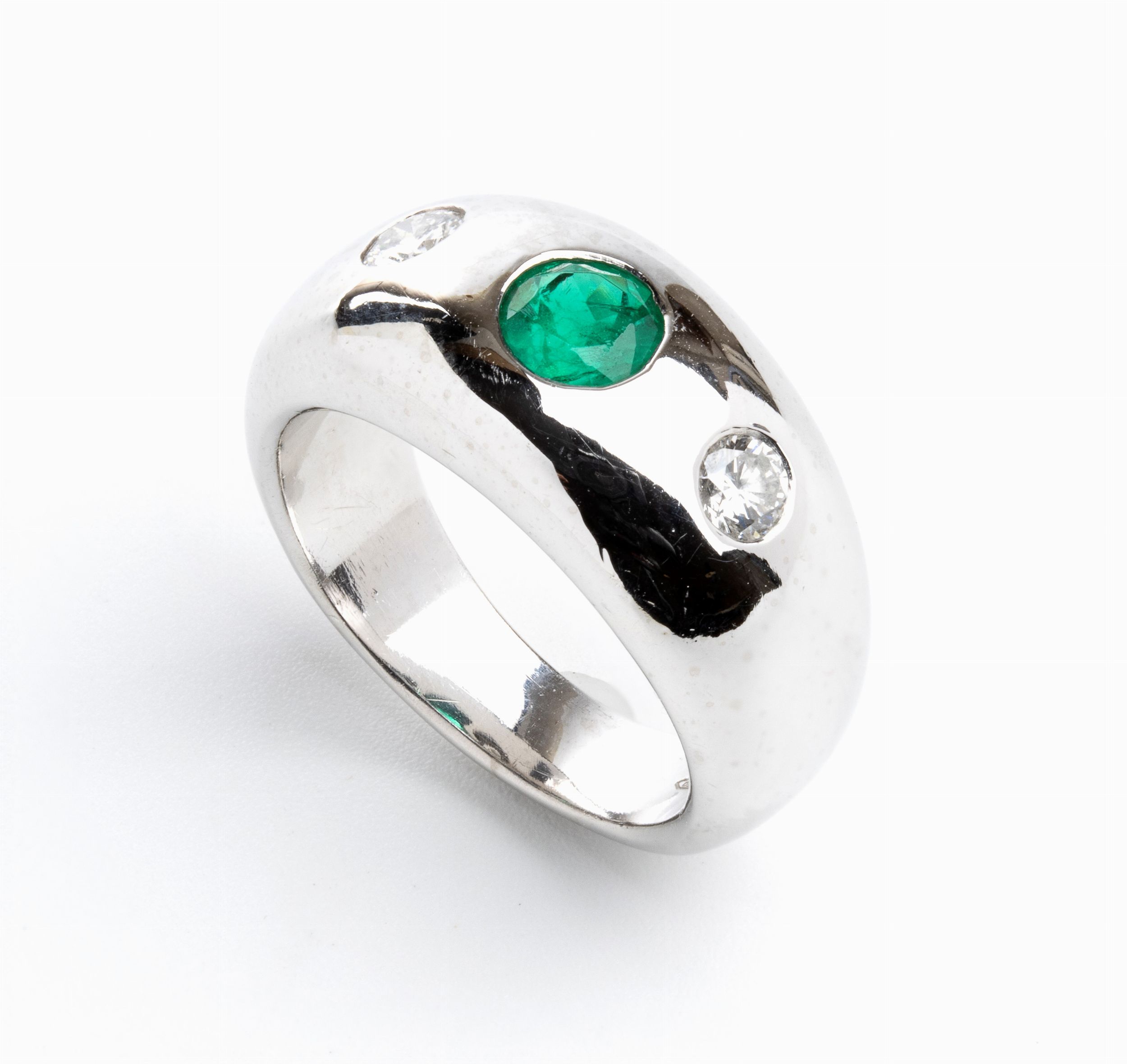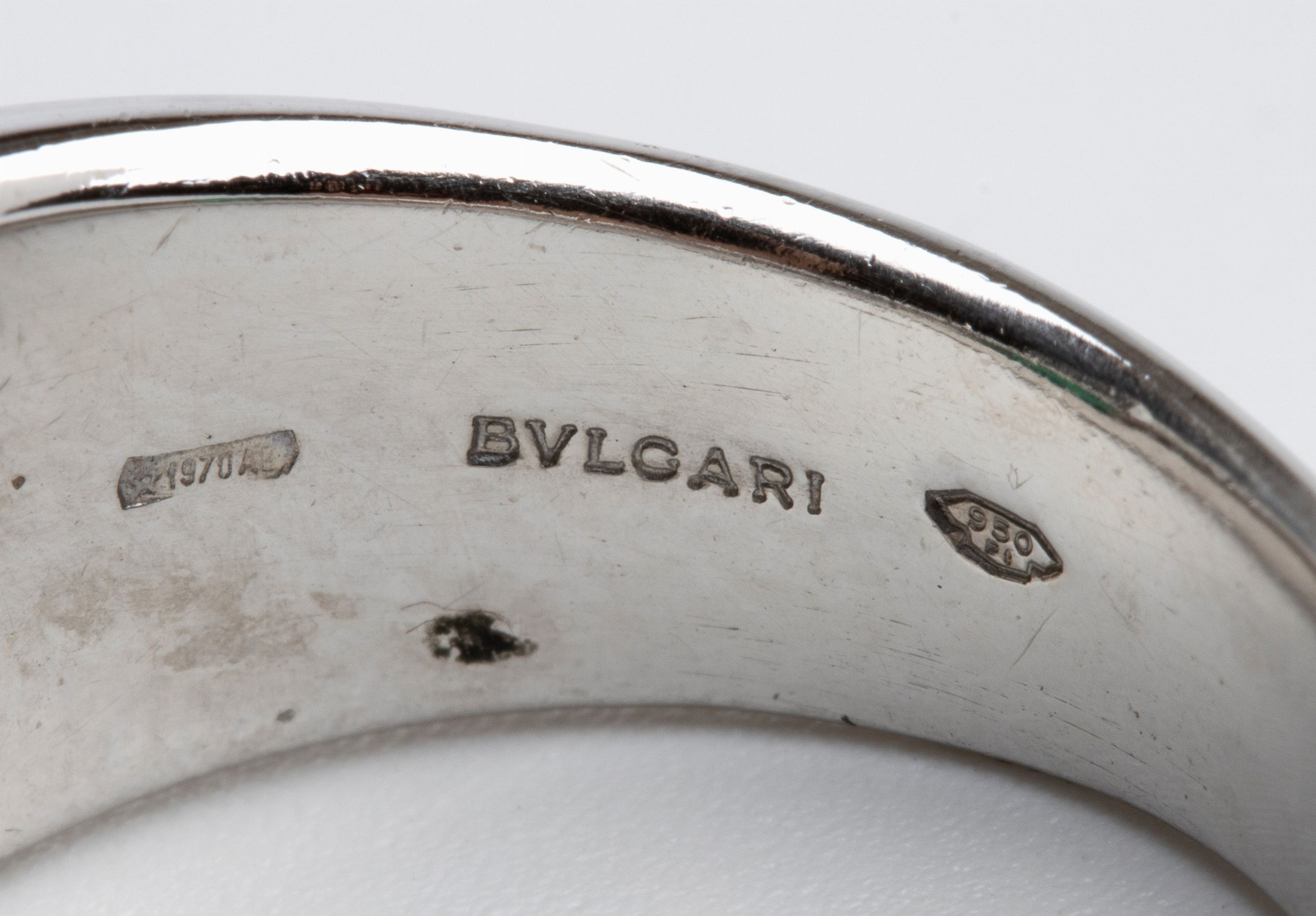 in platino, decorato con n. 02 diamanti di forma rotonda, taglio brillante, circa 0.20 ct, e n. 01 smeraldo di forma rotonda, taglio composito, circa 0.40 ct. Punzonato '950 PT - 1970 AL -BULGARI'. Misura ITA 14 - Misura USA 6 1/2. Peso: 18,7 g. Stato di conservazione: ***** eccellente.