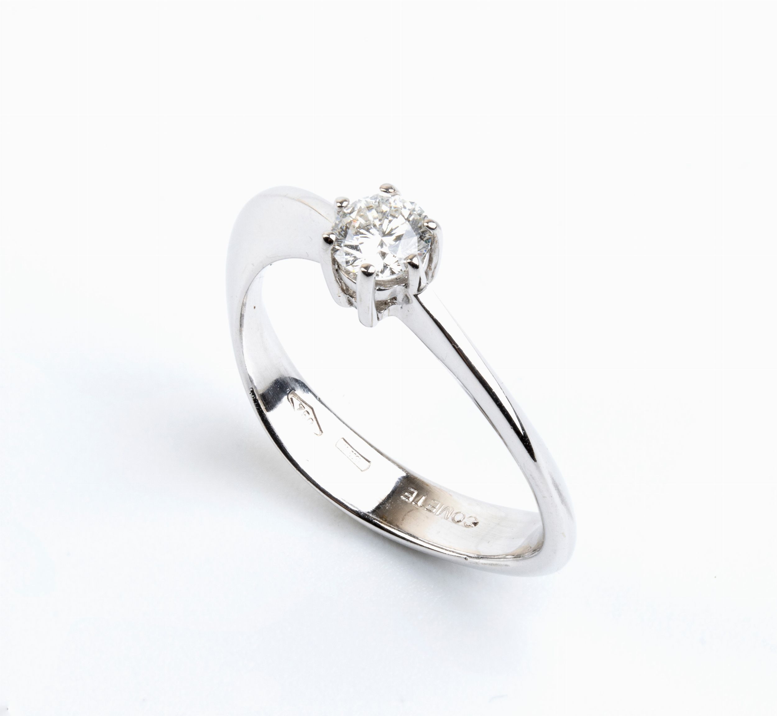 in oro bianco 18k, incastonato con diamante. Firmato COMETE. N. 01 diamante di forma rotonda, taglio brillante, circa 0.30 ct, F-G, VVS. Punzonato '750 - 1302 VI'. Misura ITA 15 - US 7 1/2. Peso: 4,1 gr. Stato di conservazione: ***** eccellente.