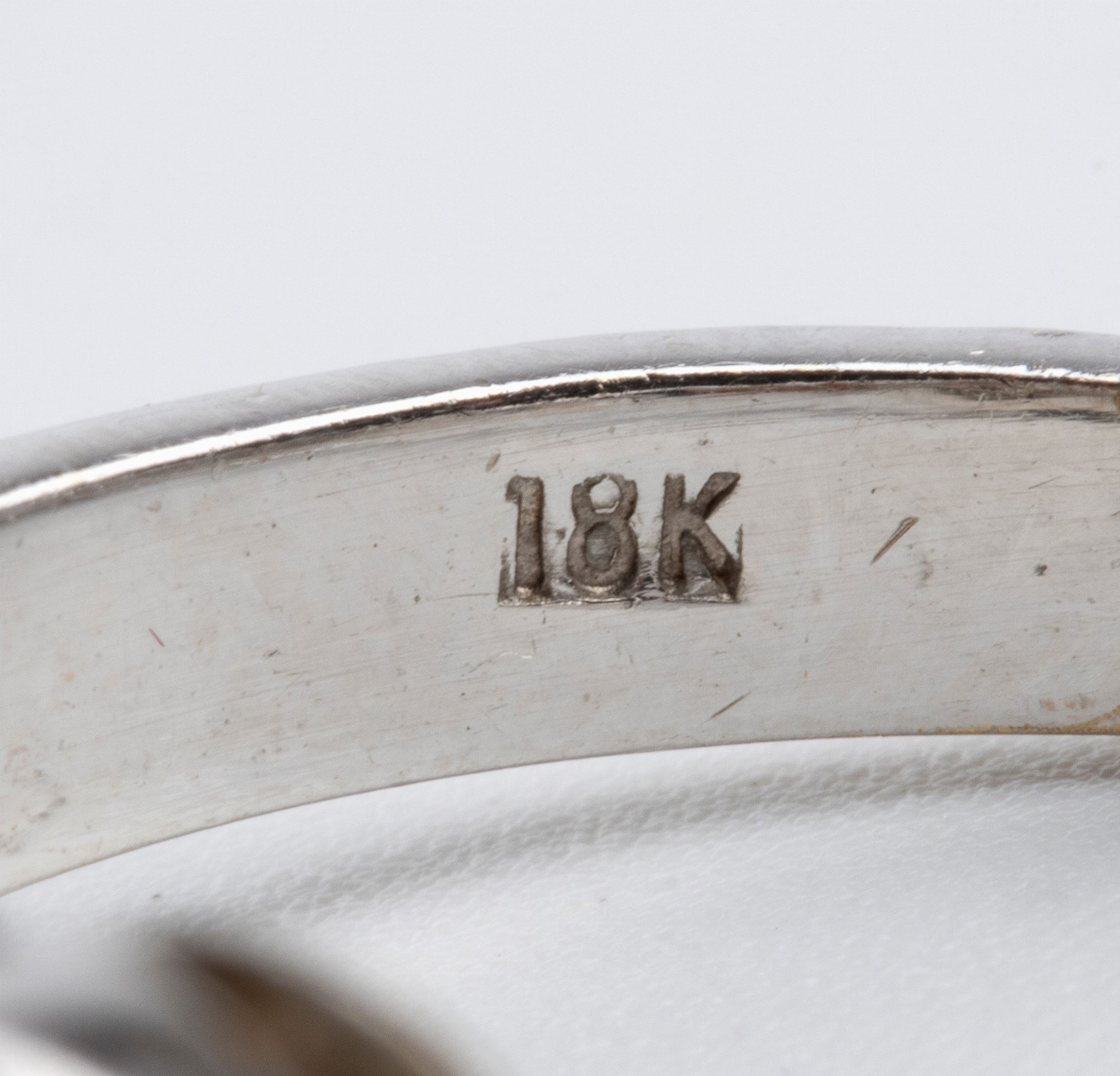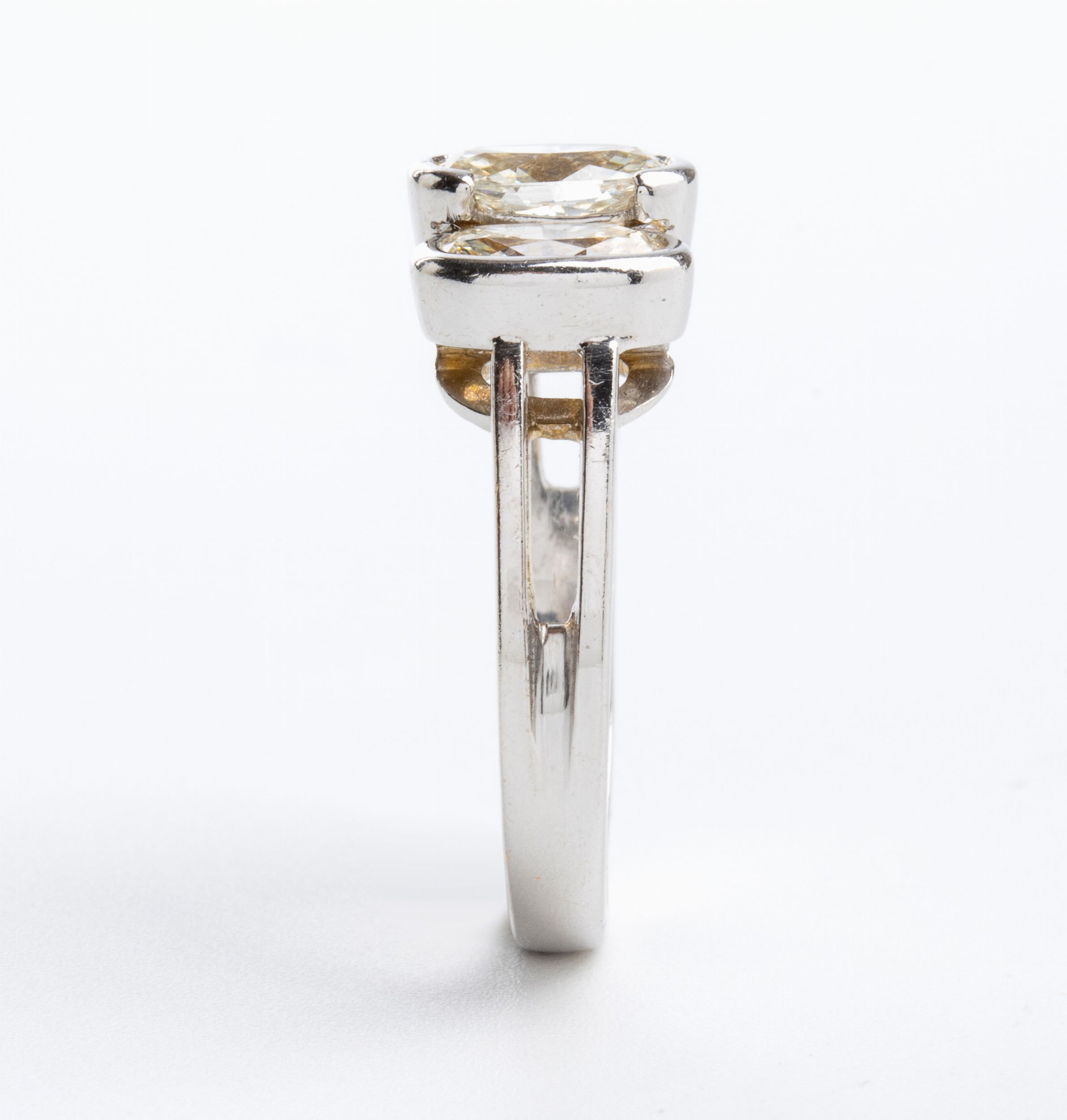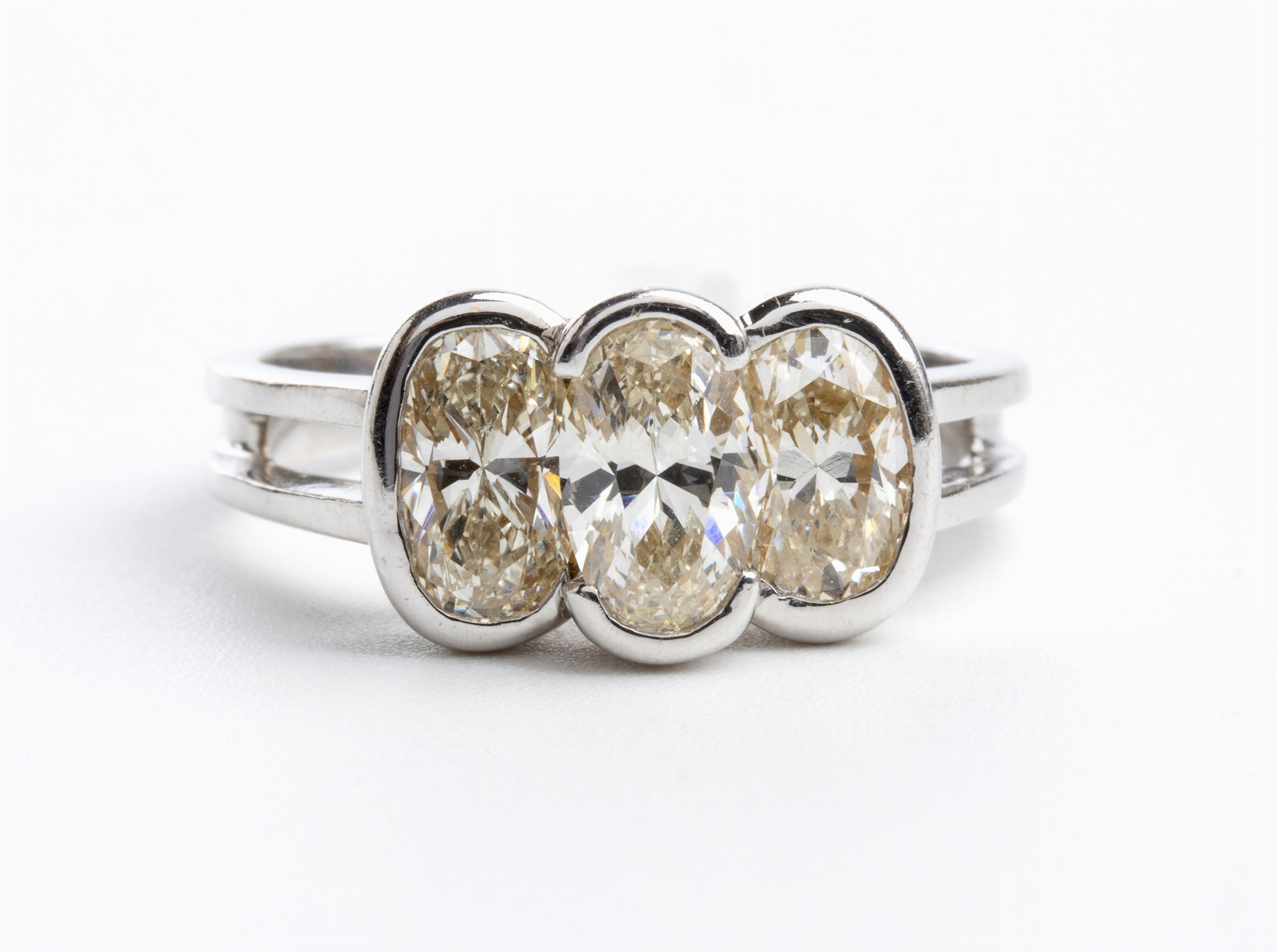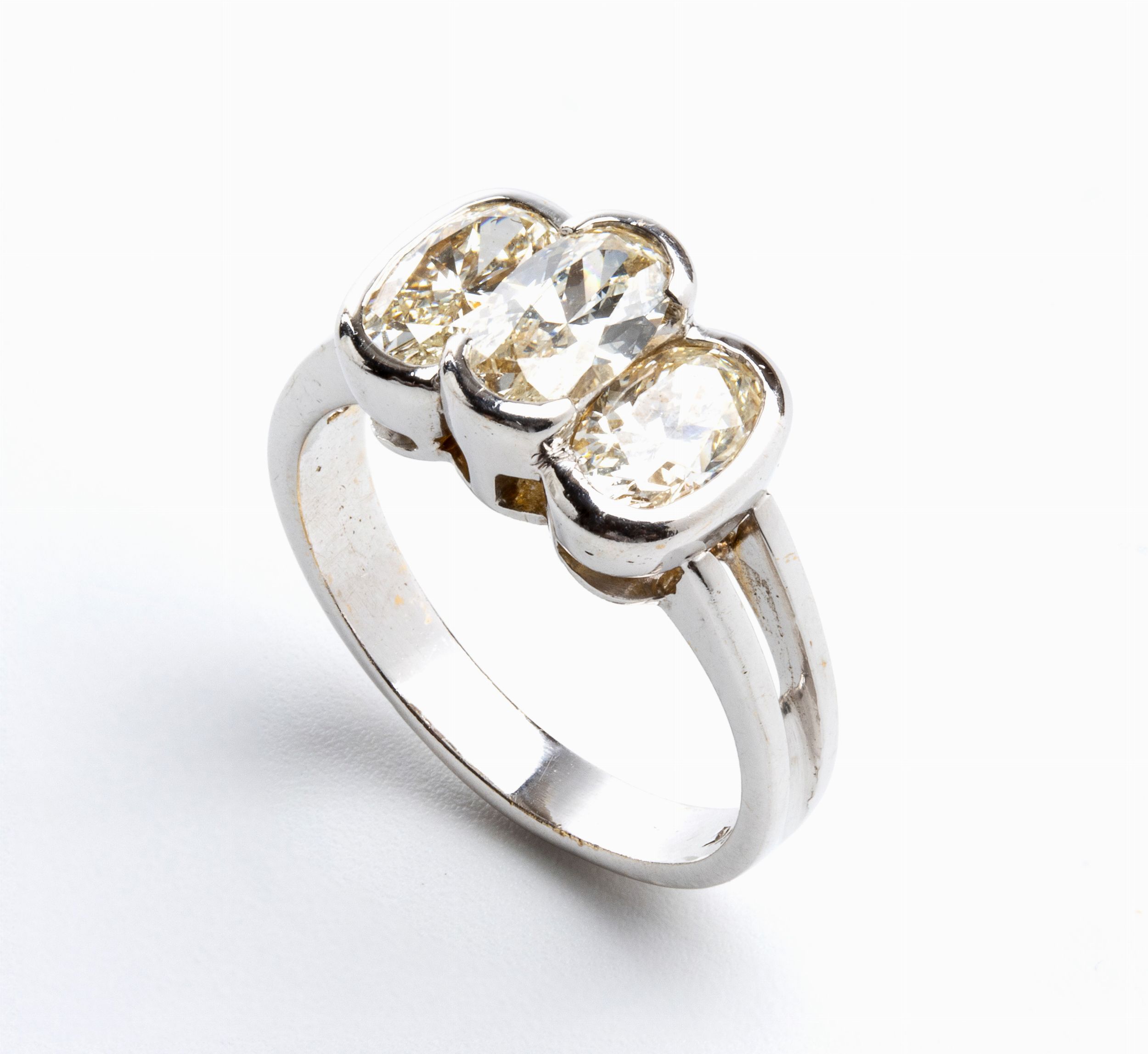 oro bianco 18k, incastonato con tre diamanti. N. 03 diamanti di forma ovale taglio brillante modificato, rispettivamente 0.55 ct; 0.43 ct e 0.45 ct circa, J-K, VVS. Punzonato '18k'. Misura ITA 12 - Misura USA 6. Peso: 5.1 gr. Stato di conservazione: **** buono.