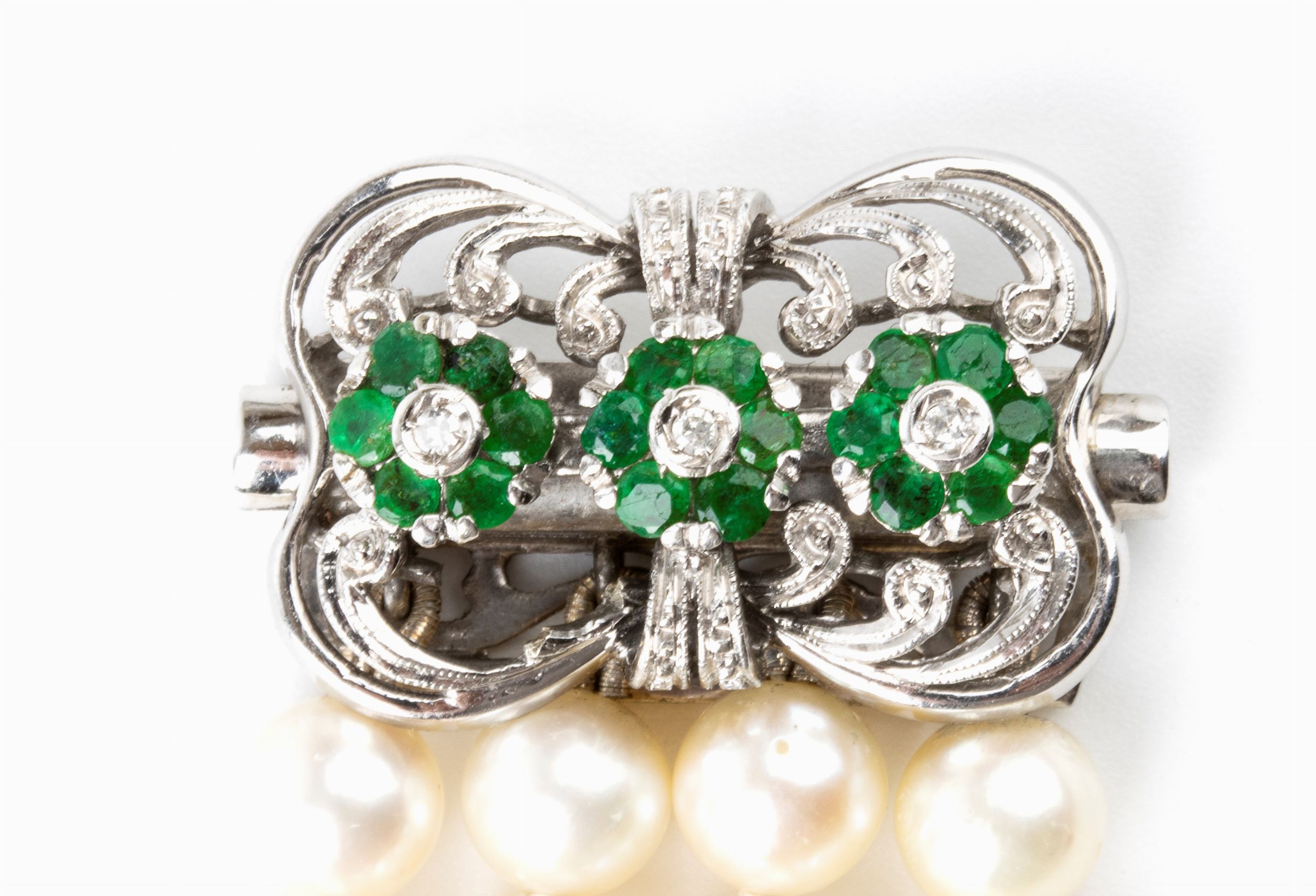 a quattro fili di perle coltivate d'acqua salata con chiusura in oro bianco 18k con tre motivi a fiore in smeraldi e diamanti. Punzonato '750 - 13 AL'. Lunghezza: 18.5 cm.Larghezza: 2.5 cm. Peso 48.5 gr. Stato di conservazione: **** buono.