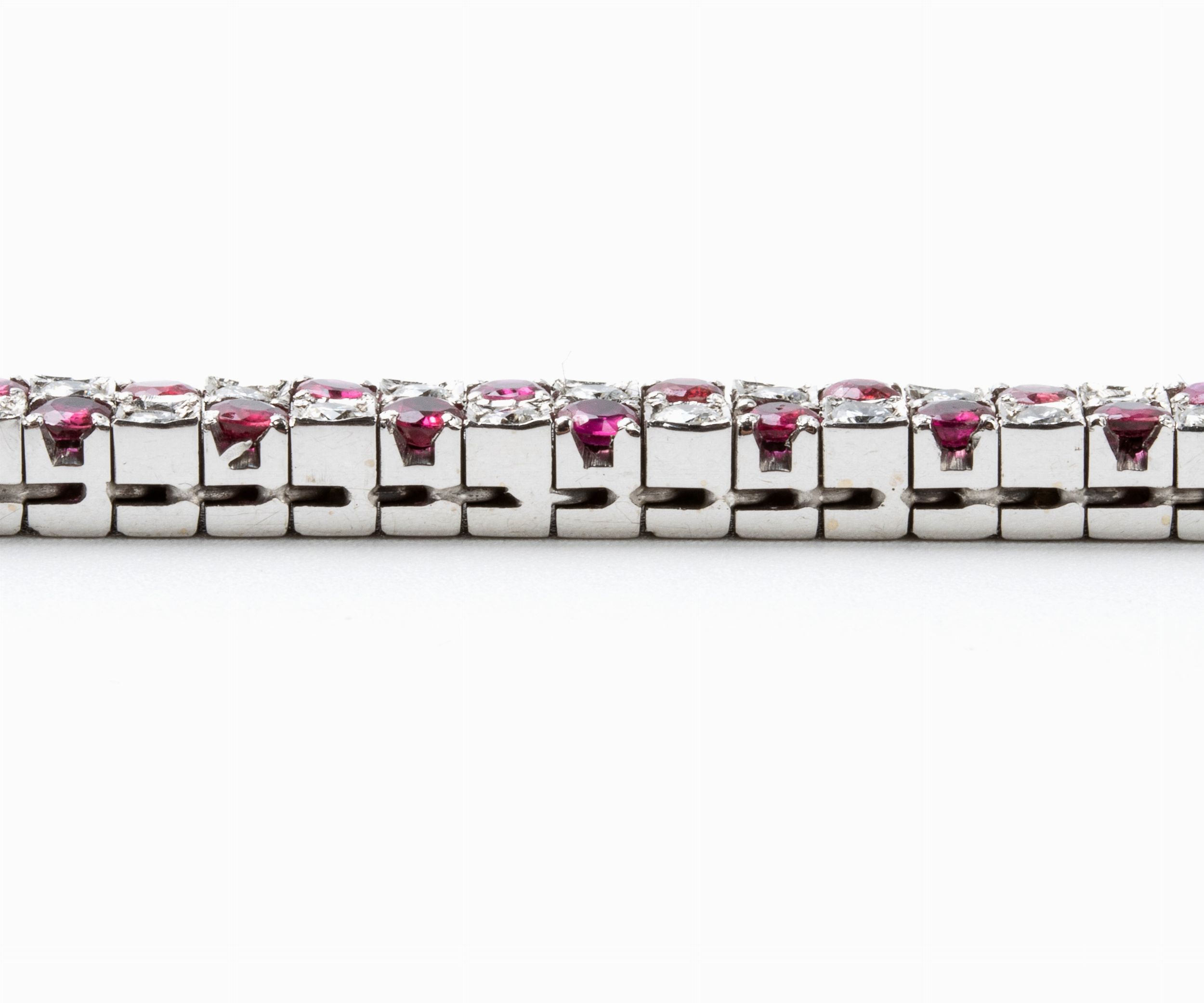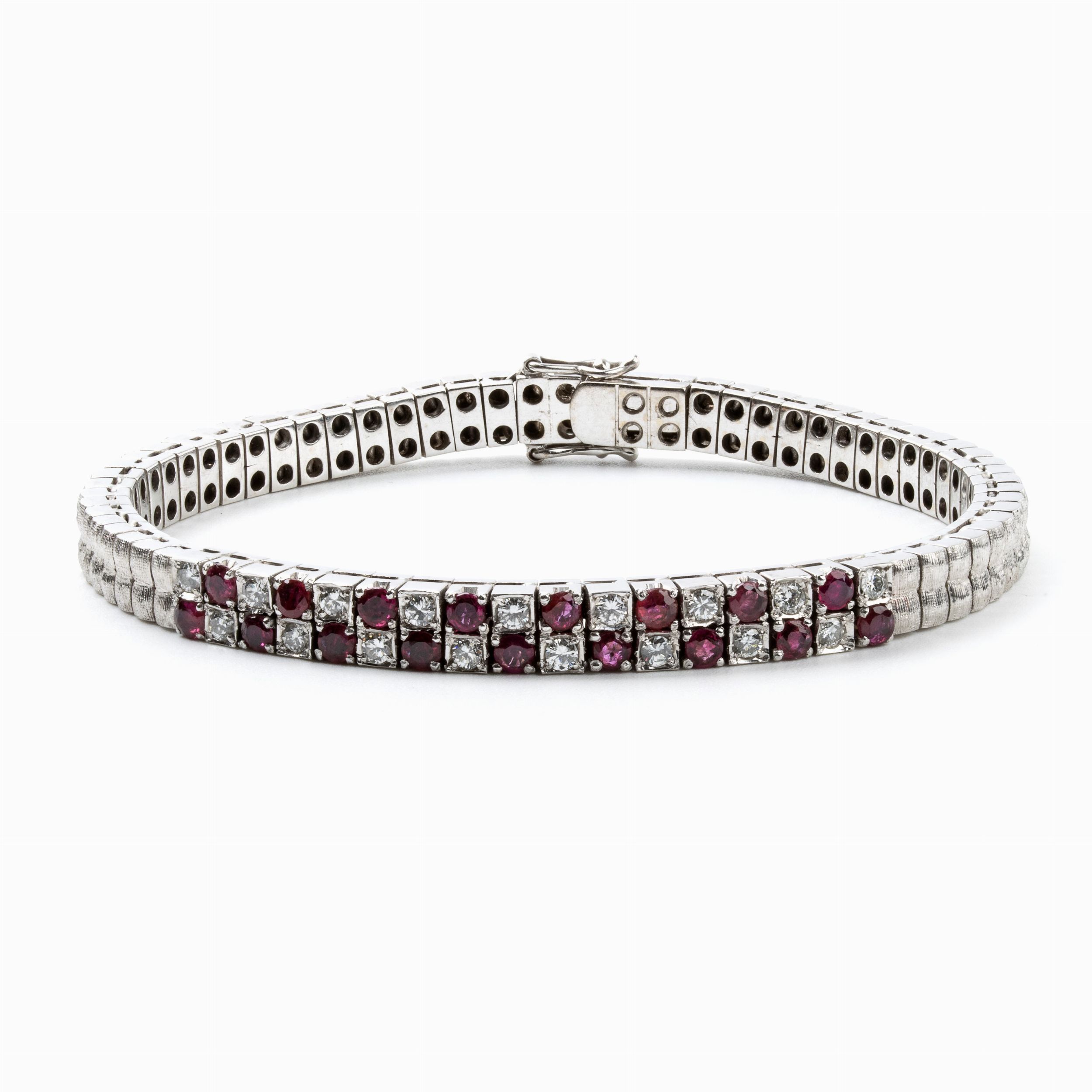 sottile fascia in oro bianco satinato, incastonato nella sezione centrale con rubini e diamanti. N. 17 diamanti di forma rotonda, taglio brillante, circa 0.70 ct, F-G, VVS-VS. Lunghezza: 18 cm. Peso: 35.2 gr. Stato di conservazione: **** buono.