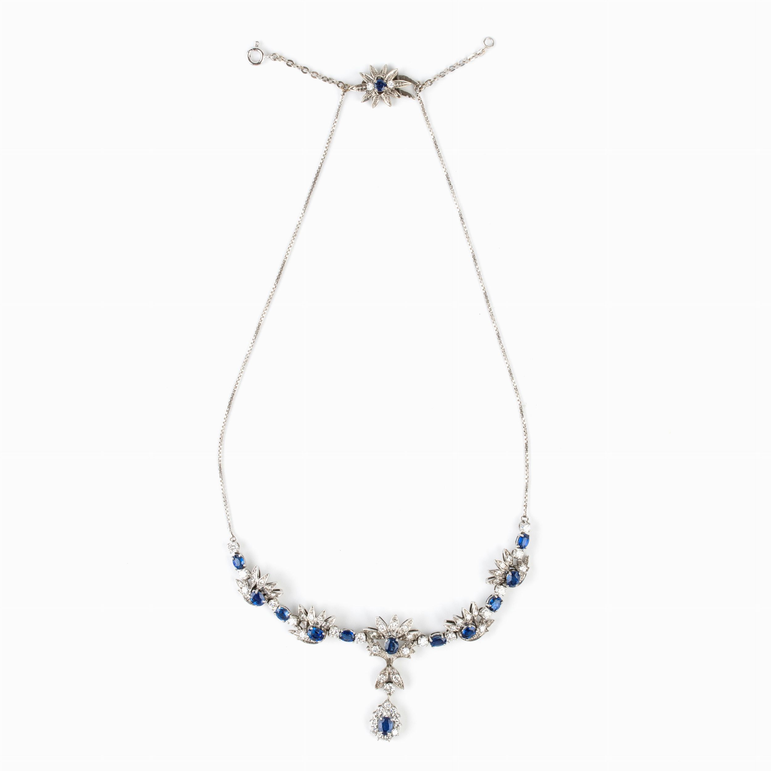 oro bianco 18k, incastonato con n. 13 zaffiri di forma ovale per circa 4.00 ct. e diamanti rotondi taglio brillante per circa 3.10 ct, G-H, VS-SI. Lunghezza 42 cm. Peso: 22 g. Stato di conservazione: **** buono.