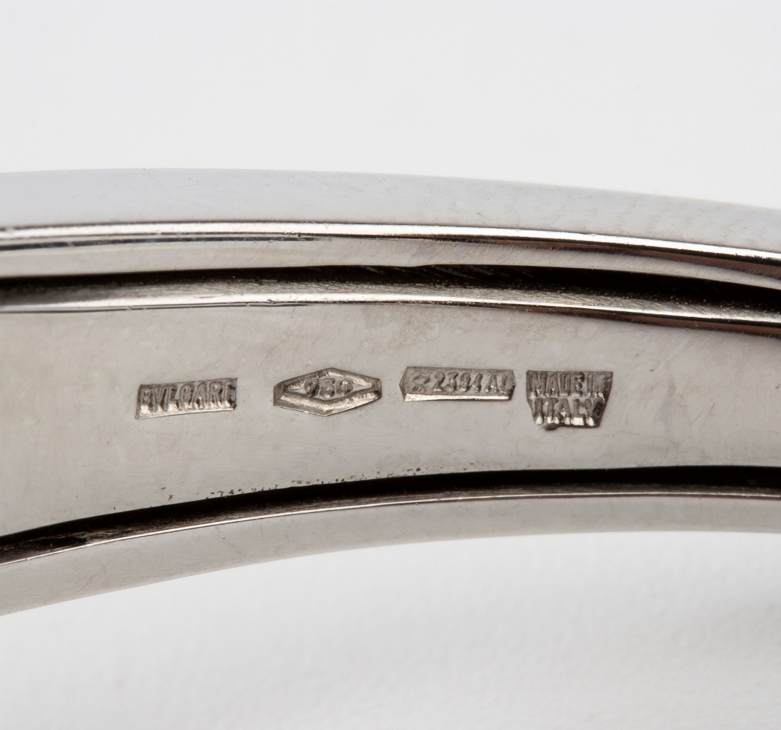 in oro bianco 18k, motivi geometrici circolari a raffigurare una galassia. Firmato BVLGARI. Punzonato '750 - 2394 AL - Made in Italy - Bulgari'. Diametri interni: 5 x 5,5 cm. Peso: 36 g. Stato di conservazione: ***** eccellente.