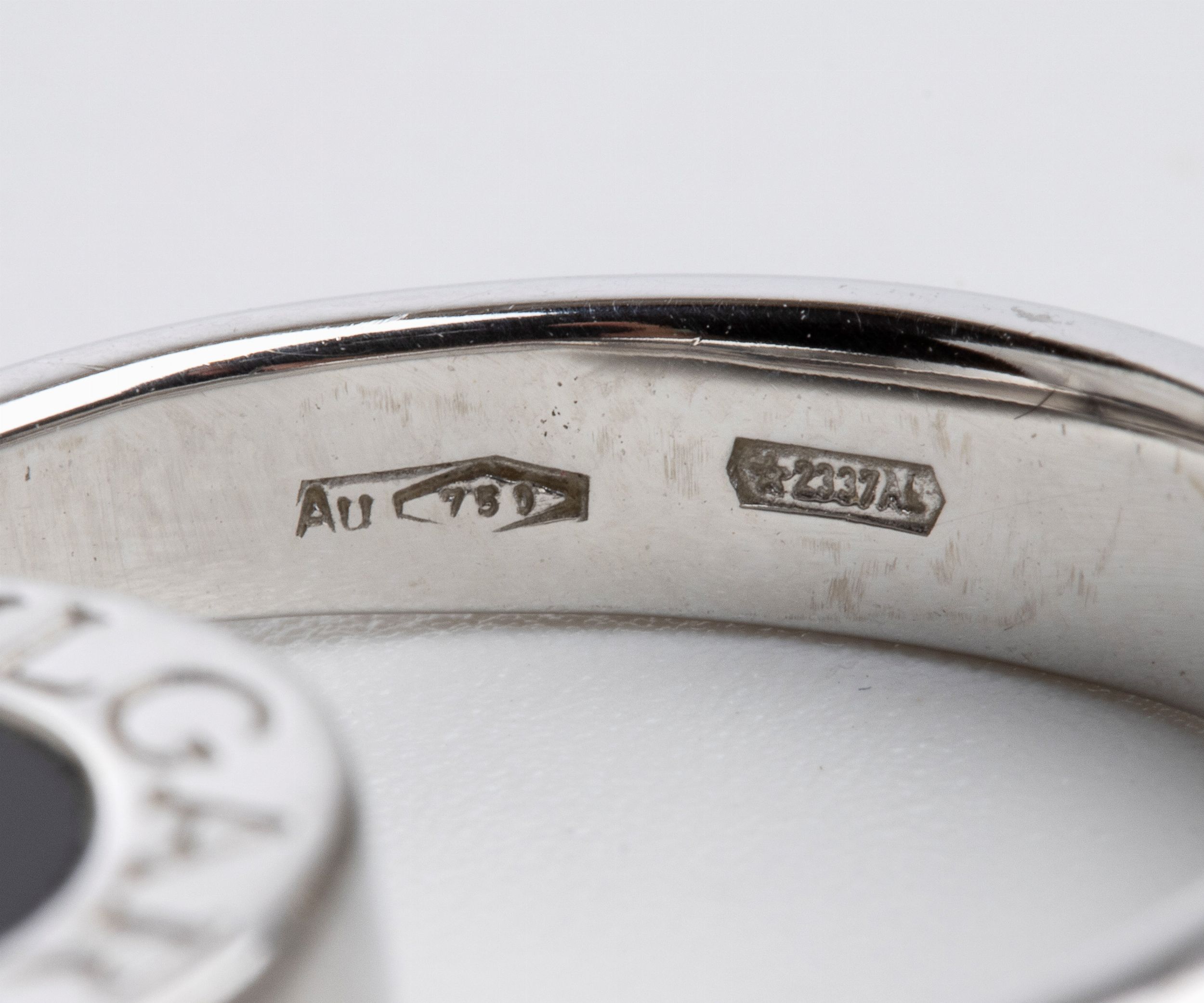 in oro bianco 18k. Firmato BVLGARI N. 07 diamanti di forma rotonda, taglio brillante, circa 0.07 ct, F-G, IF-VVS. Punzonato '750 - 49 - 2337 AL - MADE IN ITALY'. Misura IT 6 - Misura US 4. Peso: 6 gr. Stato di conservazione: ***** eccellente.