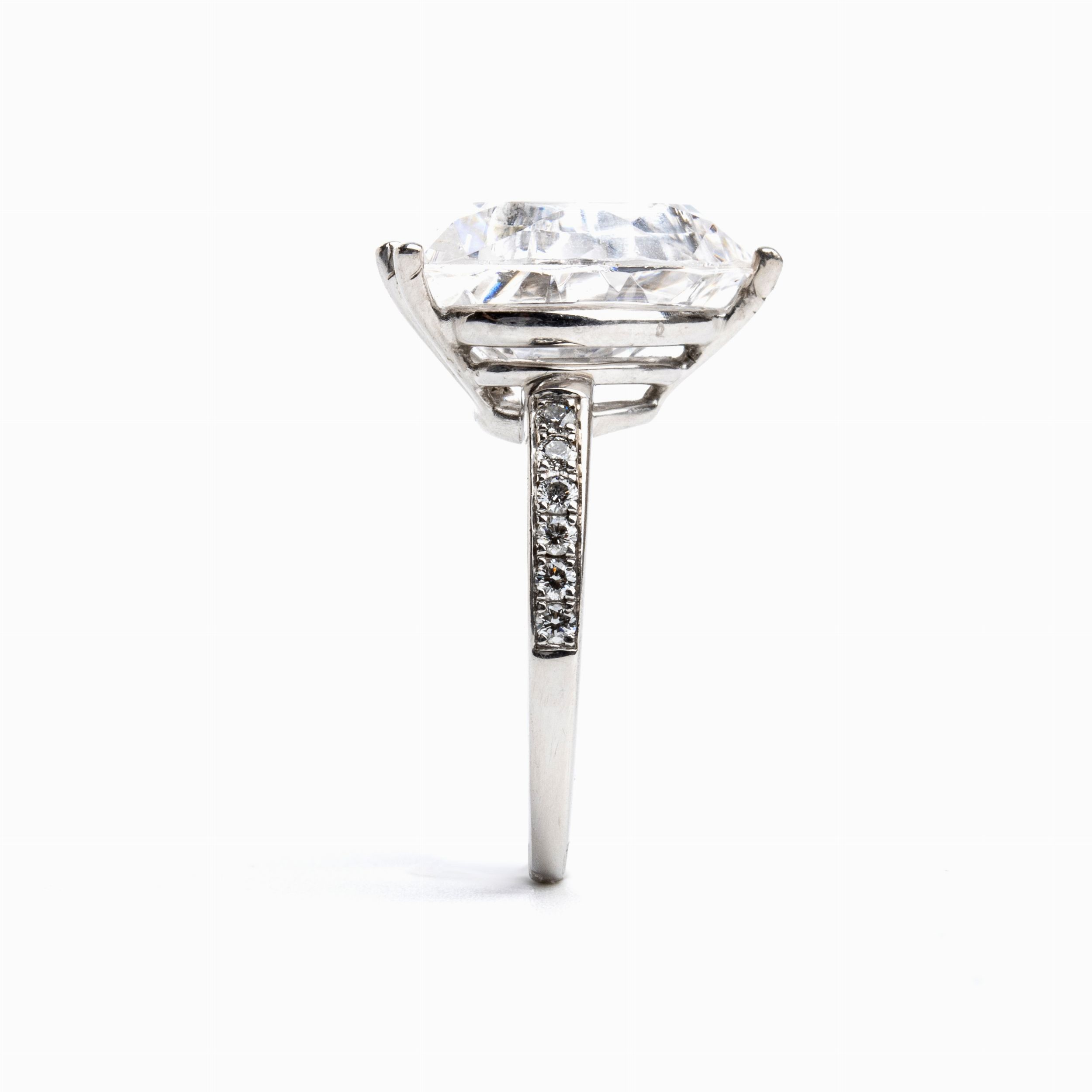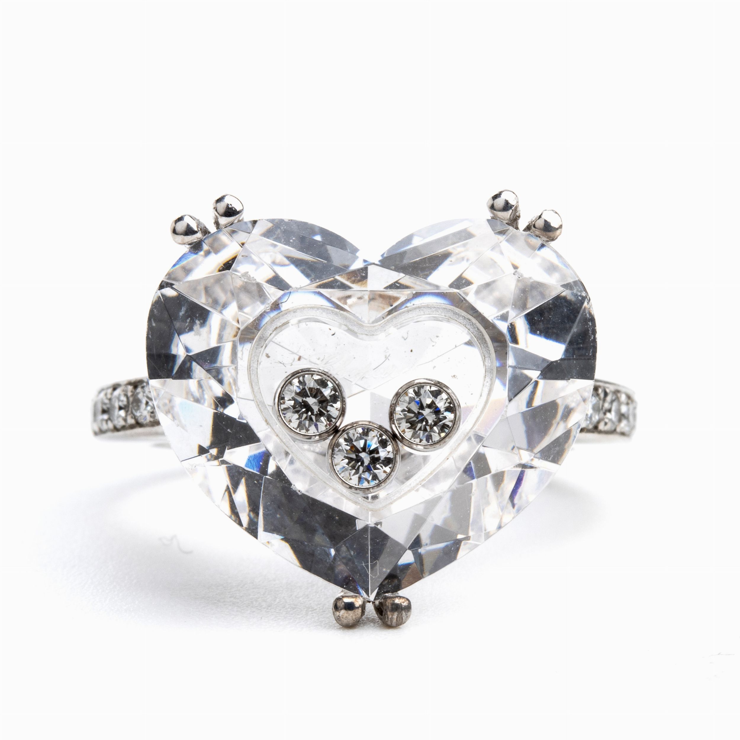 in oro bianco 18k, con tre diamanti mobili tra due vetri zaffiro, lati della montatura decorati con file di diamanti taglio brillante, per 0.12 ct circa. Firmato CHOPARD. Punzonato '750 - 82/6234/06 - 6091952'. Misura IT 10 - Misura US 5 1/2. Peso 8,2 gr. Stato di conservazione: **** buono.