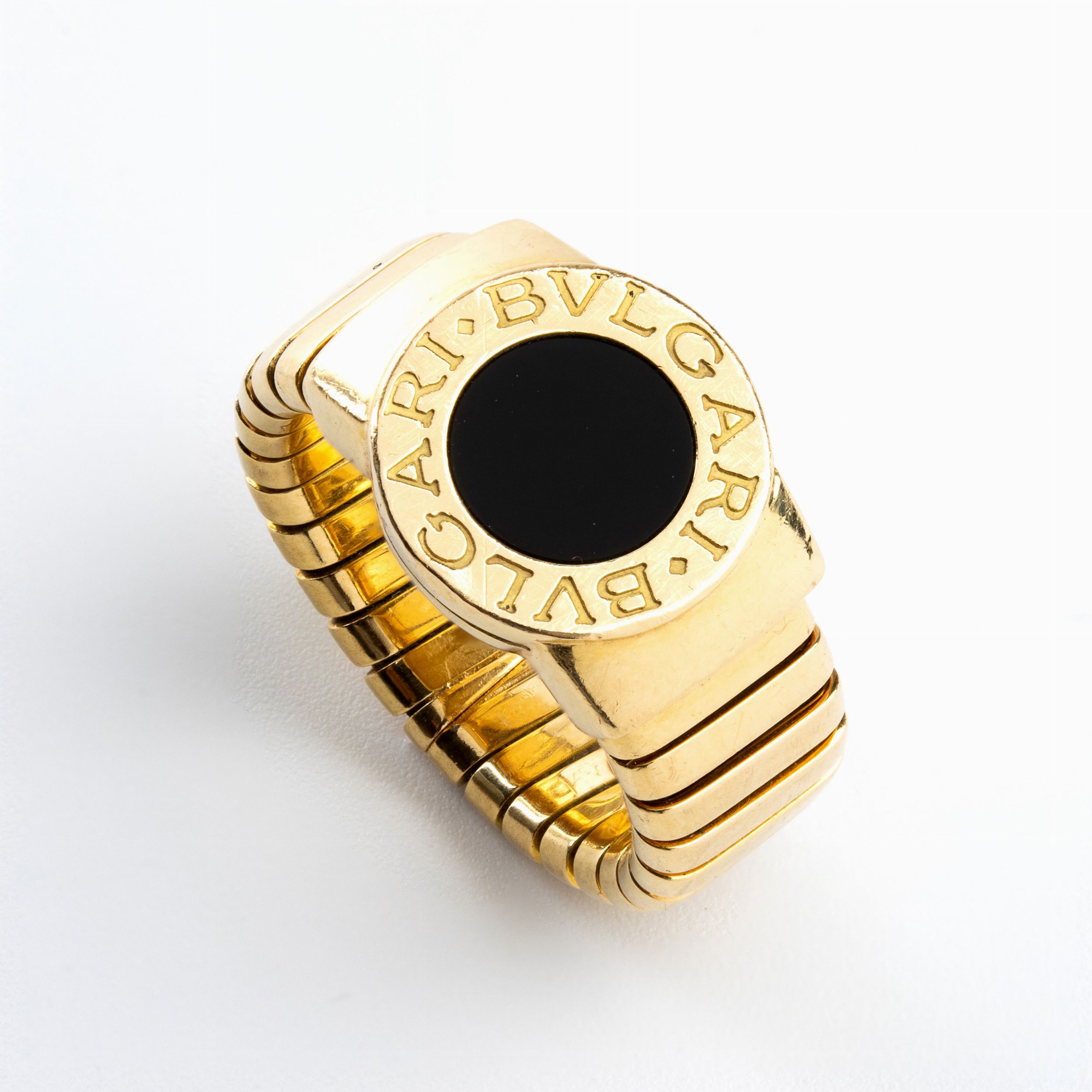 in oro giallo 18k, incastonato con lastra di onice. Firmato BVLGARI. Punzonato '750 - 2337 AL - MADE IN ITALY'. Misura IT 16 - Misura US 8. Peso 18 gr. Stato di conservazione: **** buono.