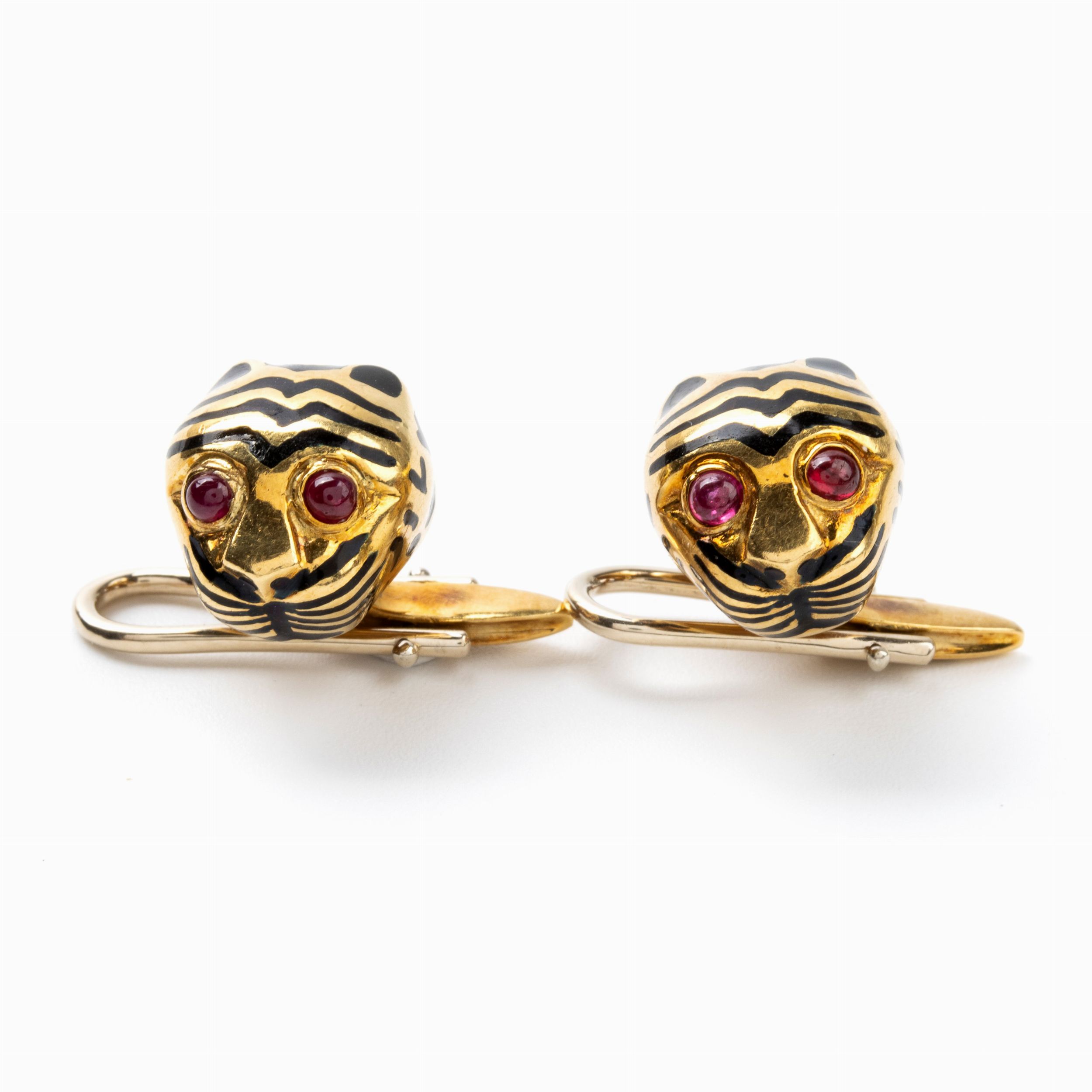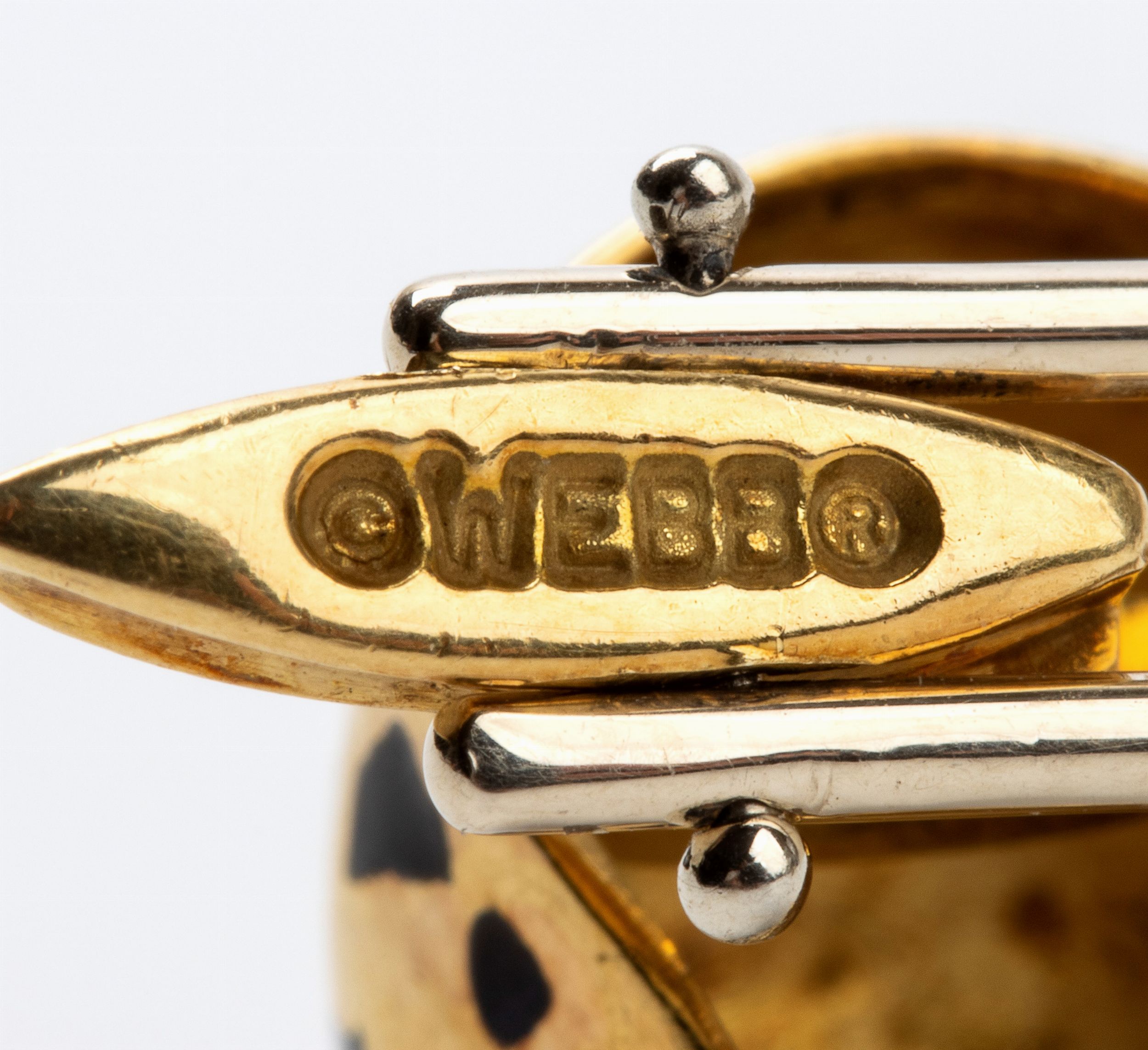ciascuno raffigurante una testa di pantera con applicazione di smalti ed occhi in piccoli rubini.  Punzonati 'Webb ®'. Peso: 10.7 gr.  Stato di conservazione: ***** eccellente.