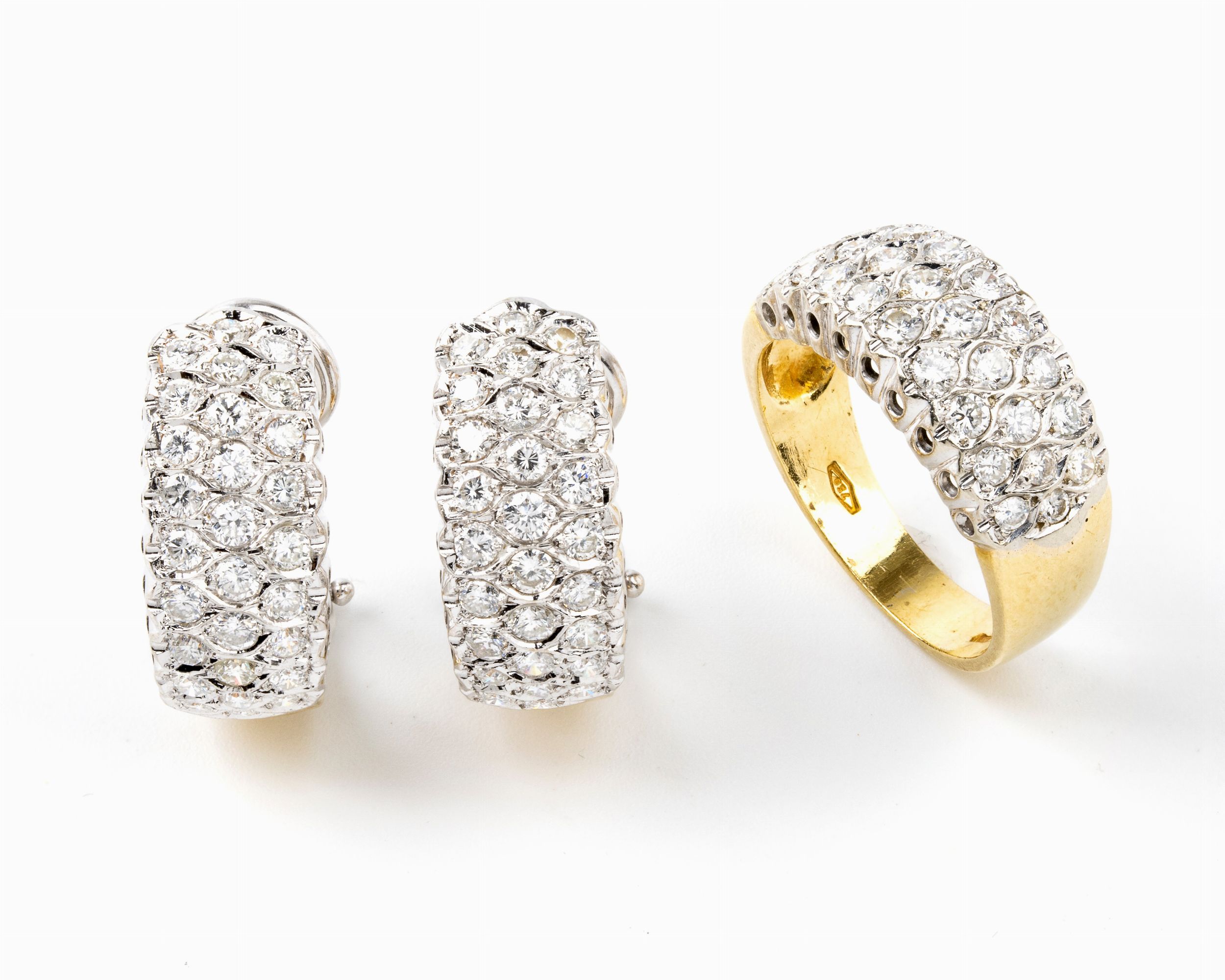 Demi parure composta da un paio di orecchini ed un anello in oro e diamanti