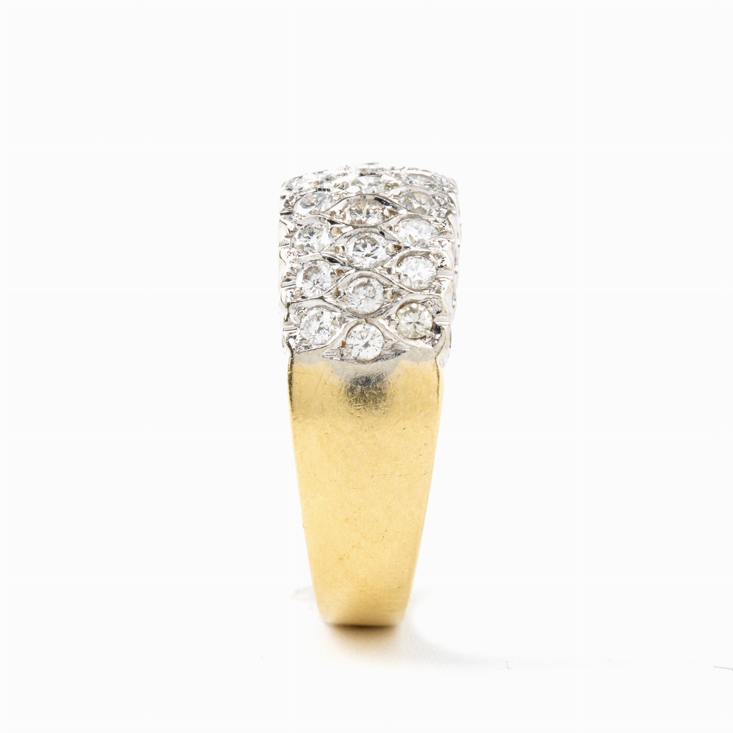 oro giallo ed oro bianco 18k, incastonati con n. 84 diamanti di forma rotonda, taglio brillante per circa 3.20 ct totali, F-H, VVS-VS. Punzonati '750 - 475 NA'. Misura IT 15 1/2 - Misura US 7 1/4. Lunghezza orecchini: 2,5 cm. Peso: 16,3 gr. Stato di conservazione: **** buono.