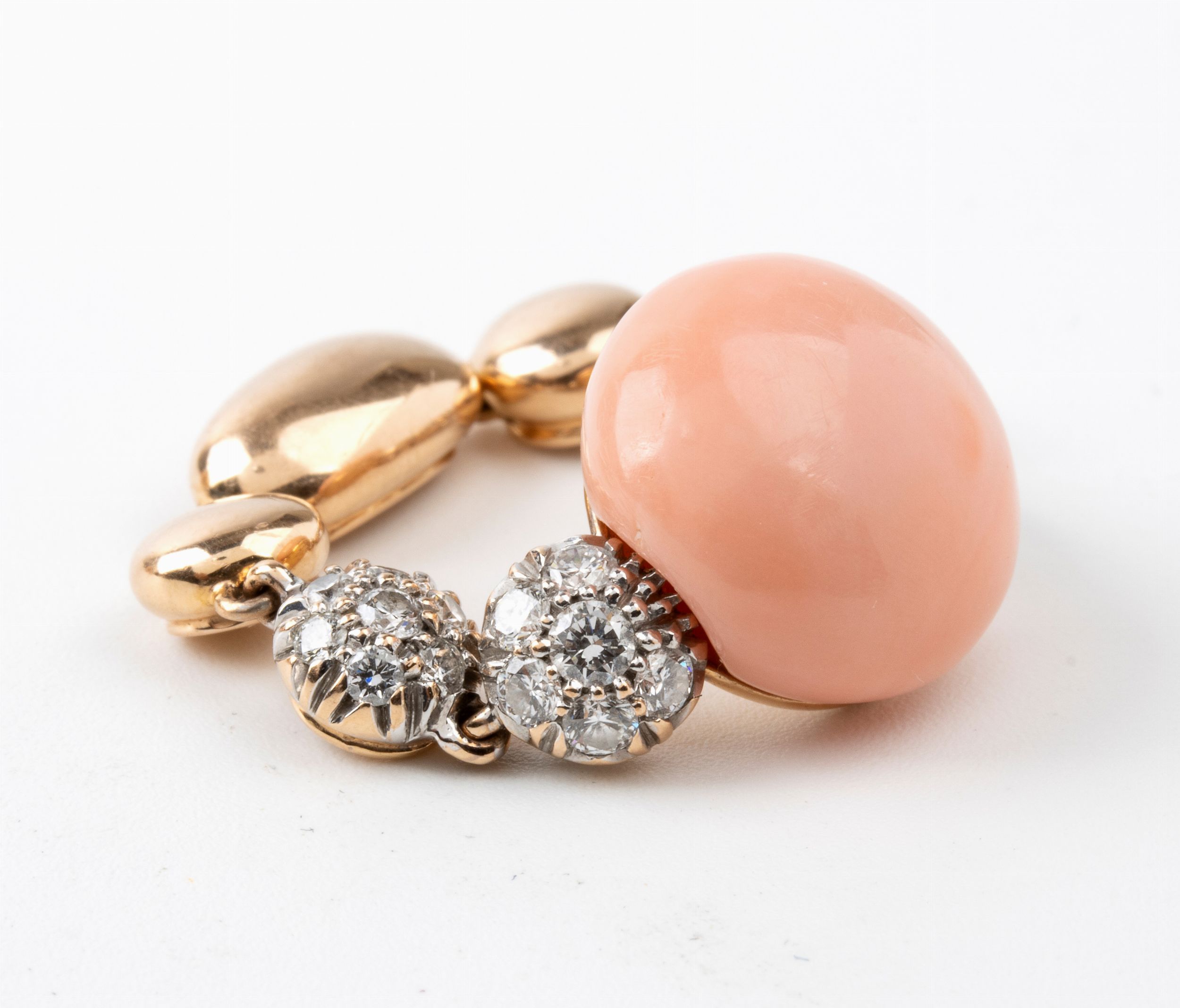 in oro giallo 18k, ciascuno con cabochon di corallo rosa pelle d'angelo (corallium secundum) affiancato da pavé di diamanti. Firmato CHANTELER Capri. N. 40 diamanti di forma rotonda, taglio brillante, circa 0.60 ct, F-G, VVS-VS. Punzonati '750 - 18kt - 1059 NA -2'. Misura IT 15 - Misura US 7. Lunghezza orecchini: 1,6 cm. Peso complessivo: 17.6 gr. Stato di conservazione: **** buono.